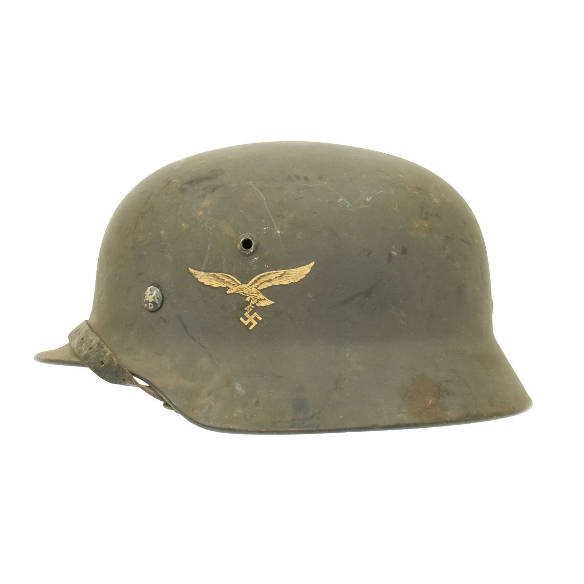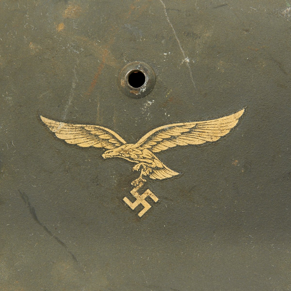 Original Item: Only One Available. This is an incredible crisp near unissued all original example. This stamped sheet steel construction helmet retains 99% of the original paint and is in truly excellent condition overall. The left side of the helmet features a crisp Luftwaffe eagle decal. The decal is retained at 99%.