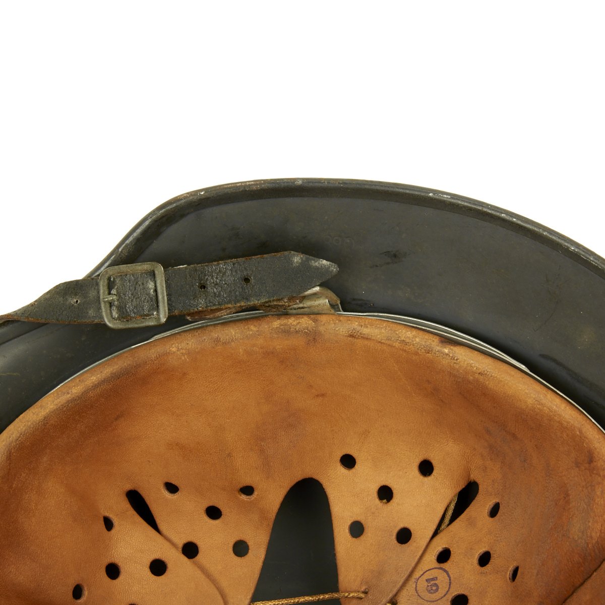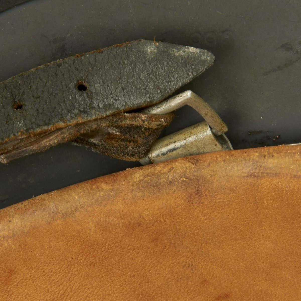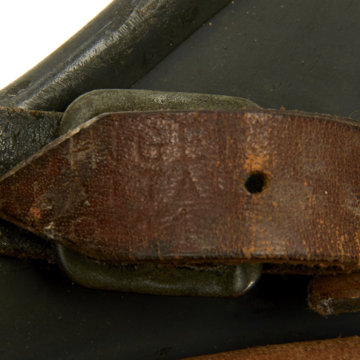 On the reverse of the shell's interior, the neck guard apron is lot number stamped, 21705 and the interior, left side, apron has a stamped manufacturer's code and size, Q68 indicating that indicating manufacture by Quist in Esslingen, Germany in a massive size 68. Size 68 is among the largest sizes made during WW2 and can accommodate liners from 61cm to 63cm or US 7 5/8 to 8. Size 68 shells are incredibly difficul to find and are therefore more valuable to a collector. The original ink dome stamp can also be seen inside the interior crown of the helmet. Original chinstrap is present and in excellent condition it is maker marked and dated 1941.