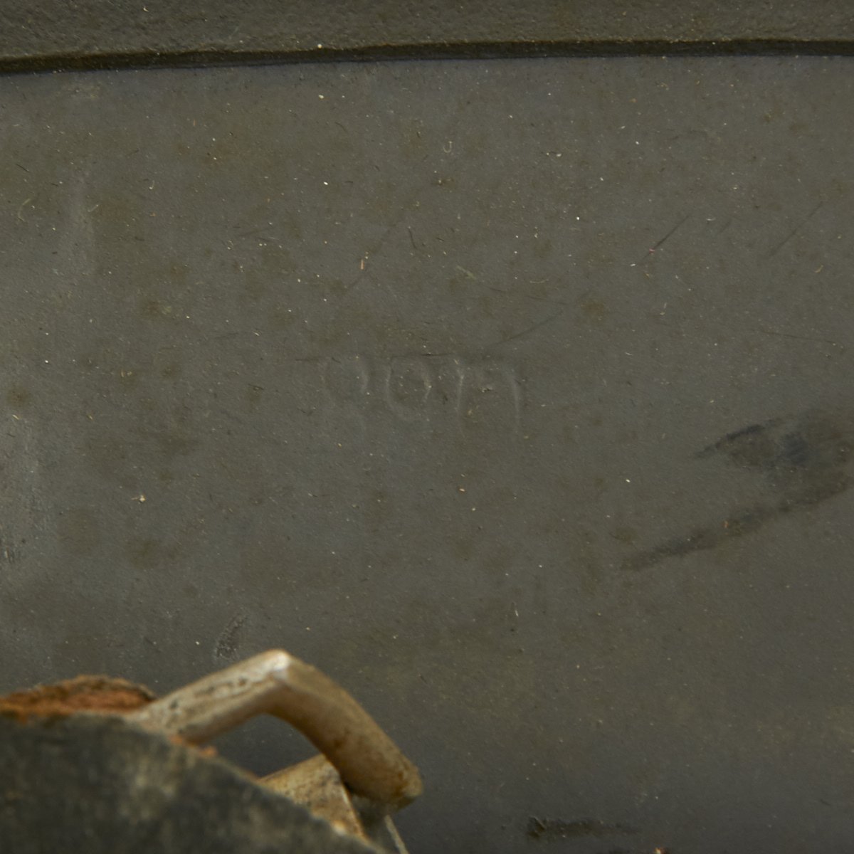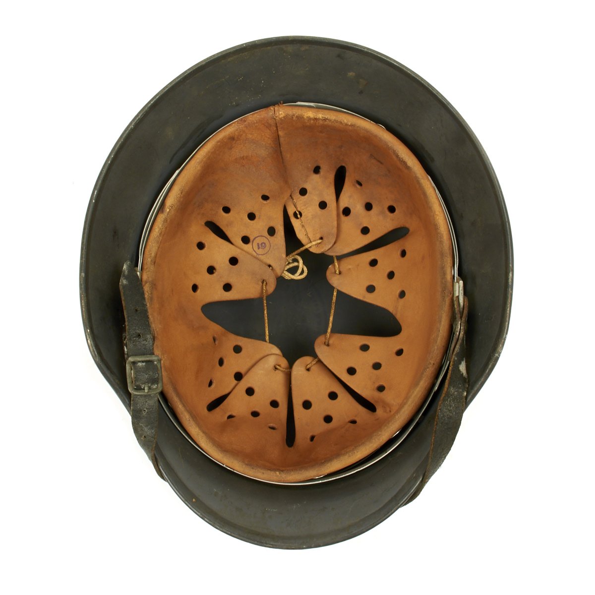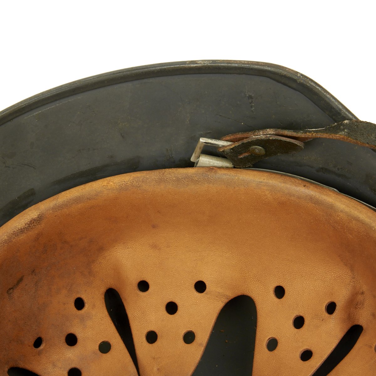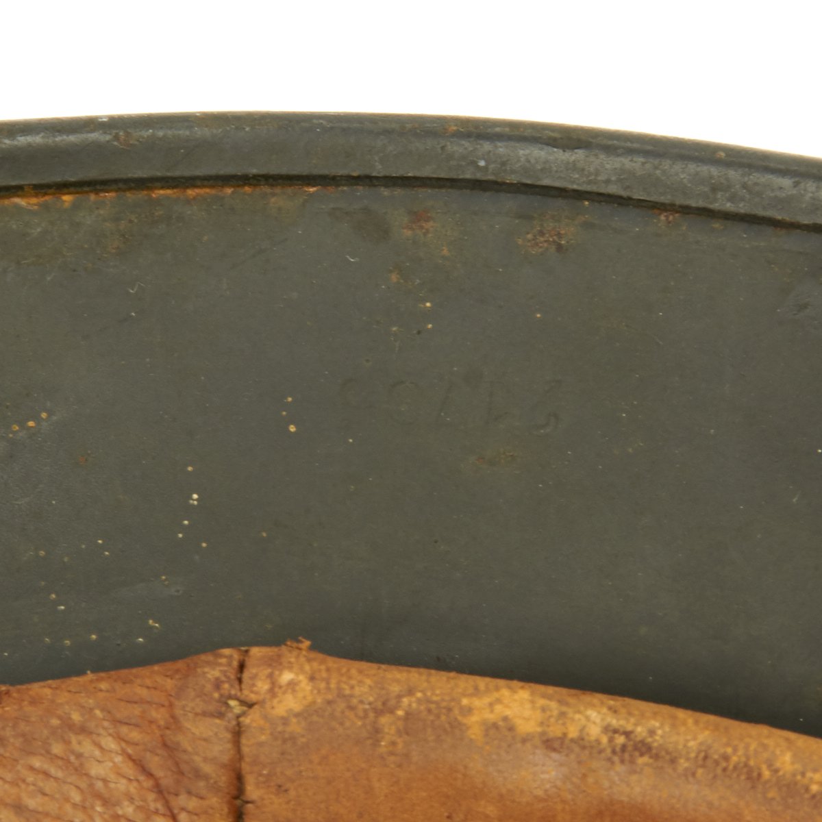On the reverse of the shell's interior, the neck guard apron is lot number stamped, 21705 and the interior, left side, apron has a stamped manufacturer's code and size, Q68 indicating that indicating manufacture by Quist in Esslingen, Germany in a massive size 68. Size 68 is among the largest sizes made during WW2 and can accommodate liners from 61cm to 63cm or US 7 5/8 to 8. Size 68 shells are incredibly difficul to find and are therefore more valuable to a collector. The original ink dome stamp can also be seen inside the interior crown of the helmet. Original chinstrap is present and in excellent condition it is maker marked and dated 1941.