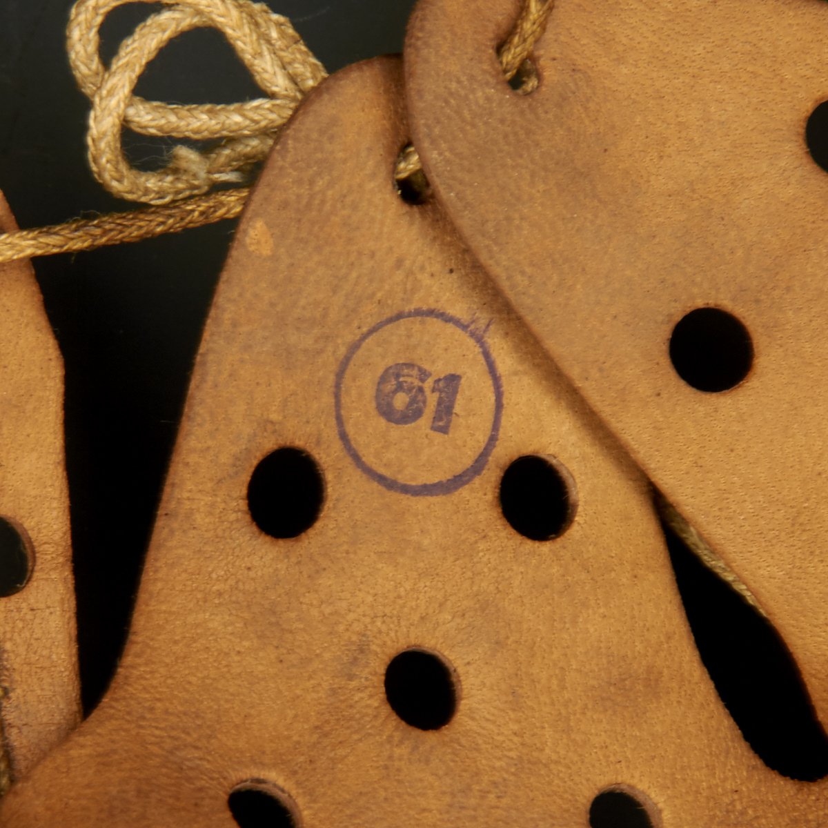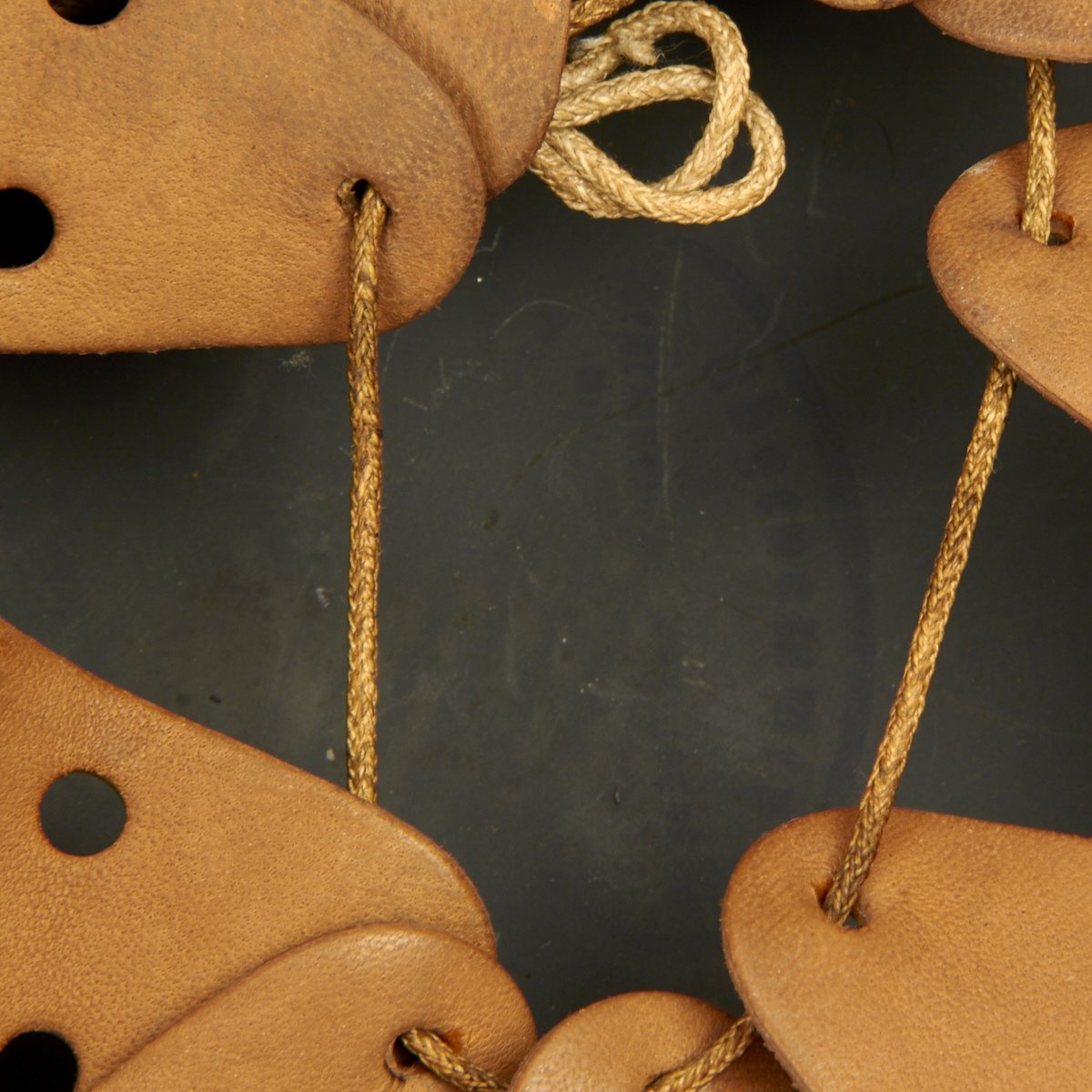 All three liner retaining pins are intact. The interior of the helmet still has the original nearly unissued M31 leather liner with all eight of its fingers intact and is stamped as a huge size 61. The liner retains the original size adjustment string. The liner is soft and supple.