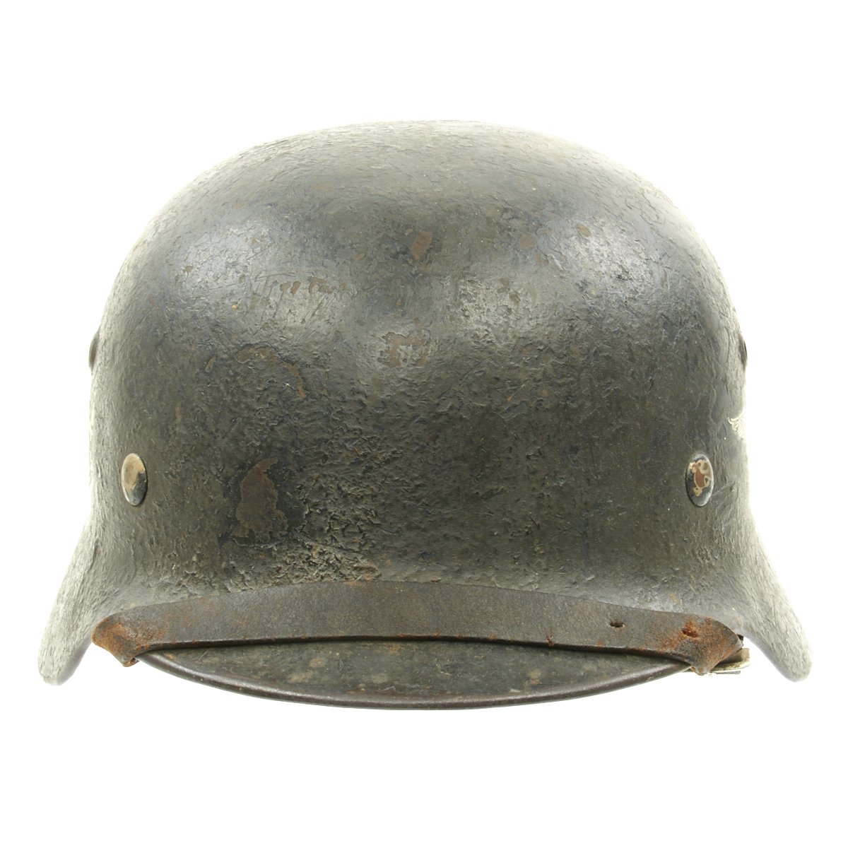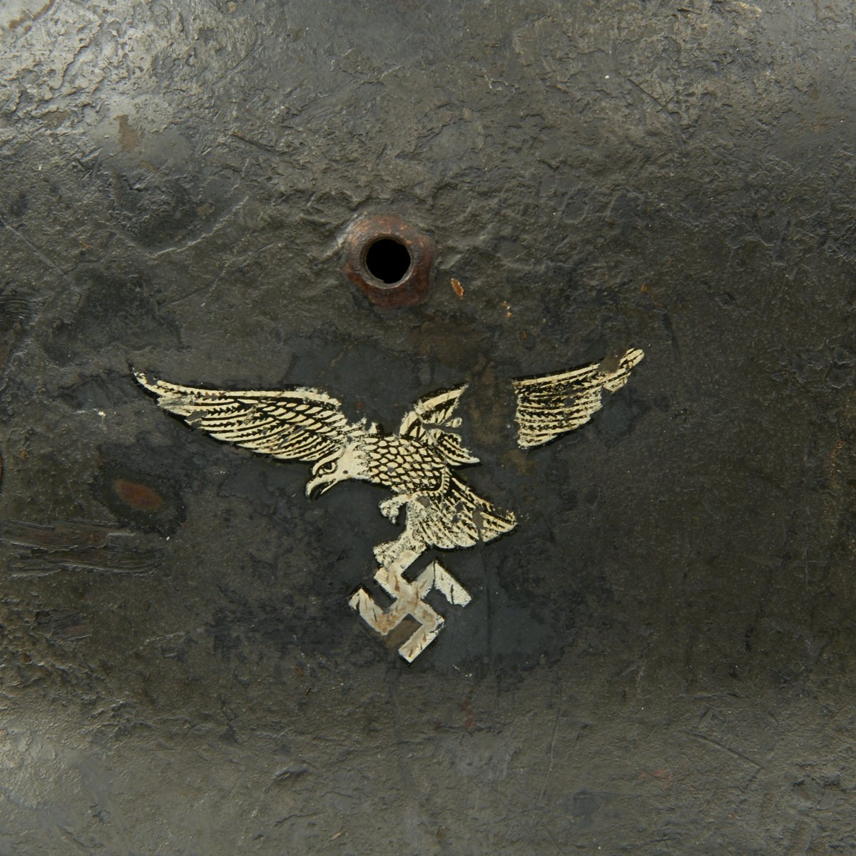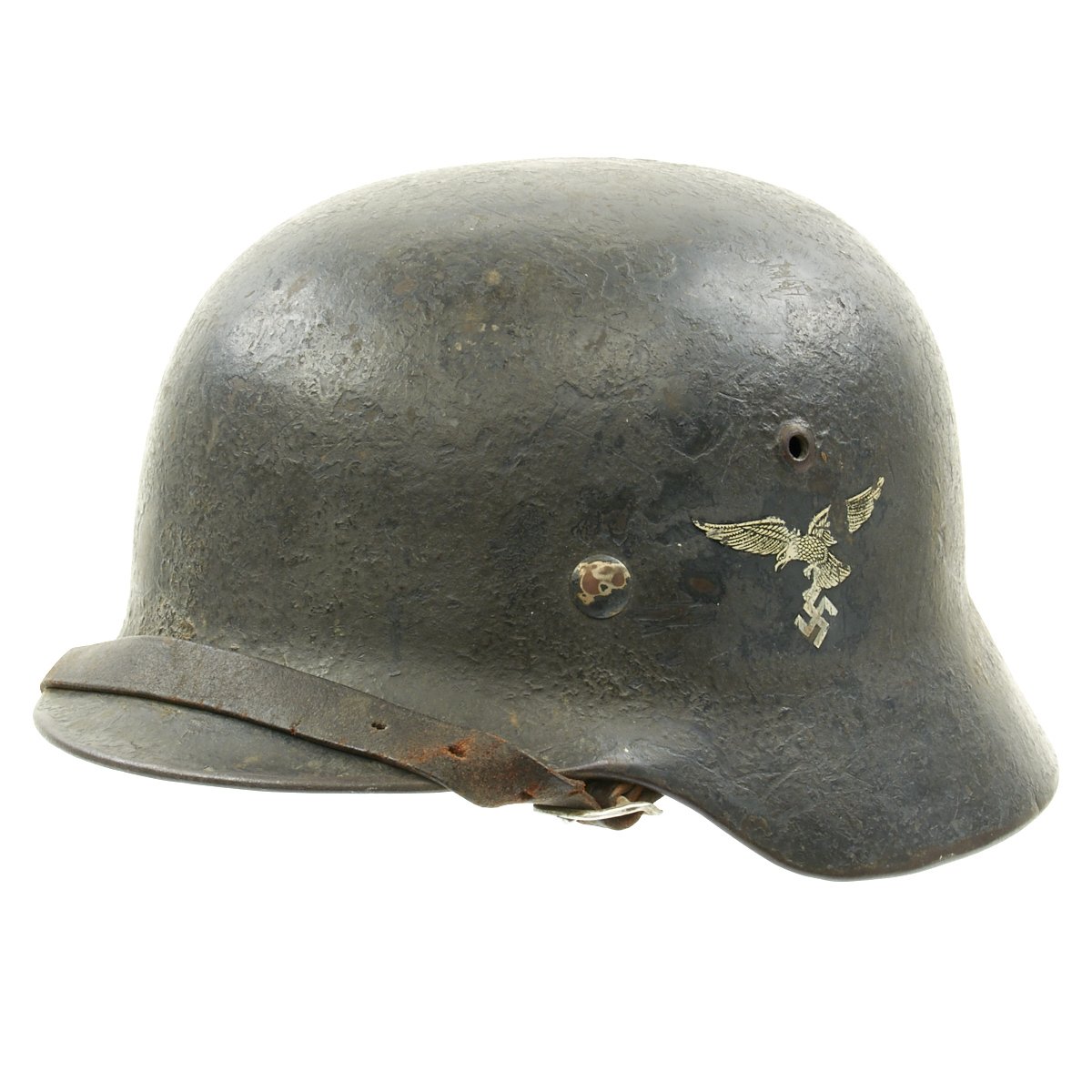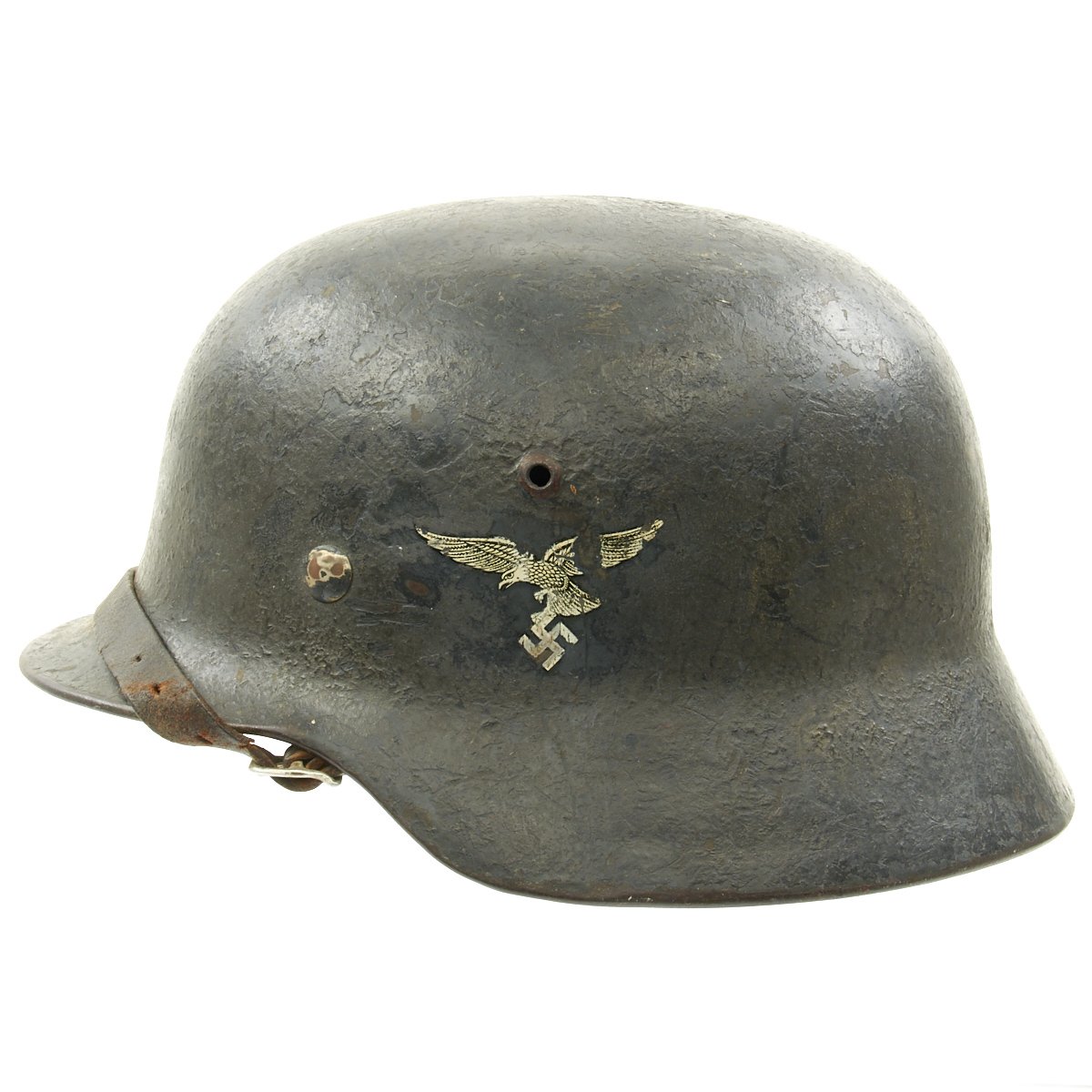Original Item: Only One Available. This is a nice all original example Model 1935 German WW2 "double decal" helmet with an early "Droop-Tail" Luftwaffe Eagle decal on the left side, and a "National Colors" decal on the right. This stamped sheet steel construction helmet retains around 80% of the original Luftwaffe gray-blue paint and is in good condition overall. It was definitely field repainted once, maybe even twice, as there are at least two layers of paint on it. This is a helmet with a long service history, just like we like to see them.