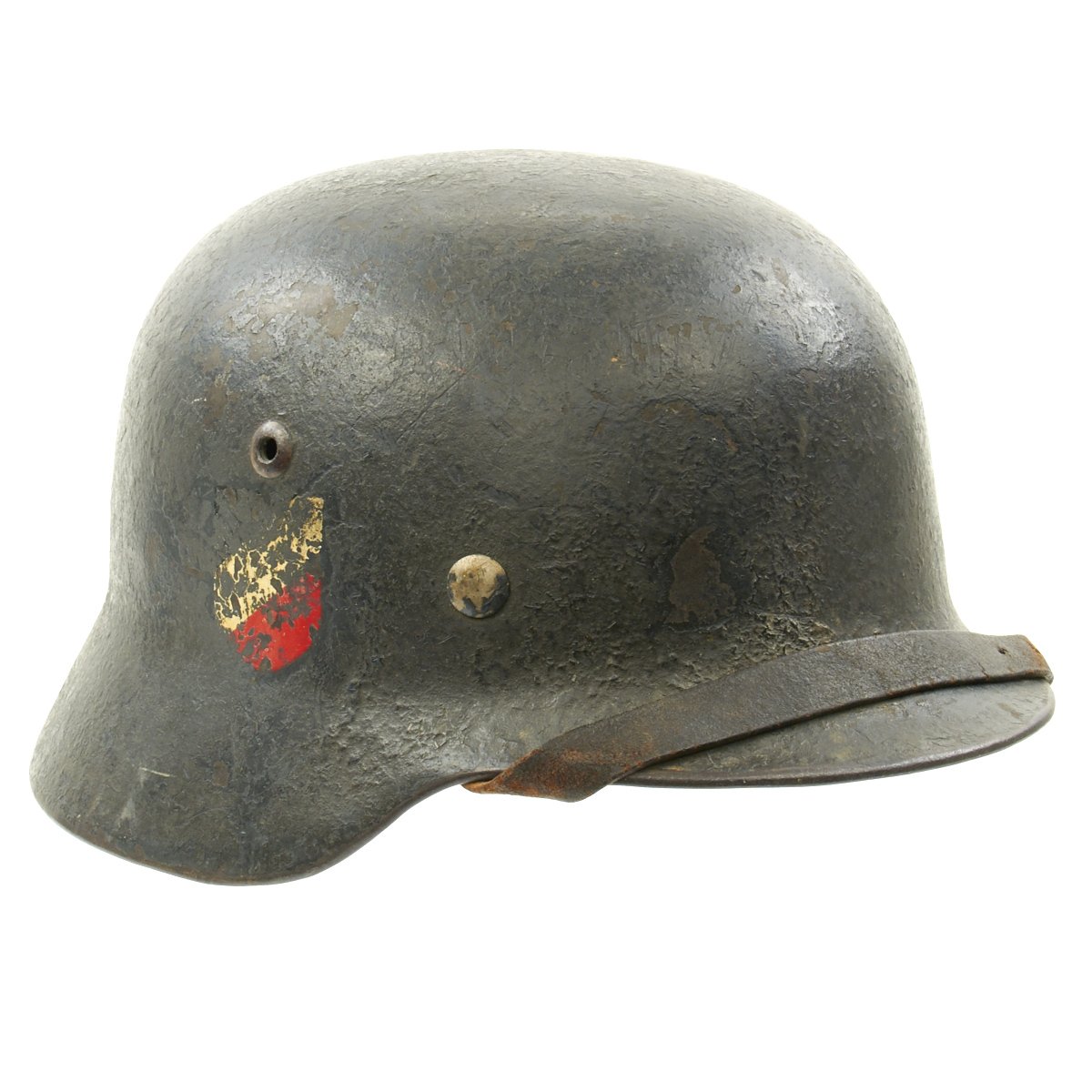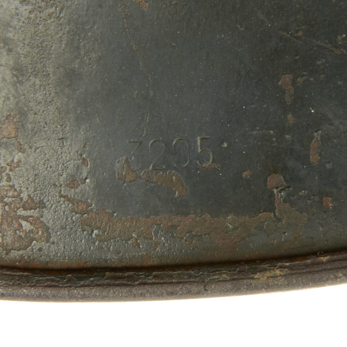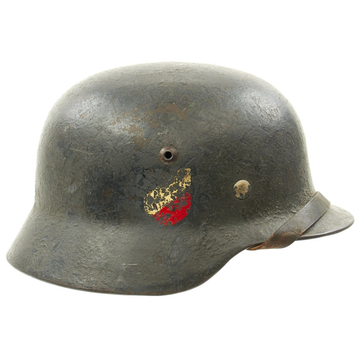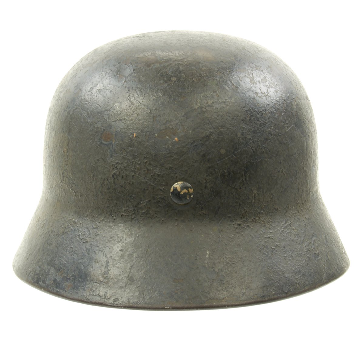 Original Item: Only One Available. This is a nice all original example Model 1935 German WW2 "double decal" helmet with an early "Droop-Tail" Luftwaffe Eagle decal on the left side, and a "National Colors" decal on the right. This stamped sheet steel construction helmet retains around 80% of the original Luftwaffe gray-blue paint and is in good condition overall. It was definitely field repainted once, maybe even twice, as there are at least two layers of paint on it. This is a helmet with a long service history, just like we like to see them.