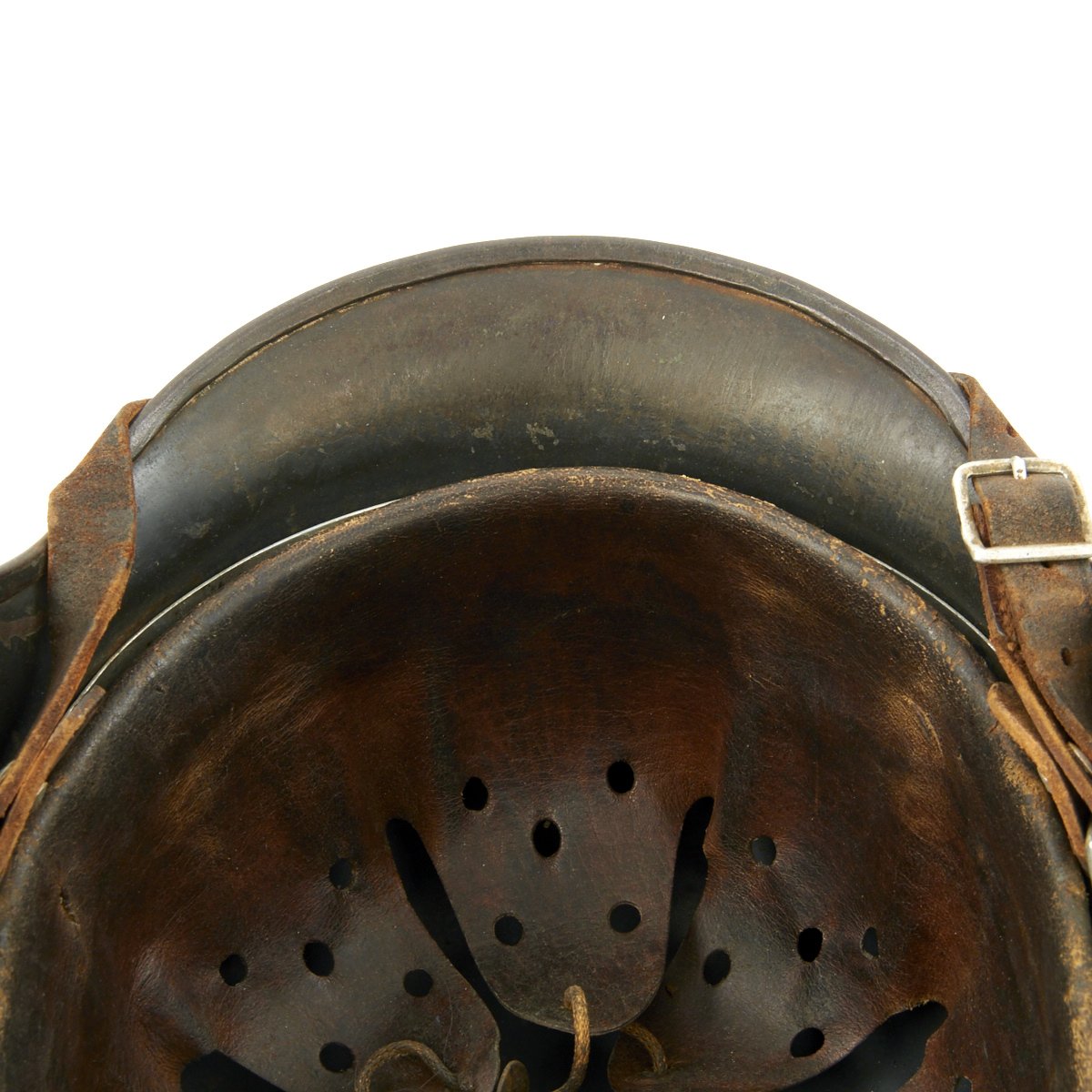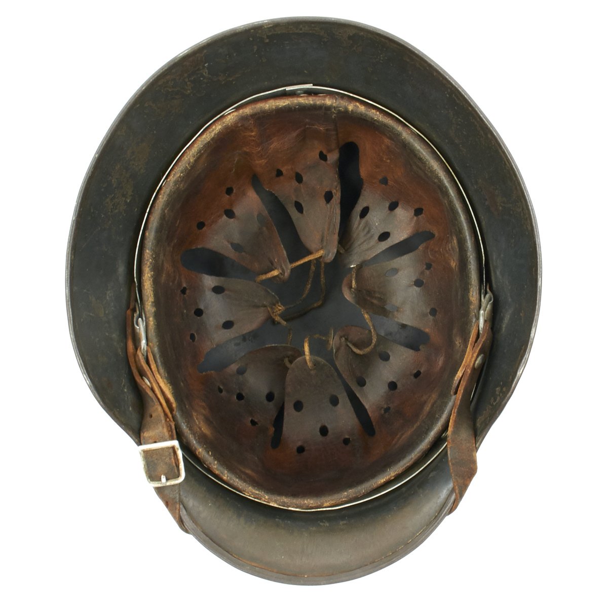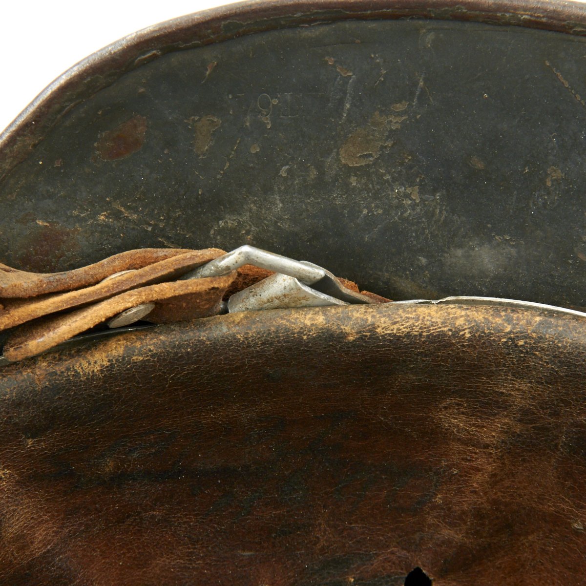 The helmet still has its correct good condition M31 liner with all of the 8 fingers intact, though it is dark brown from wear, so the size cannot be read. However, the liner band is marked 64 n.A / 57, indicating a size 57 liner. The liner still has its original leather size adjustment string. The liner band is aluminum, correct for a helmet of this vintage. The chinstrap is present, and is in very good condition, still supple, with some wear and staining from use and age.