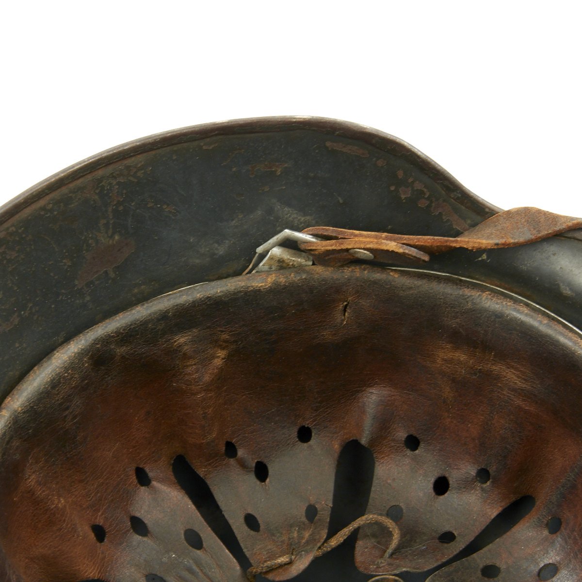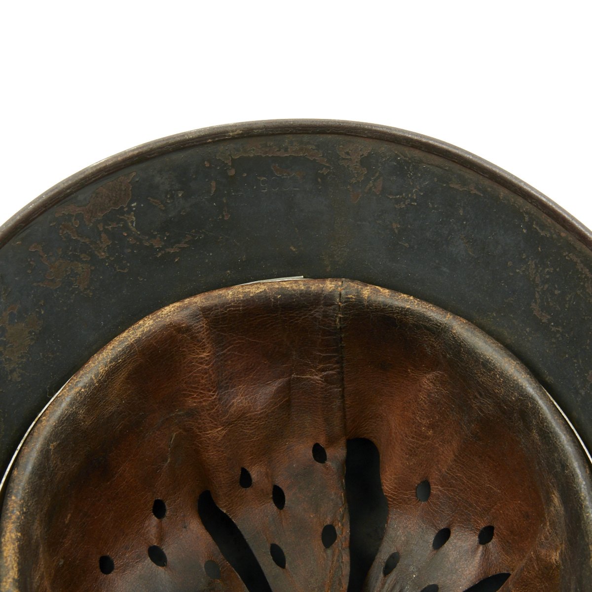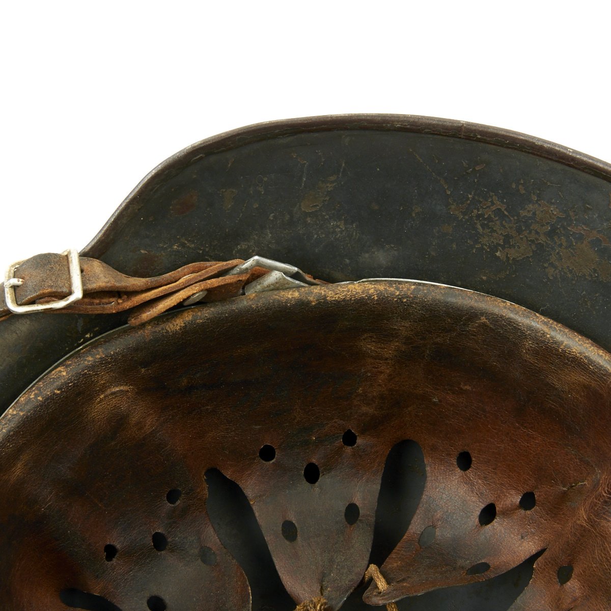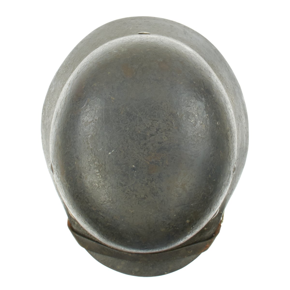 The helmet still has its correct good condition M31 liner with all of the 8 fingers intact, though it is dark brown from wear, so the size cannot be read. However, the liner band is marked 64 n.A / 57, indicating a size 57 liner. The liner still has its original leather size adjustment string. The liner band is aluminum, correct for a helmet of this vintage. The chinstrap is present, and is in very good condition, still supple, with some wear and staining from use and age.