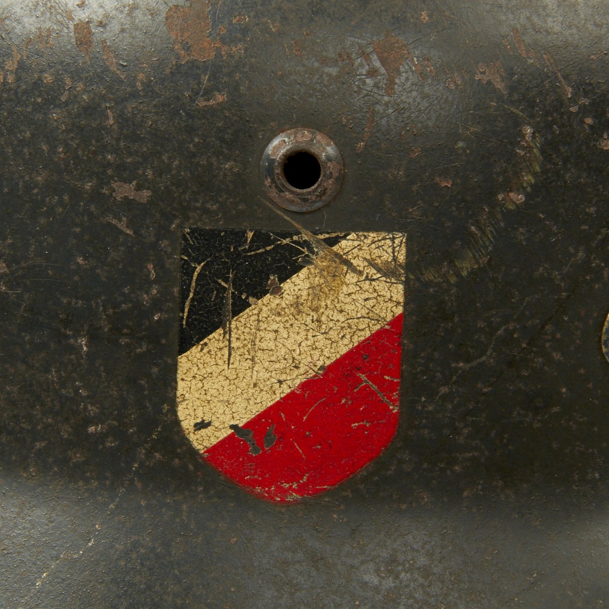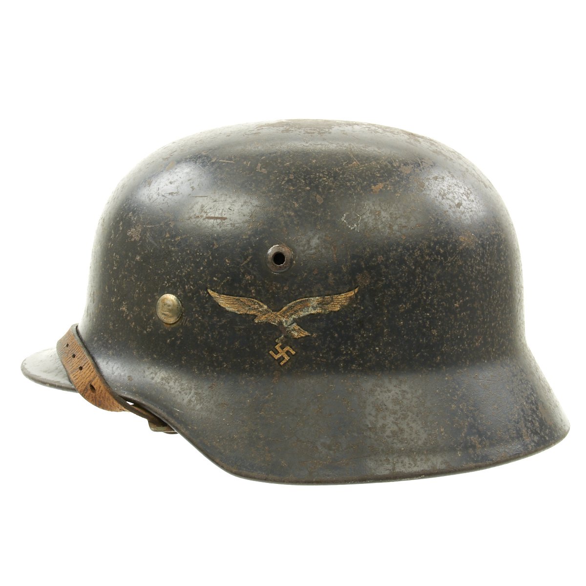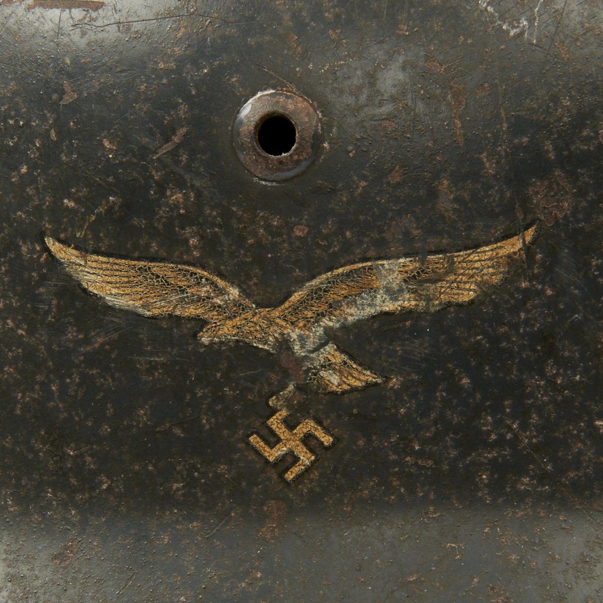 Original Item: Only One Available. This is a very nice all original example Model 1935 German WW2 "double decal" helmet with a Luftwaffe Eagle decal on the left side, and a "National Colors" decal on the right. This stamped sheet steel construction helmet retains 80+% of the original paint and is in good condition overall. The National Colors decal is retained at about 90%, with cracking from age and some wear. The Luftwaffe decal is probably around 80%, with some missing parts and more cracking and age. All three liner retaining pins are intact, though they are worn, and may indicate a field replaced liner.