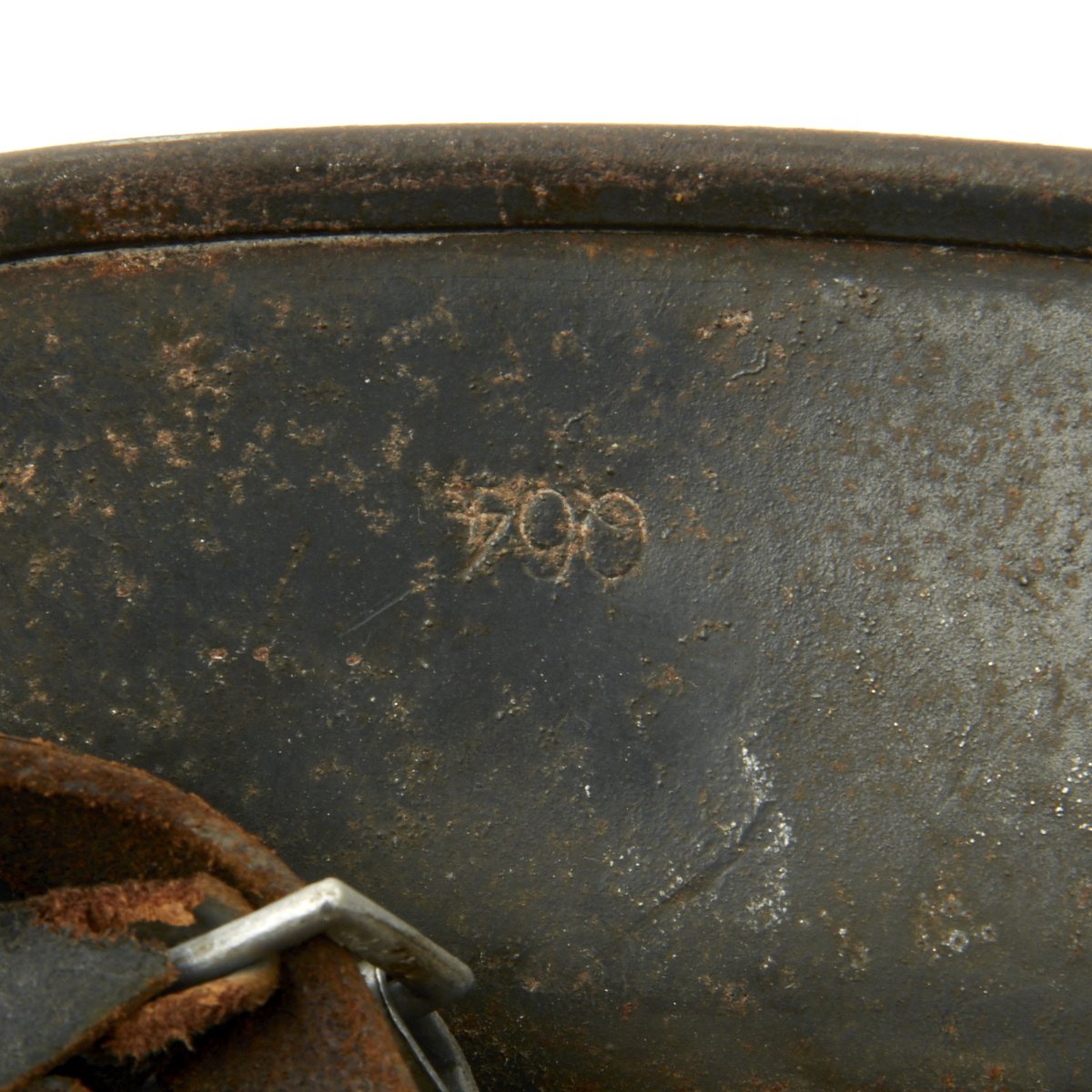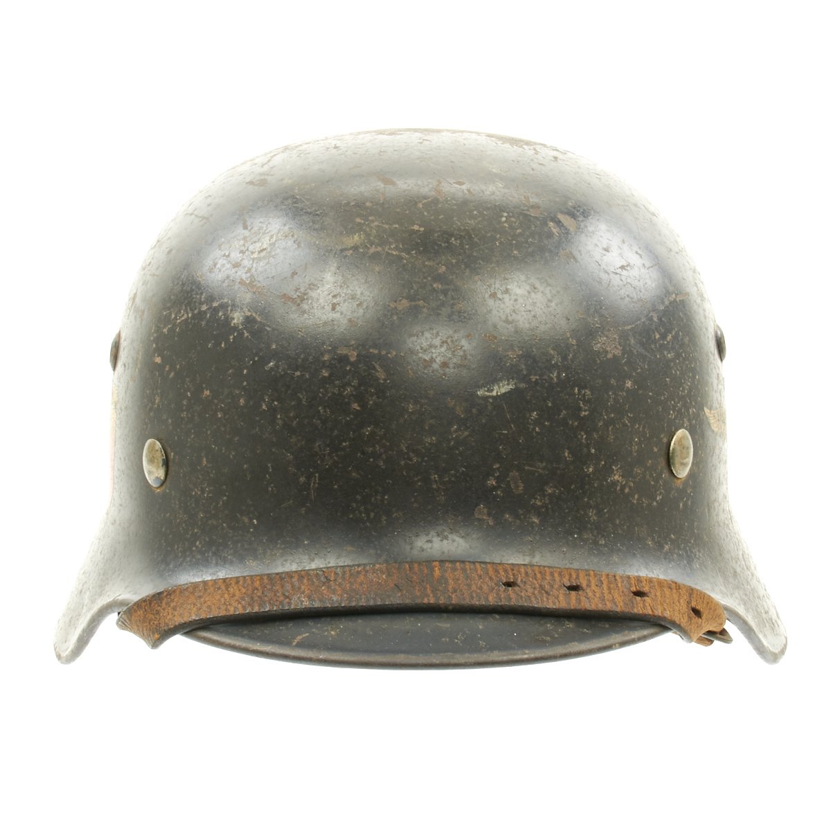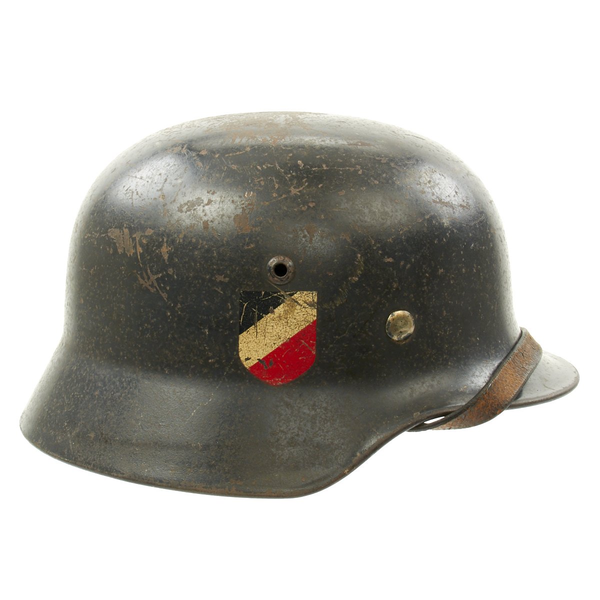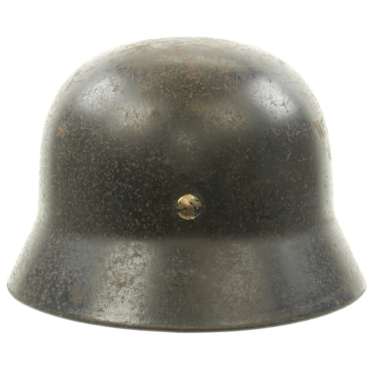 Original Item: Only One Available. This is a very nice all original example Model 1935 German WW2 "double decal" helmet with a Luftwaffe Eagle decal on the left side, and a "National Colors" decal on the right. This stamped sheet steel construction helmet retains 80+% of the original paint and is in good condition overall. The National Colors decal is retained at about 90%, with cracking from age and some wear. The Luftwaffe decal is probably around 80%, with some missing parts and more cracking and age. All three liner retaining pins are intact, though they are worn, and may indicate a field replaced liner.