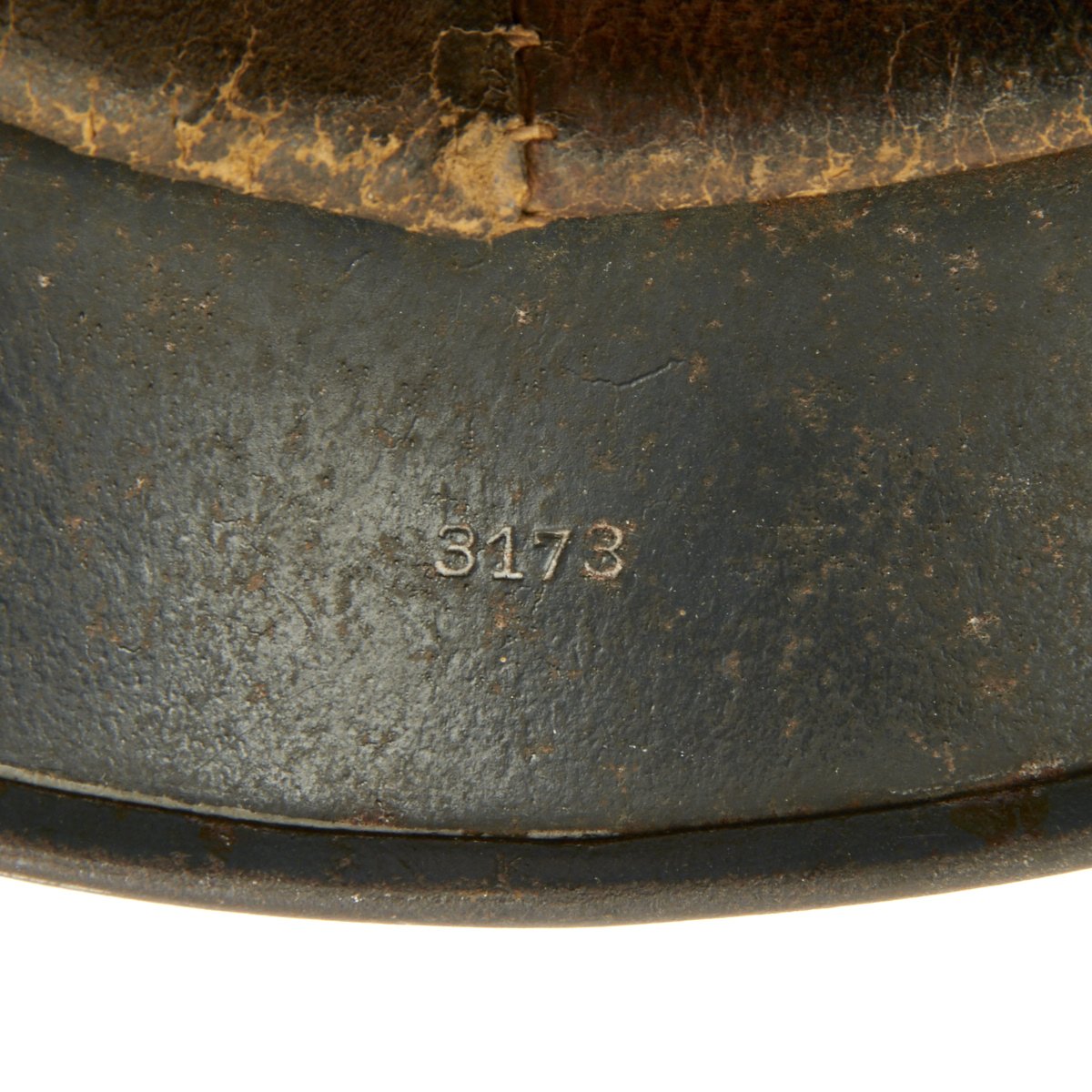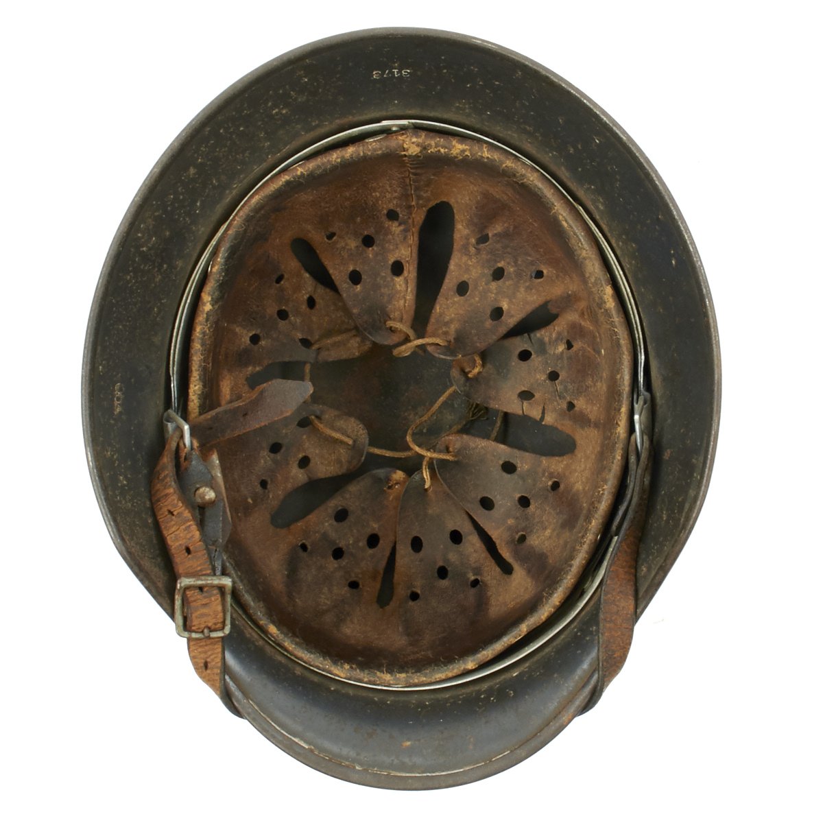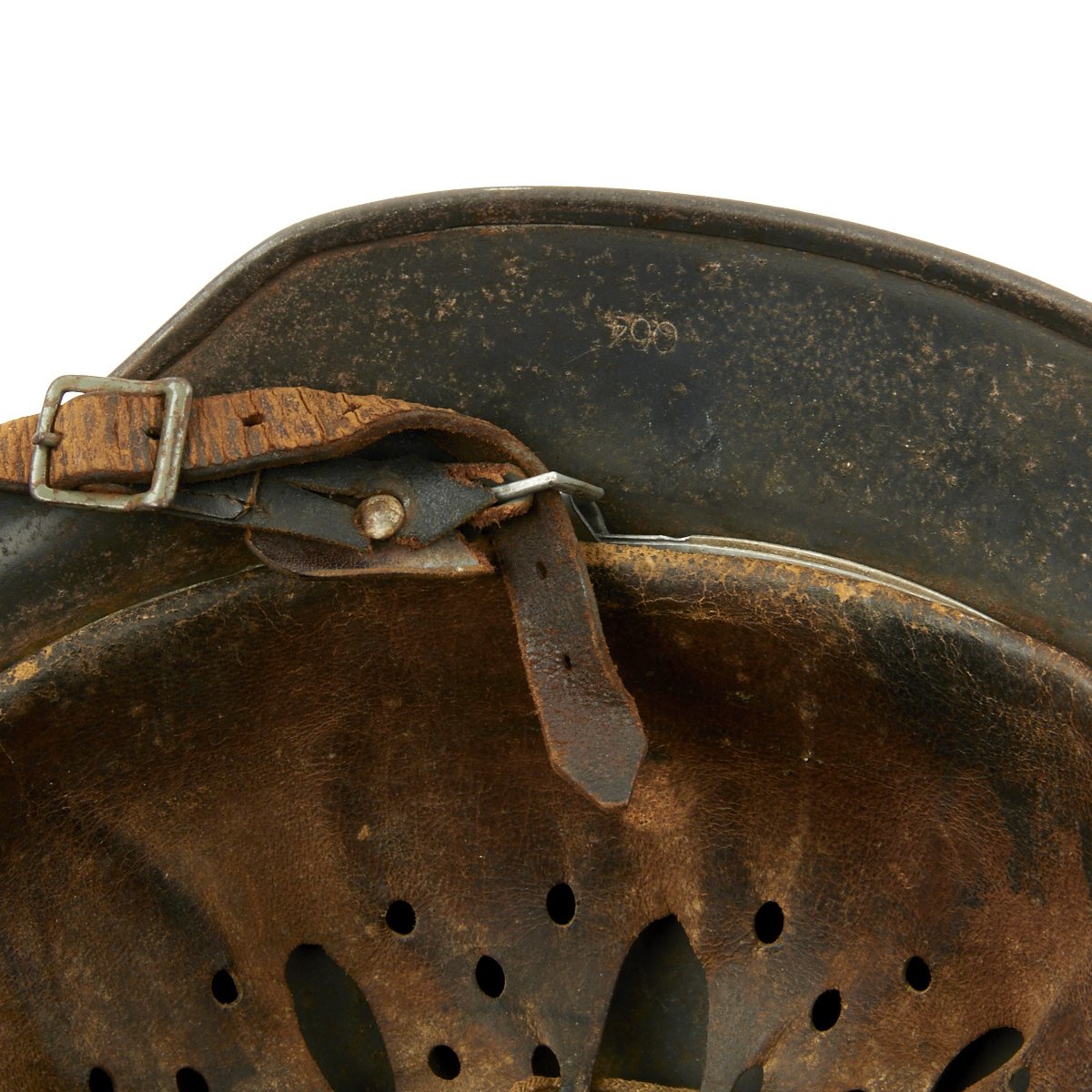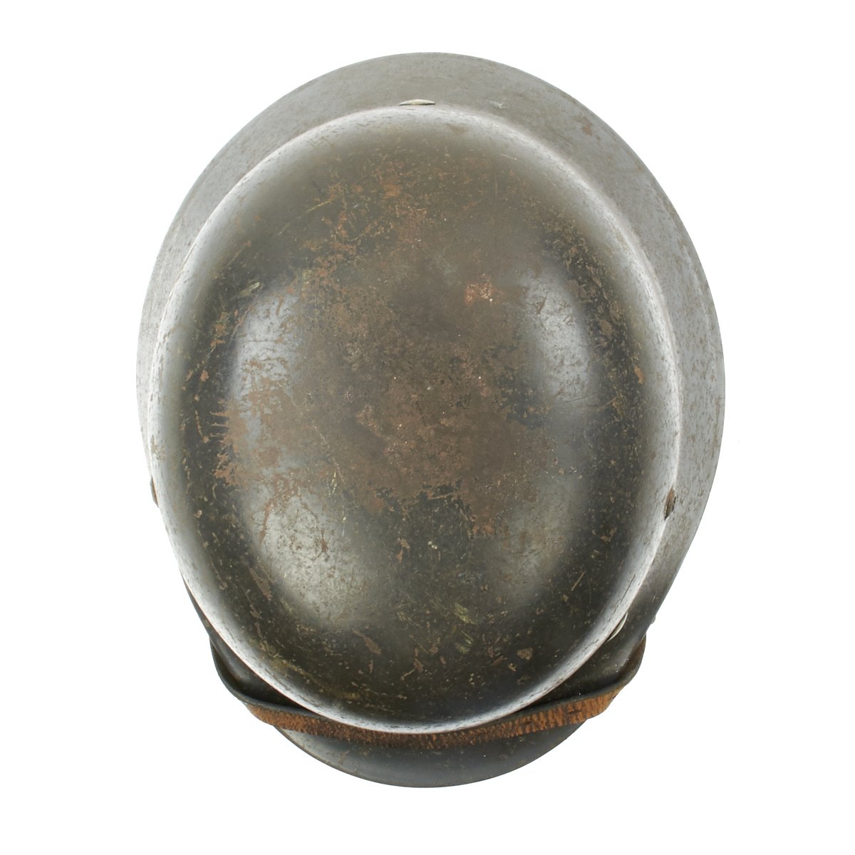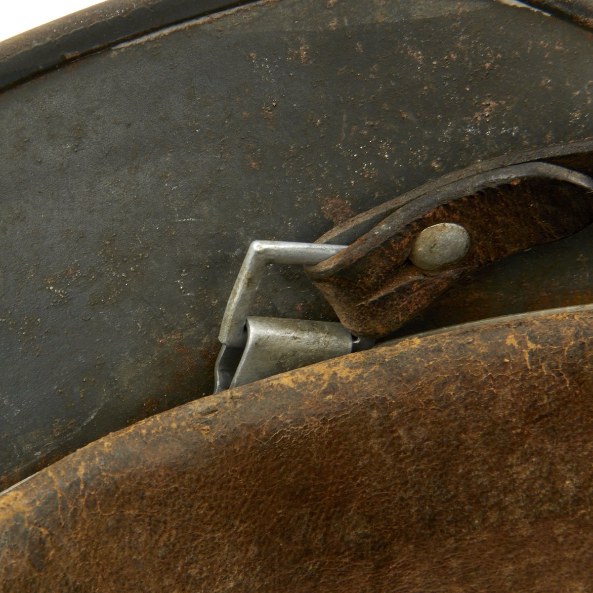 The helmet still has its correct excellent condition M31 liner with all of the 8 fingers intact. The liner still has its original leather size adjustment string. The liner band is the stamped aluminum type seen on early war helmets. The chinstrap is present , though it is worn and cracked, definitely showing age and use.