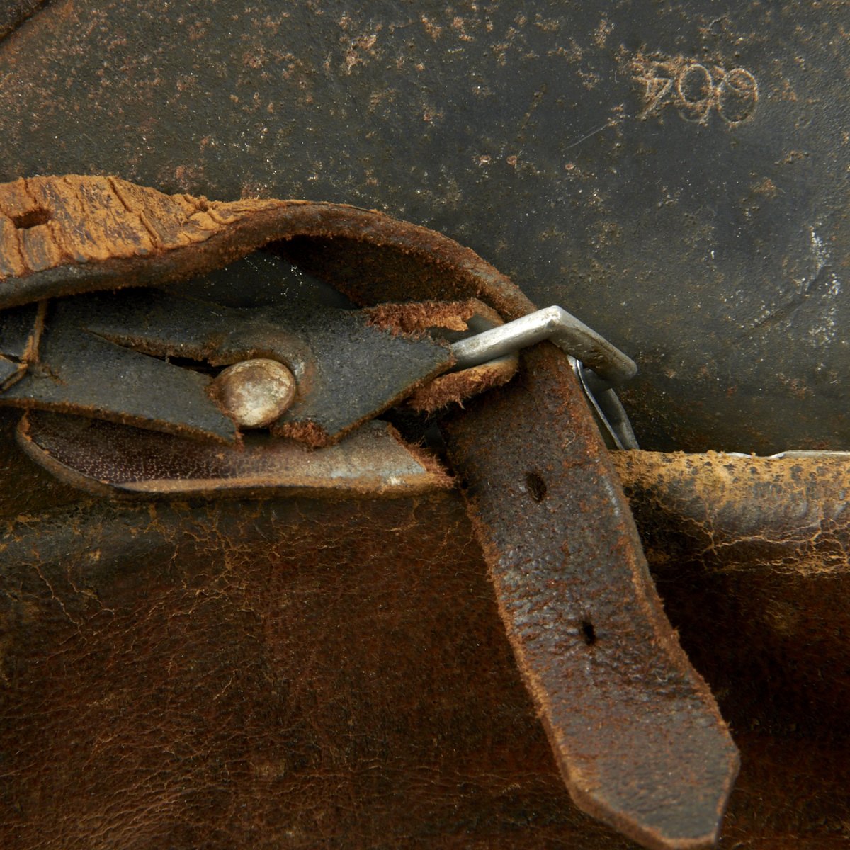 The reverse, interior, neck guard apron is serial number stamped 3173 and the interior, left side, apron has the stamped manufacturer's code and size, Q64 indicating that Quist in Esslingen, Germany manufactured it. Size 64 is a nice medium size that can accommodate liners from 56cm to 58cm or US 7 to 7 1/4. Size 64 shells are harder to find and are therefore more valuable to a collector.