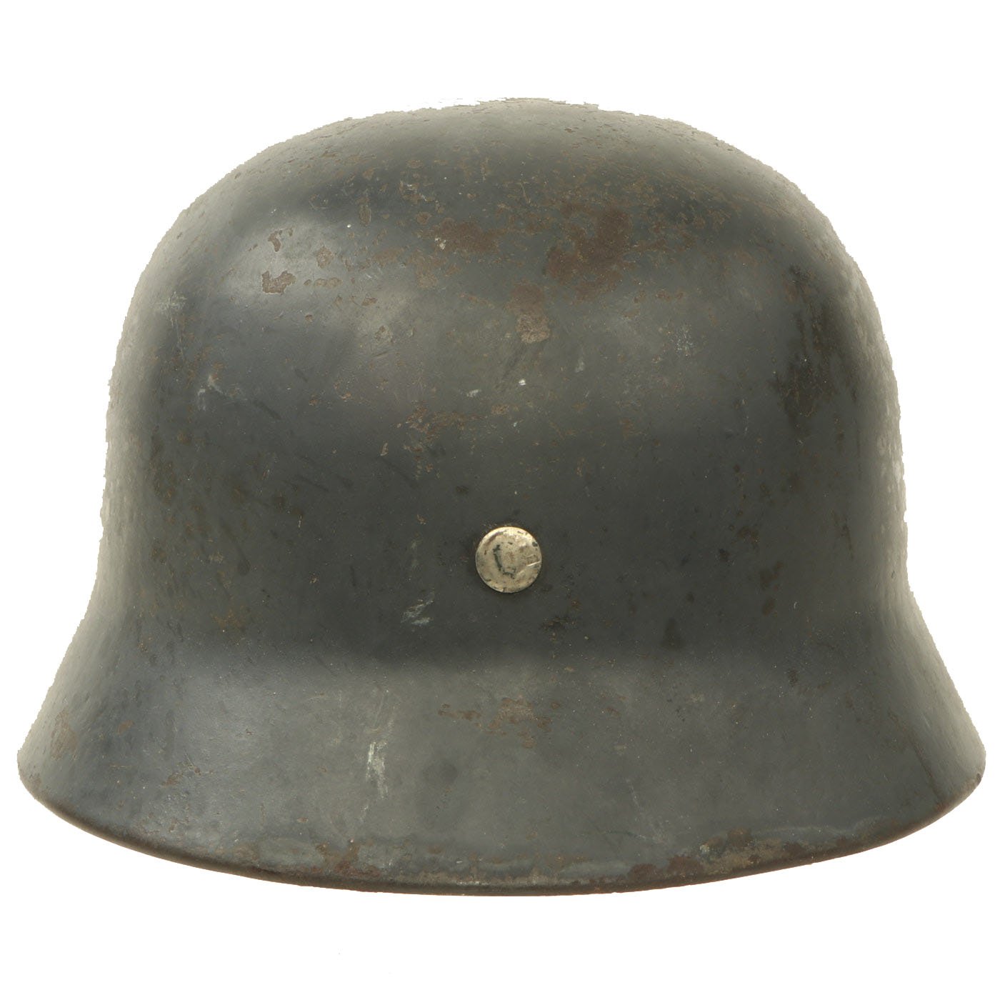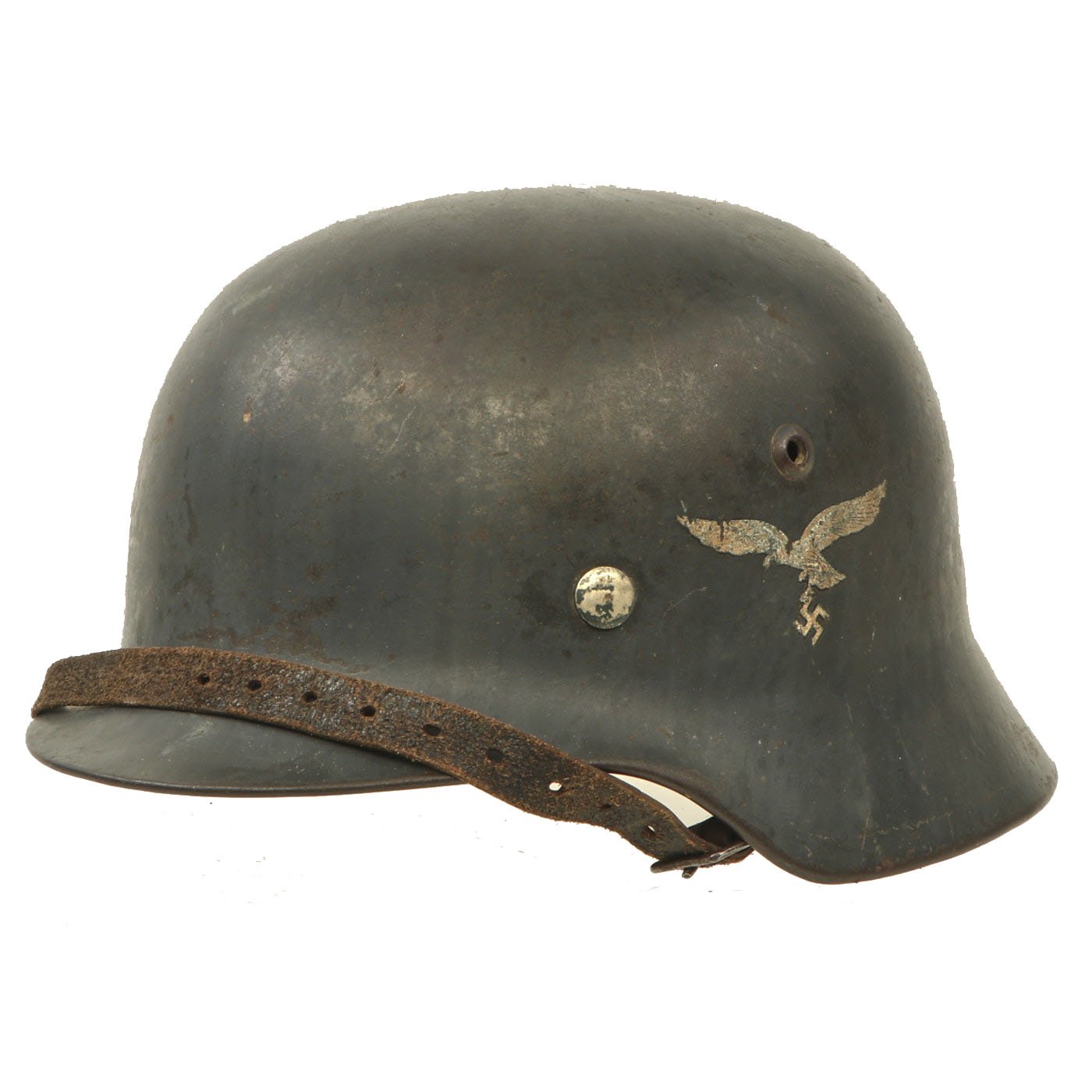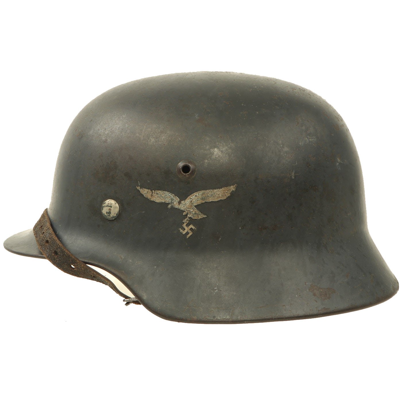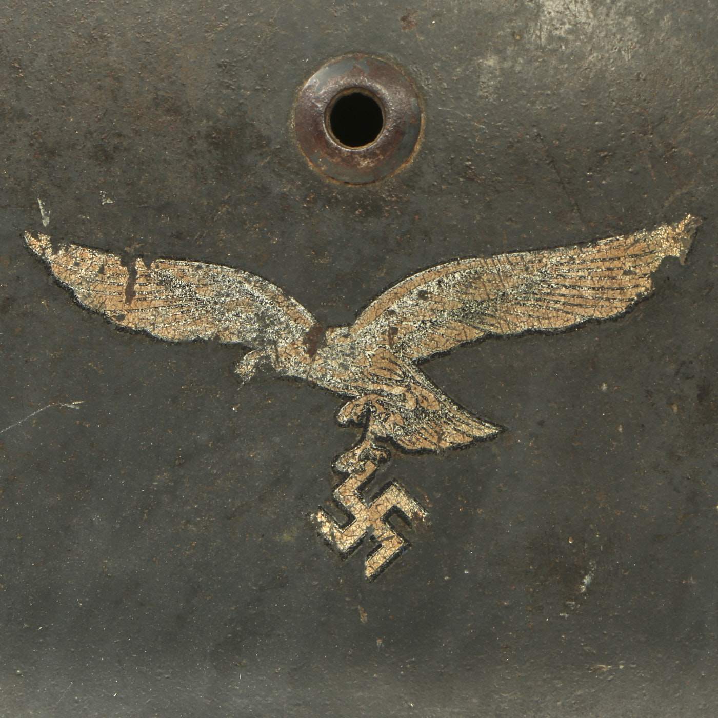 Original Item: Only One Available. This is a great all original example Model 1935 German WWII "double decal" helmet, with a Luftwaffe Eagle decal on the left side, and a "National Colors" decal on the right side. This stamped sheet steel construction helmet retains about 80% of the original Fliegerblau (Flyer Blue) paint and is in very good condition overall. It does show overall wear from cleaning and service, giving it a great look. The National Colors decal is retained at about 75%, with with some wear through as shown. The Luftwaffe decal is probably around 60%, with wear and some areas missing, and an overall cracked appearance. The use of the second decal was discontinued in 1940, and in 1943 it was ordered that helmets with the national colors have them removed, so finding a helmet with both still intact is a real treat!