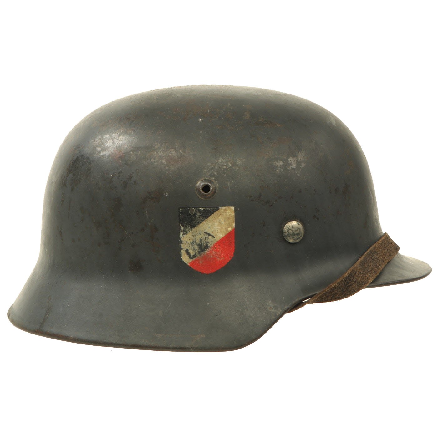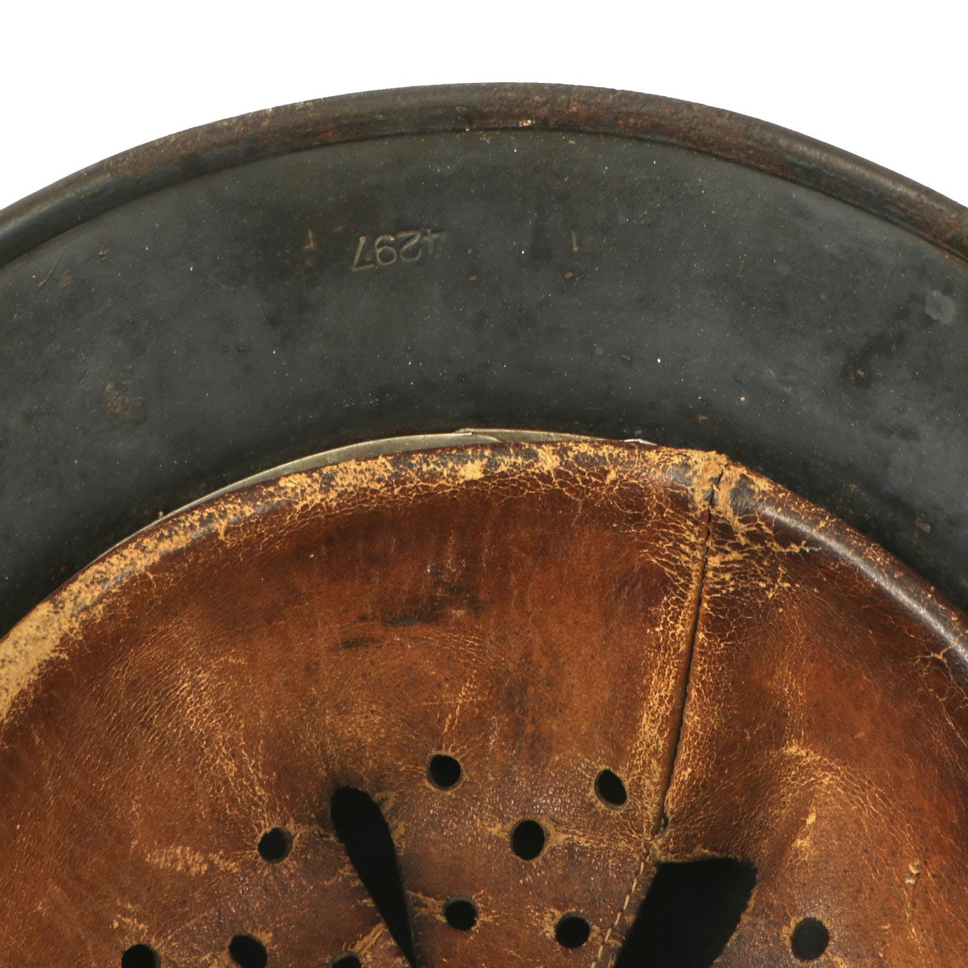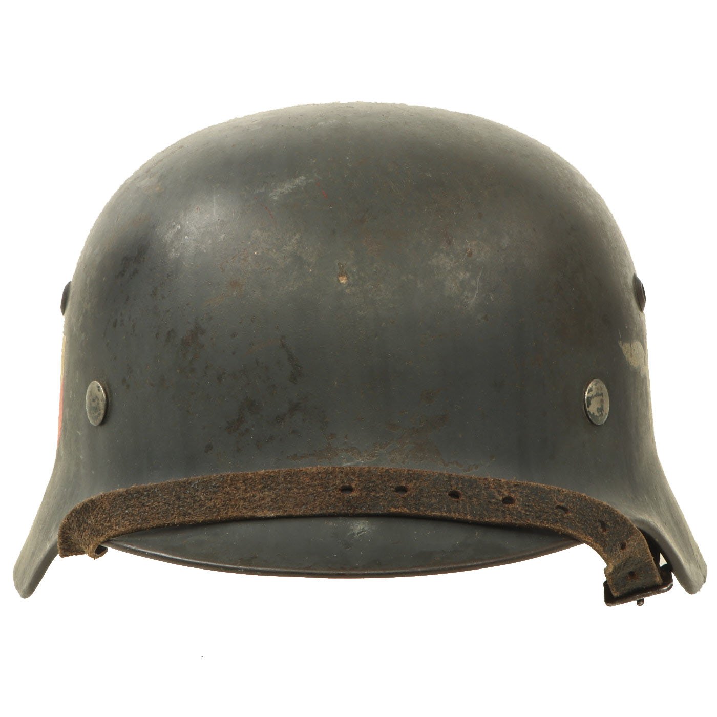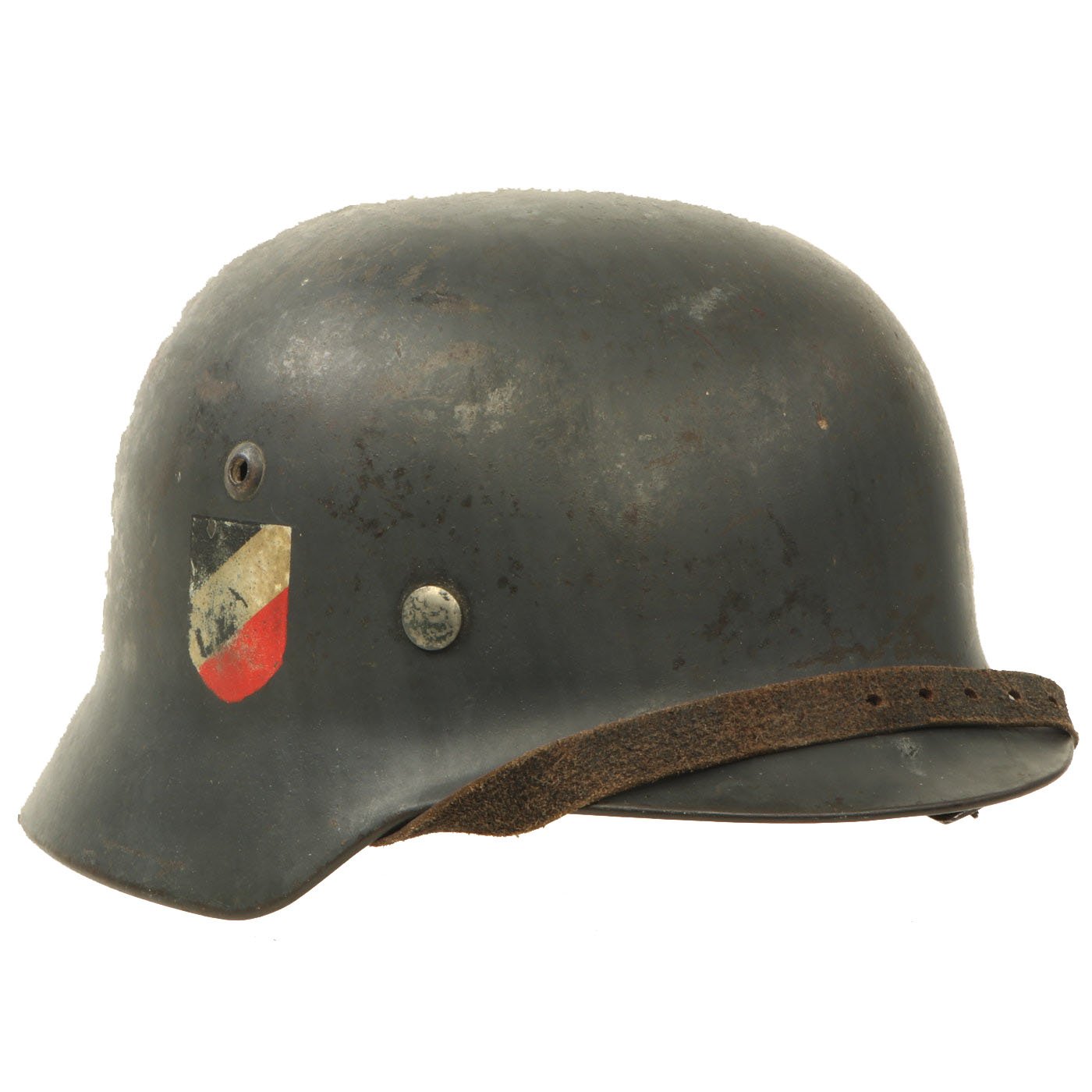 Original Item: Only One Available. This is a great all original example Model 1935 German WWII "double decal" helmet, with a Luftwaffe Eagle decal on the left side, and a "National Colors" decal on the right side. This stamped sheet steel construction helmet retains about 80% of the original Fliegerblau (Flyer Blue) paint and is in very good condition overall. It does show overall wear from cleaning and service, giving it a great look. The National Colors decal is retained at about 75%, with with some wear through as shown. The Luftwaffe decal is probably around 60%, with wear and some areas missing, and an overall cracked appearance. The use of the second decal was discontinued in 1940, and in 1943 it was ordered that helmets with the national colors have them removed, so finding a helmet with both still intact is a real treat!