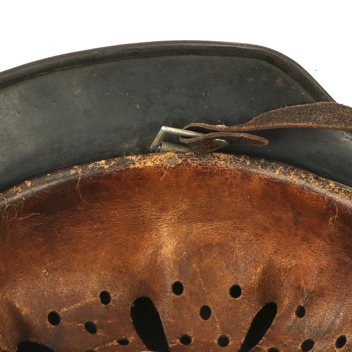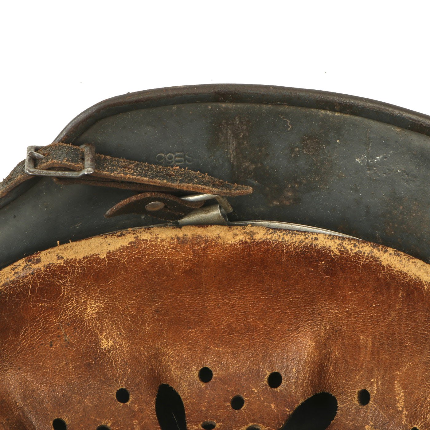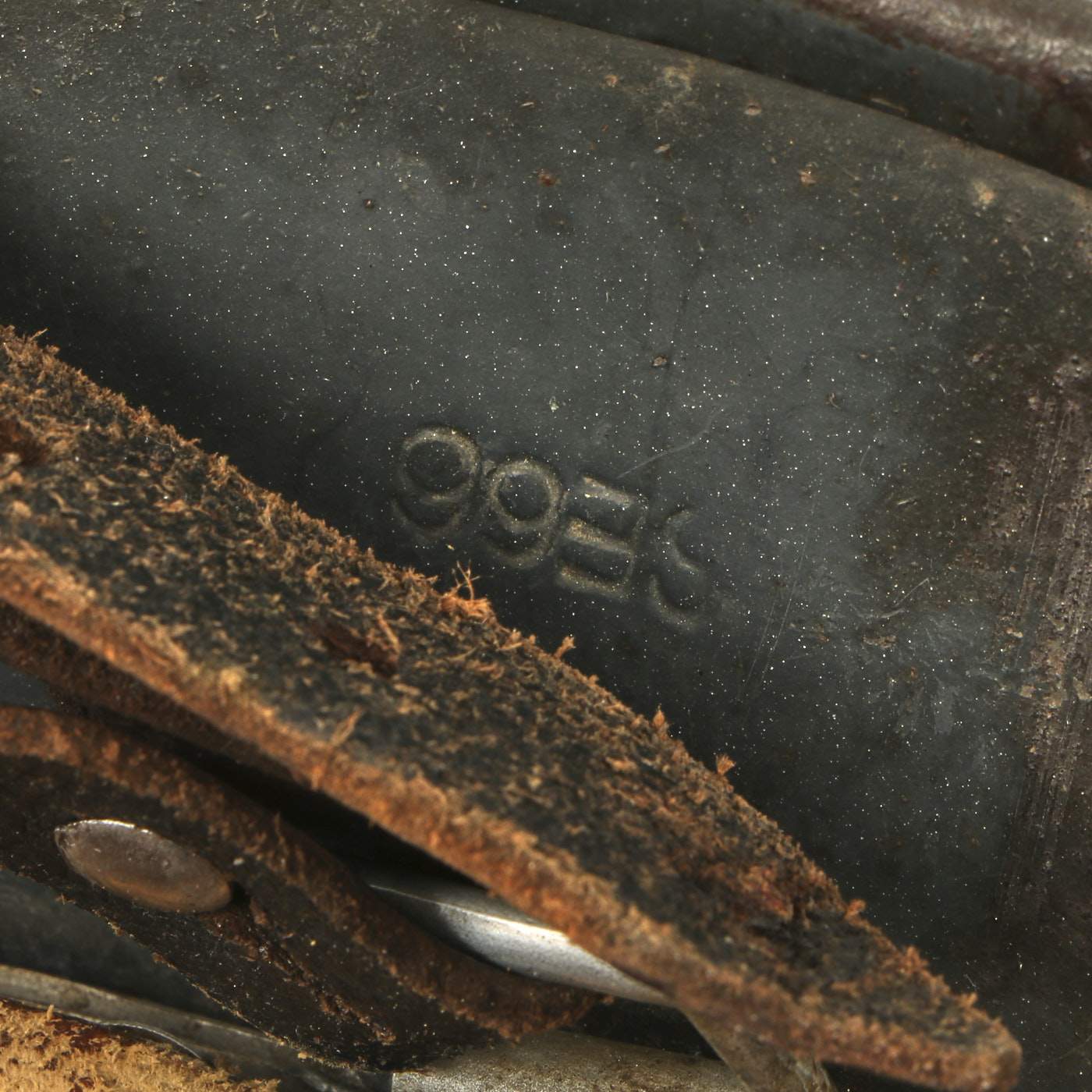 The chin strap is present, though it may be a later war replacement. It has one aluminum attachment stud, and one steel, with a galvanized steel buckle. It is marked on one end with RBNr. 0/0365/007, which usually indicates later war manufacture. The leather is worn and somewhat stiff, so we definitely feel that it was used in service with this helmet.