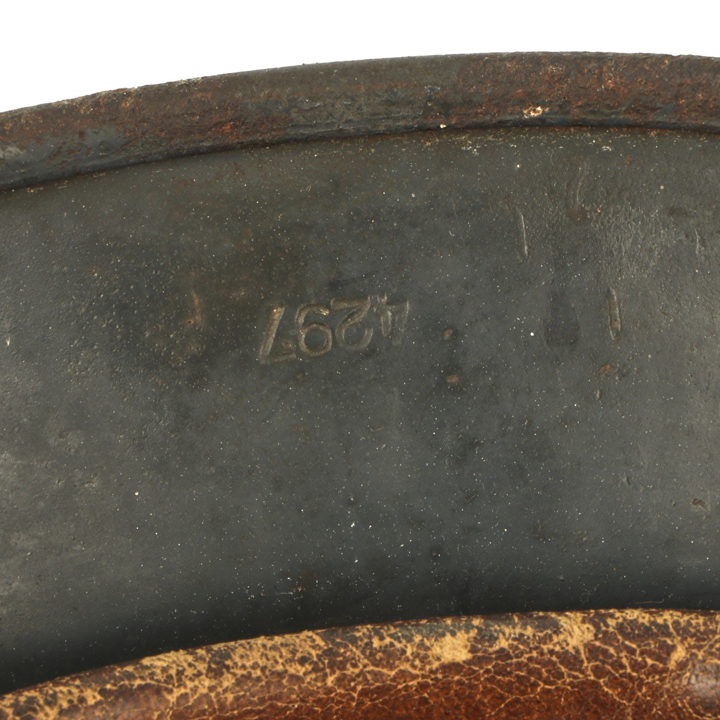 All three liner retaining pins are intact, with most of their original paint worn away. The helmet still has its correct very good condition M31 liner with all of the 8 fingers present and supple. The liner also still has its original size adjustment string, and overall there is only moderate wear the liner. The liner band is aluminum, with square aluminum chin strap loops attached to reinforced sides. This is the last pattern before the move to galvanized steel bands. The left exterior of the liner band is marked 66 n. A. 58, indicating that it is a size 58 liner for a size 66 shell, and there is a 58 size faintly stamped onto the leather. The right side displays the full manufacture information, as well as a date: