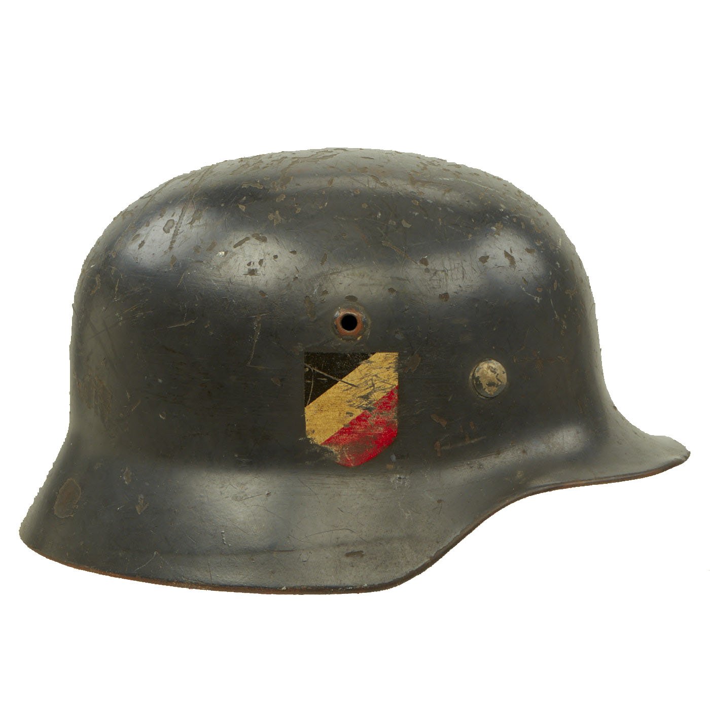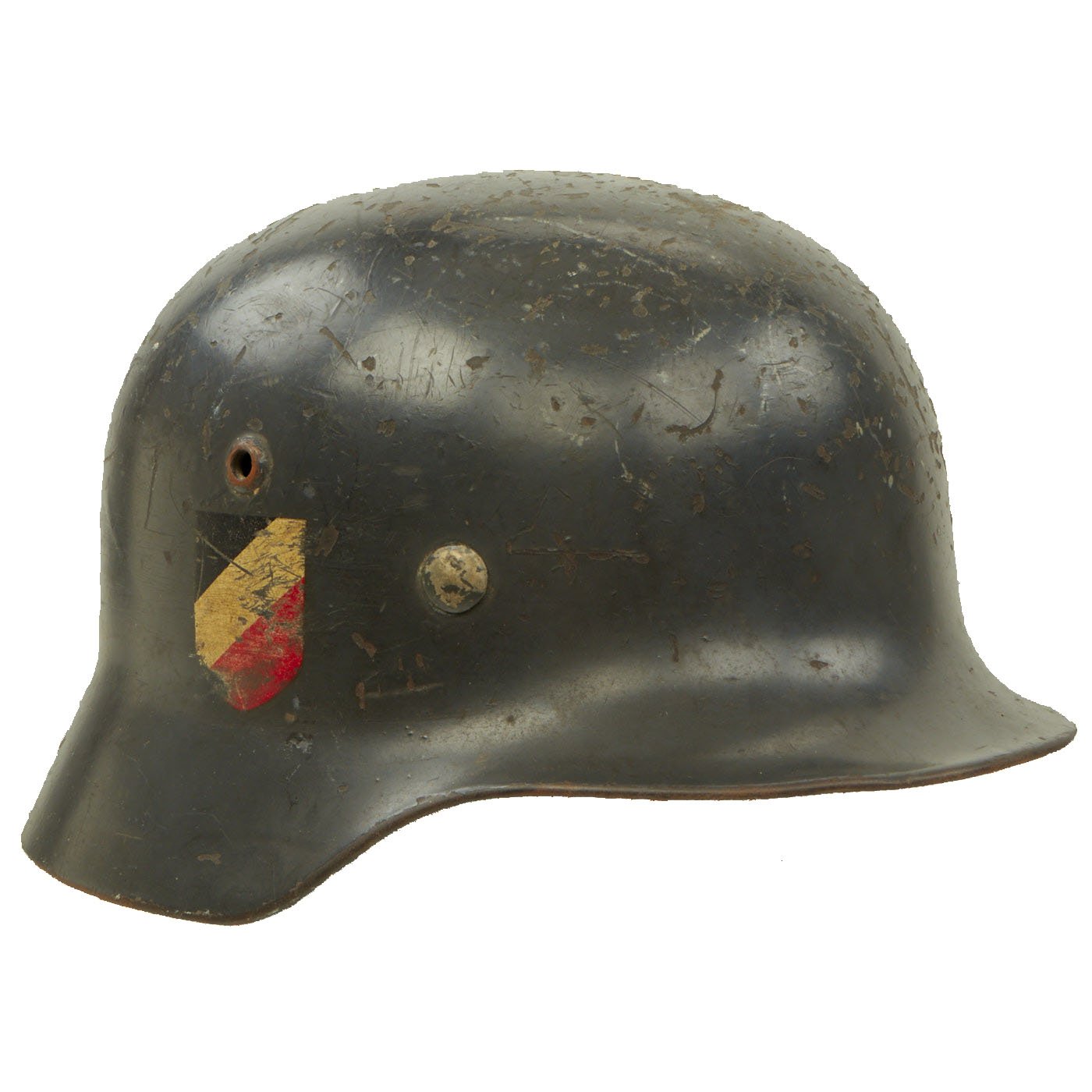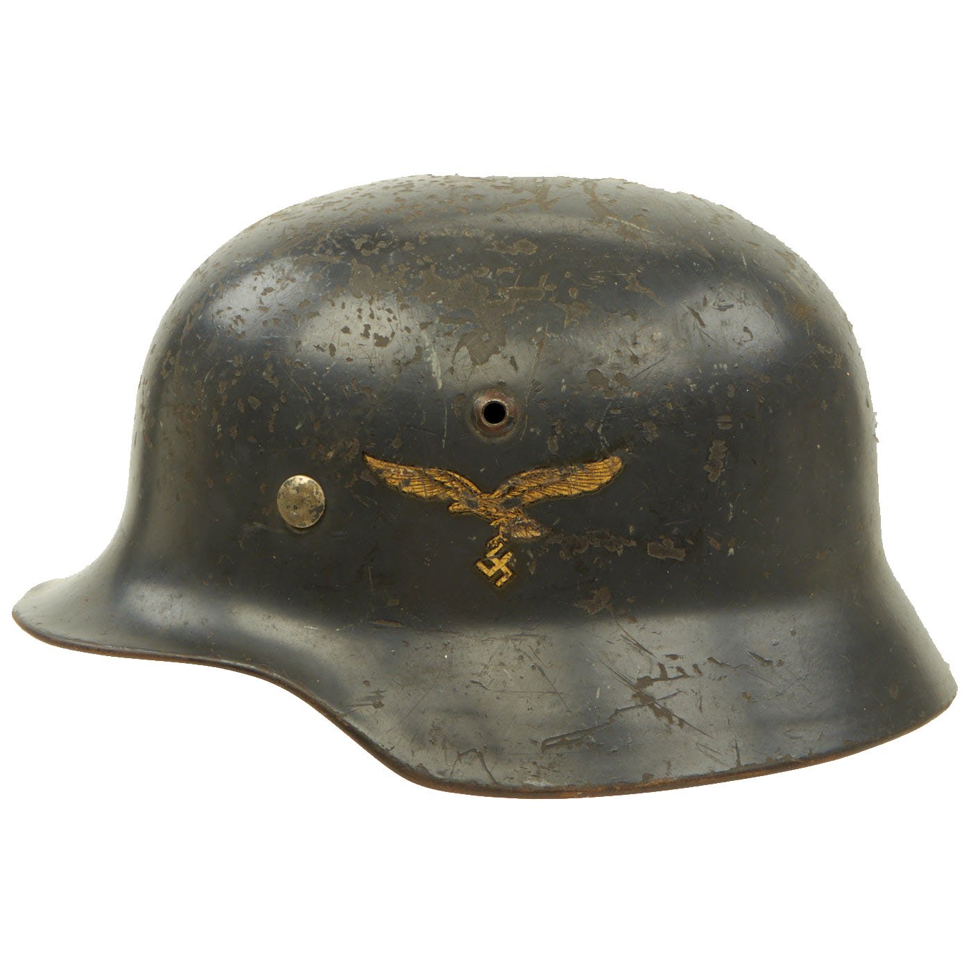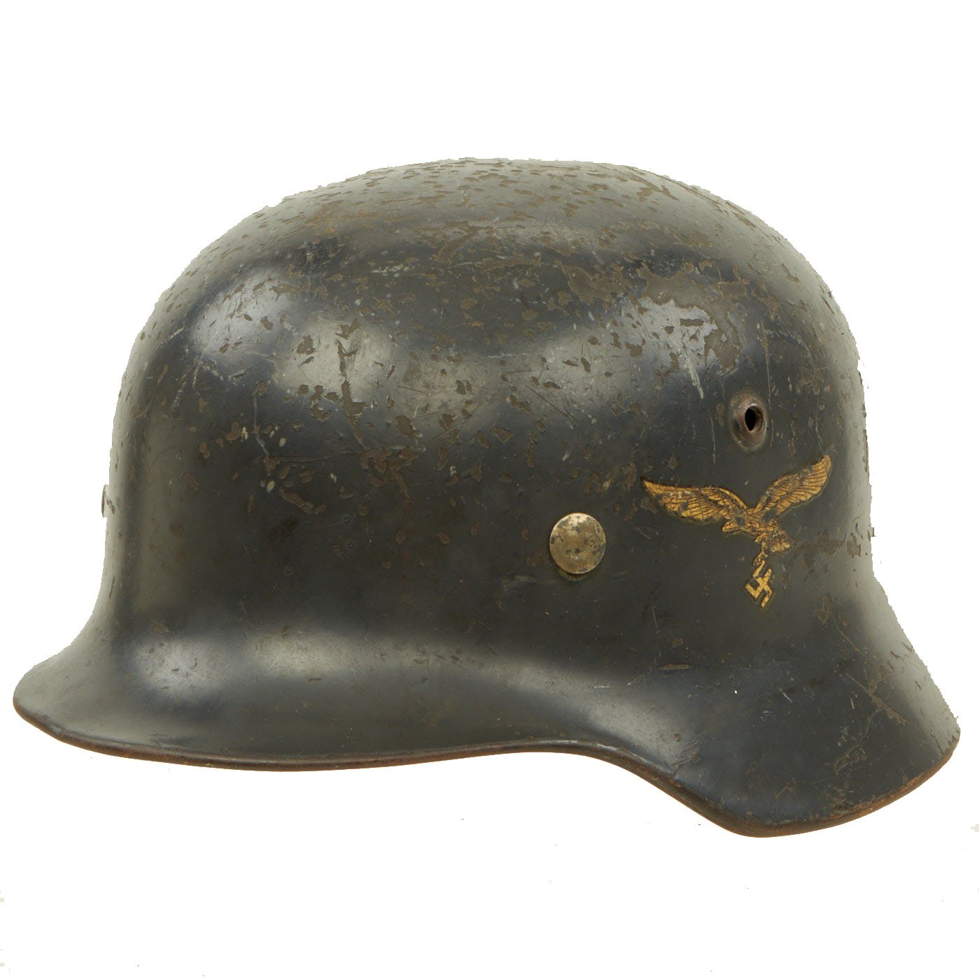 Original Item: Only One Available. This is an incredible all original example of a Model 1935 German early WWII "double decal" helmet, complete with original liner and chinstrap! It has the correct Luftwaffe Eagle decal on the left side, and a "National Colors" decal on the right. The use of the second decal was discontinued in 1940, and in 1943 it was ordered that helmets with the national colors have them removed, so finding a helmet with both still intact is a real treat!