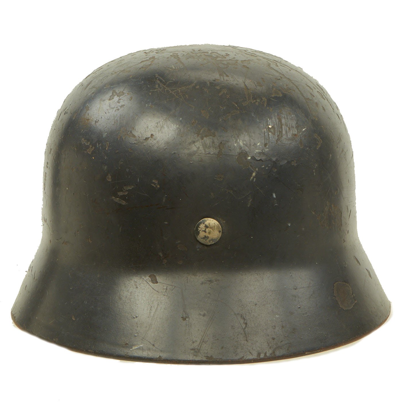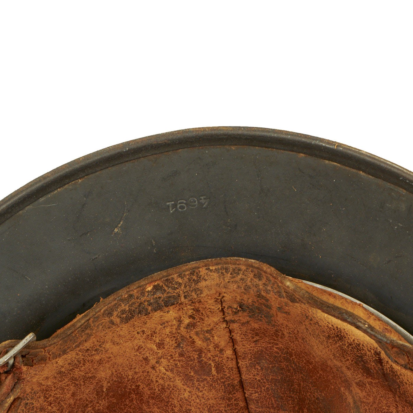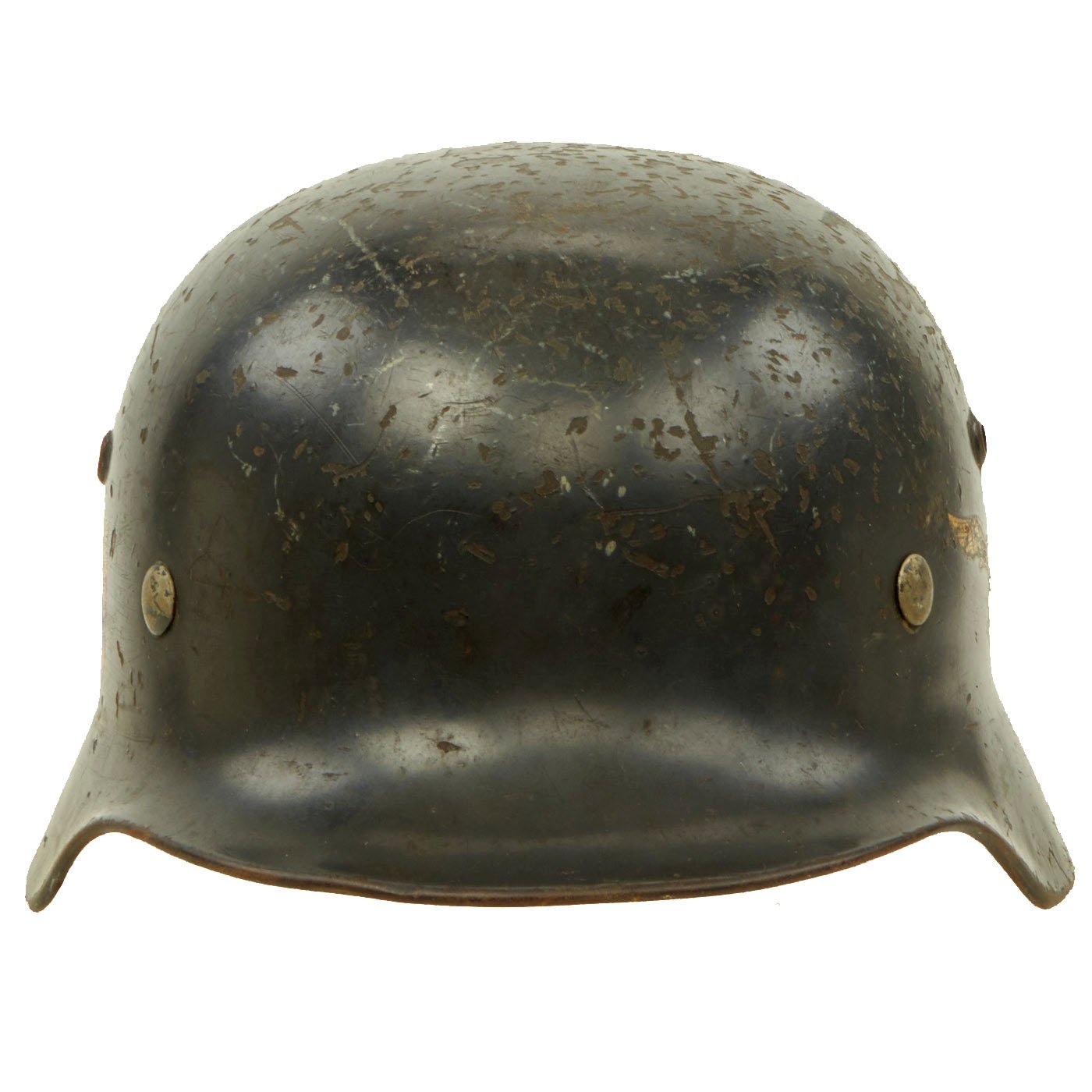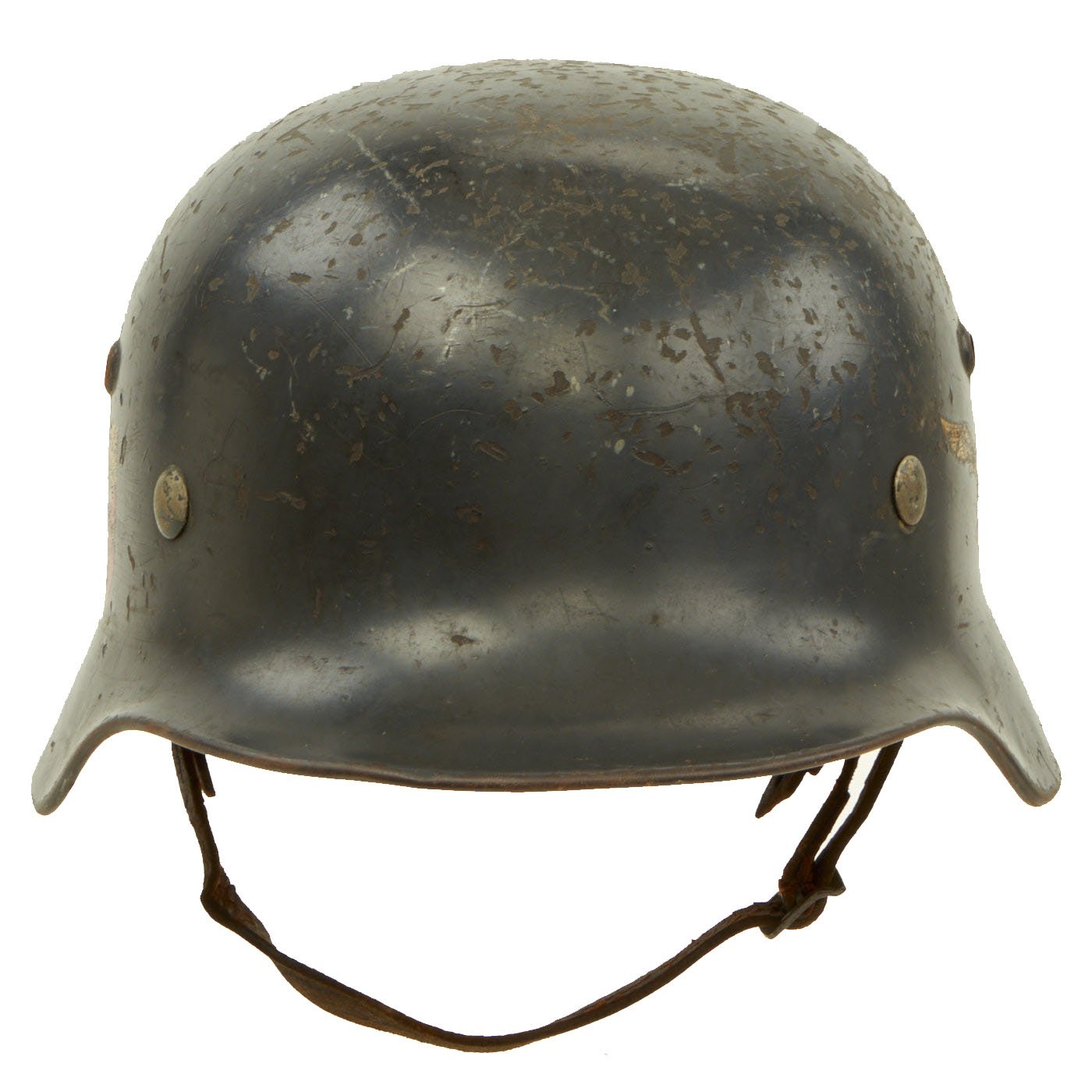 Original Item: Only One Available. This is an incredible all original example of a Model 1935 German early WWII "double decal" helmet, complete with original liner and chinstrap! It has the correct Luftwaffe Eagle decal on the left side, and a "National Colors" decal on the right. The use of the second decal was discontinued in 1940, and in 1943 it was ordered that helmets with the national colors have them removed, so finding a helmet with both still intact is a real treat!