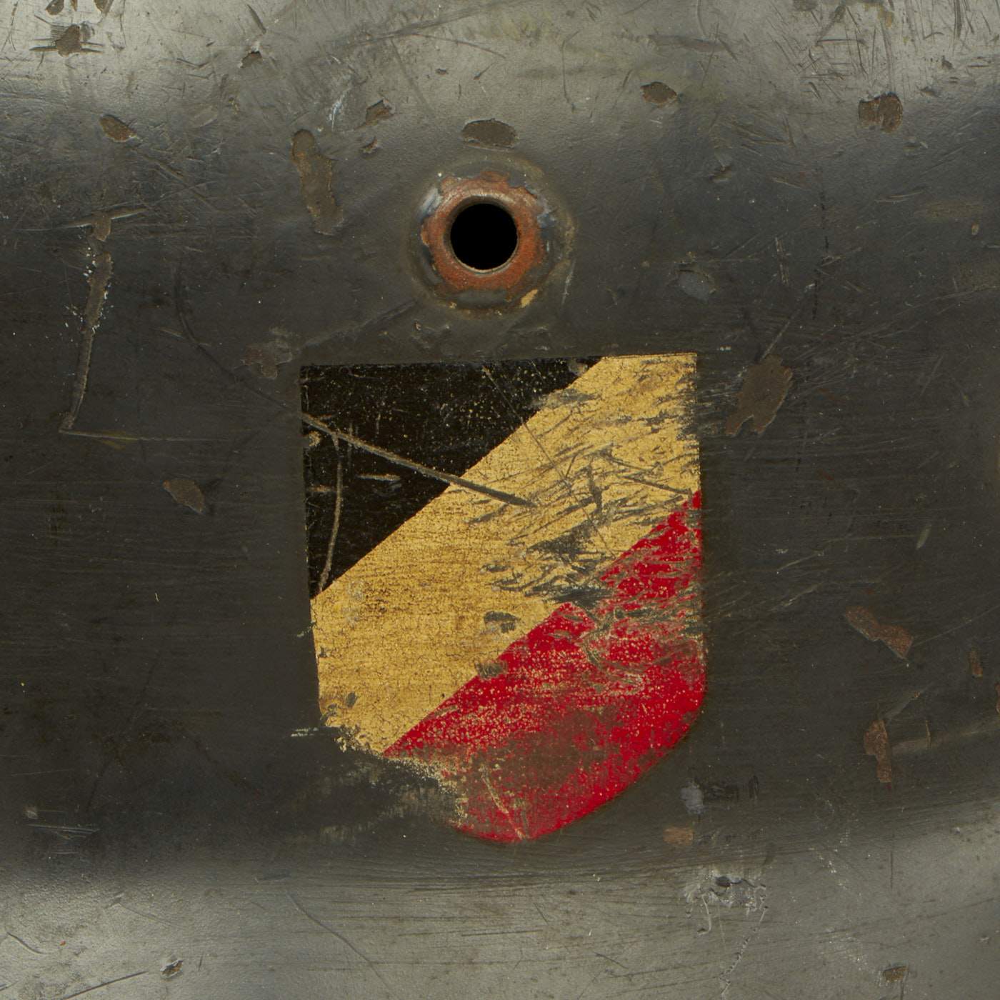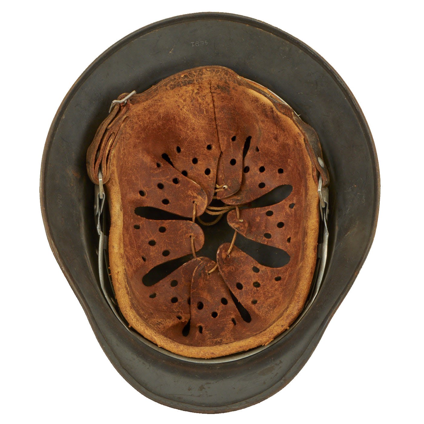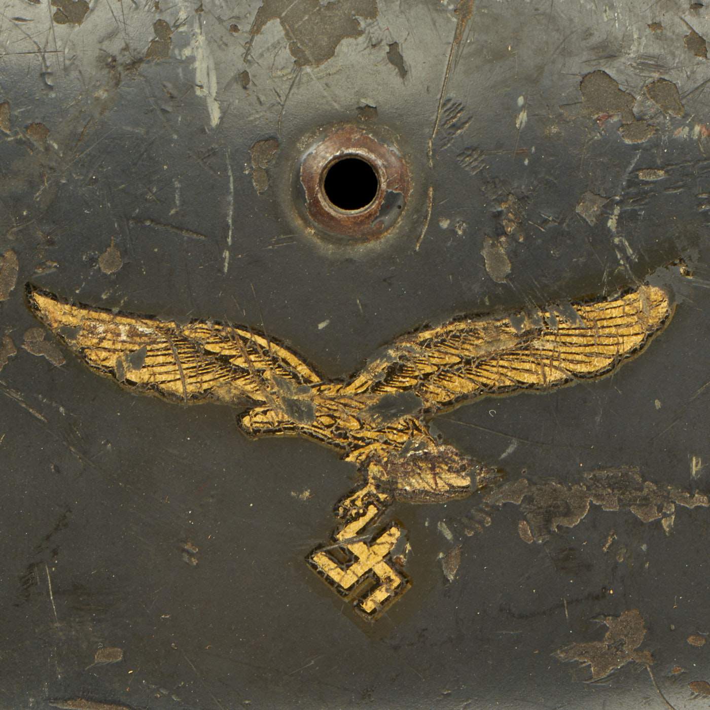 Both decals are still retained at around 75%, and both have a lovely aged yellow look from the lacquer coating used on German decals. The paint is the correct smooth blue-gray Luftwaffe fliegerblau used on early helmets, which would later become textured, and is well retained. Just a great example of an early WWII period helmet!