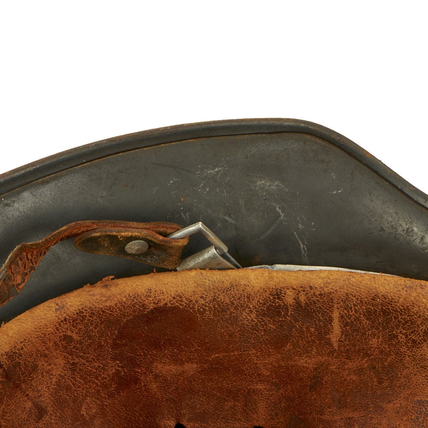 Attached to the liner is an intact leather chinstrap, which looks to be a later war replacement, as the buckle and one of the studs are steel, while the other stud is aluminum. It shows service wear and degradation, and we were not able to see any markings on it.