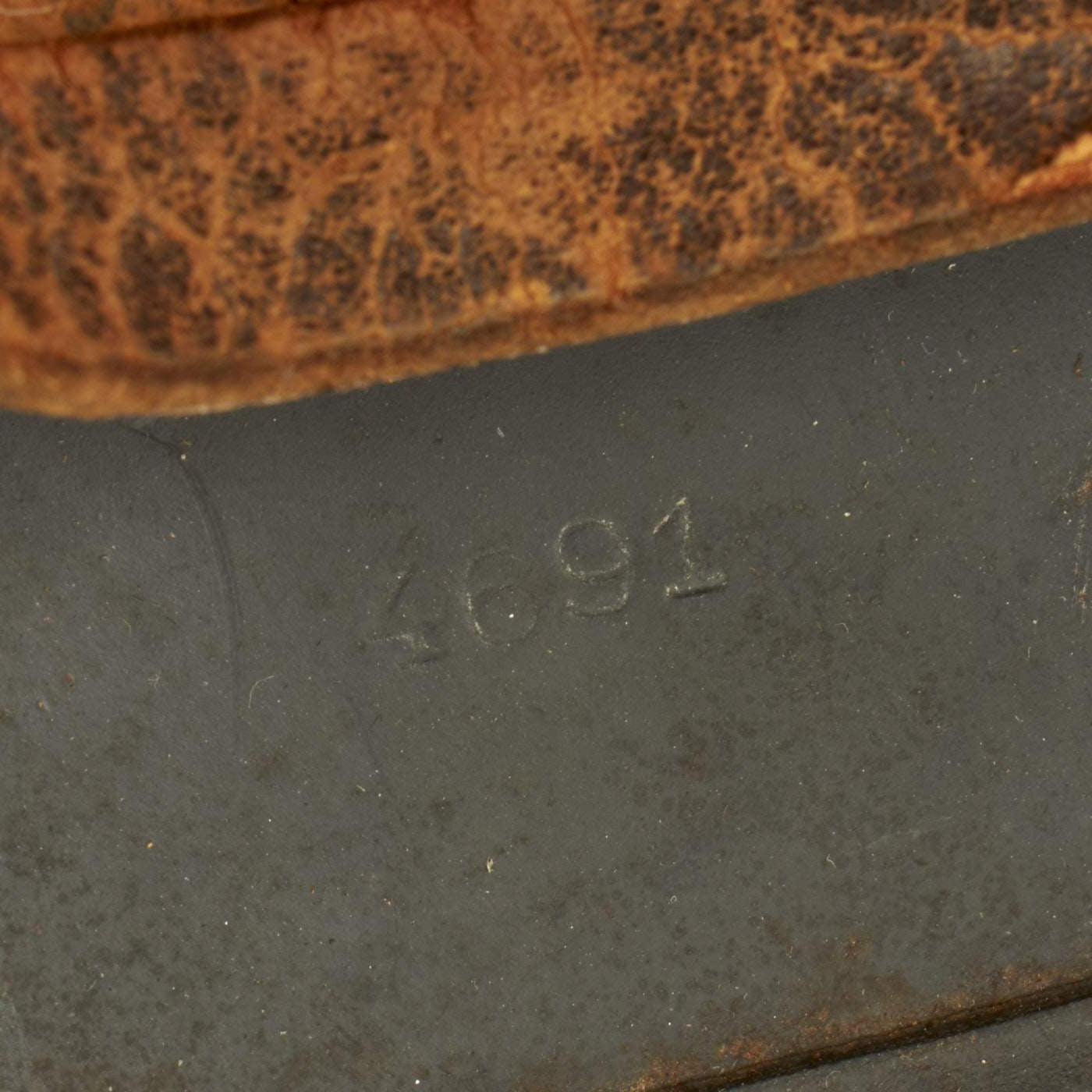 The reverse, interior, neck guard apron is serial number stamped 4691 and the interior, left side, apron has the stamped manufacturer's code and size, Q64 indicating that it was manufactured by Quist in the German city of Esslingen. Size 64 is a nice smaller size that can accommodate liners from 56cm to 57cm or US 7 to 7 1/8. Size 64 shells are harder to find and are therefore more valuable to a collector.