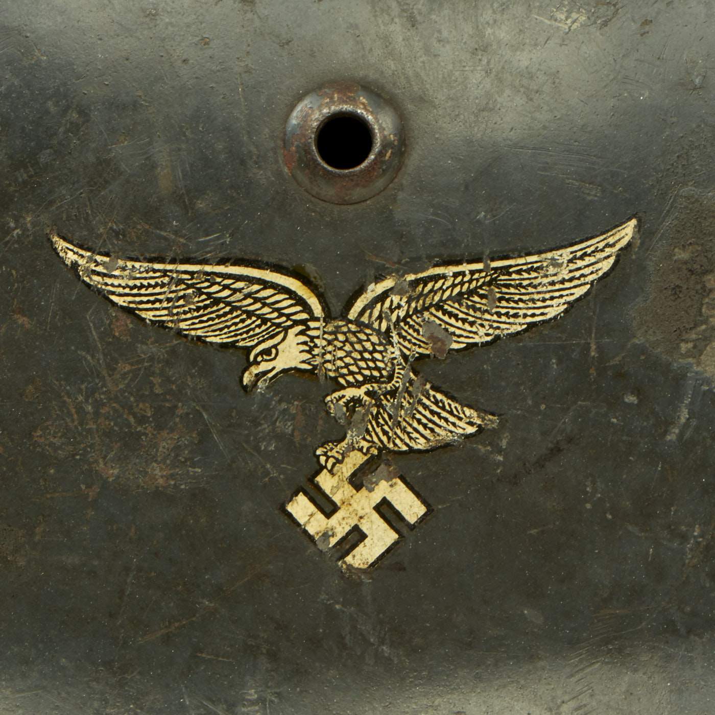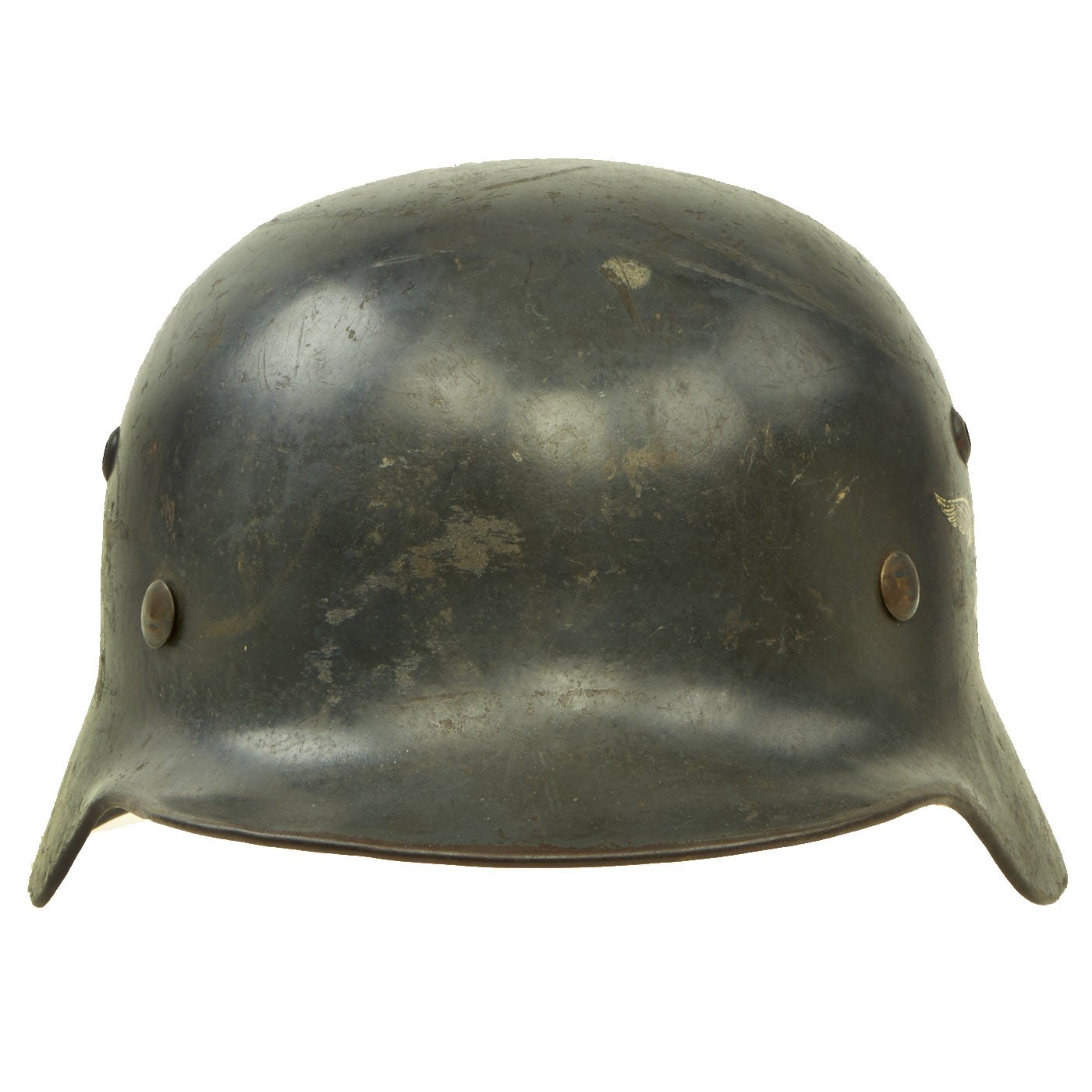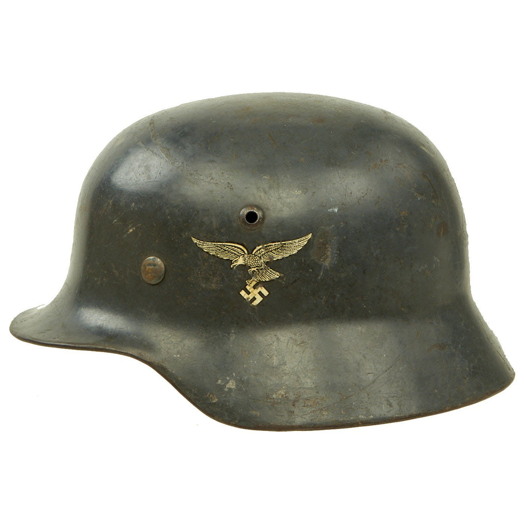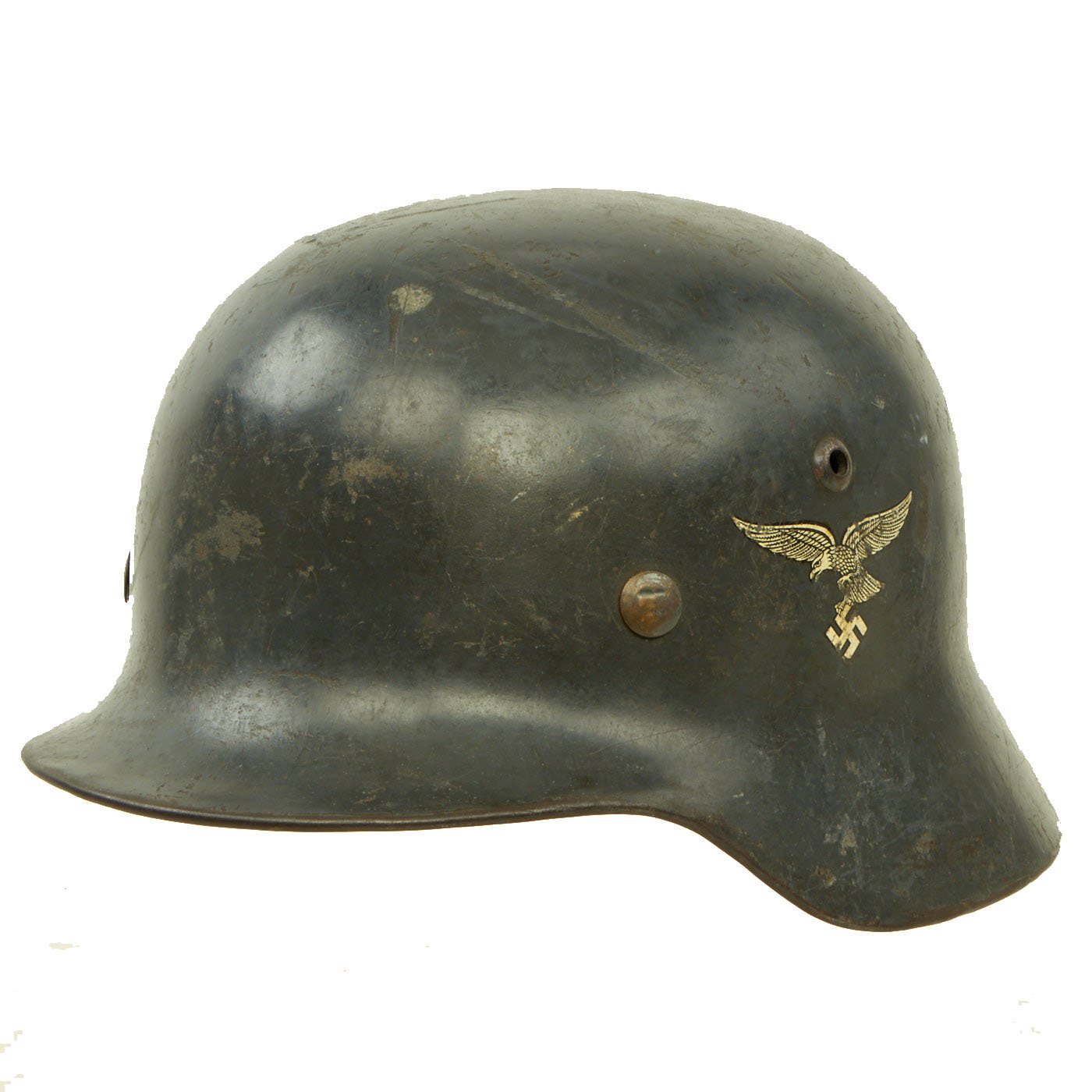 Original Item: Only One Available. This is a great lightly used all original example Model 1935 German WWII "single decal" helmet, with an early "Droop-Tail" Luftwaffe Eagle decal on the left side. Also, the right side of the helmet clearly shows that it had a "National Colors" decal, which was removed, so this was originally a "double decal" helmet, correct for early war issue. The use of the second decal was discontinued in 1940, and in 1943 it was ordered that helmets with the national colors have them removed, which is why this helmet no longer has one.