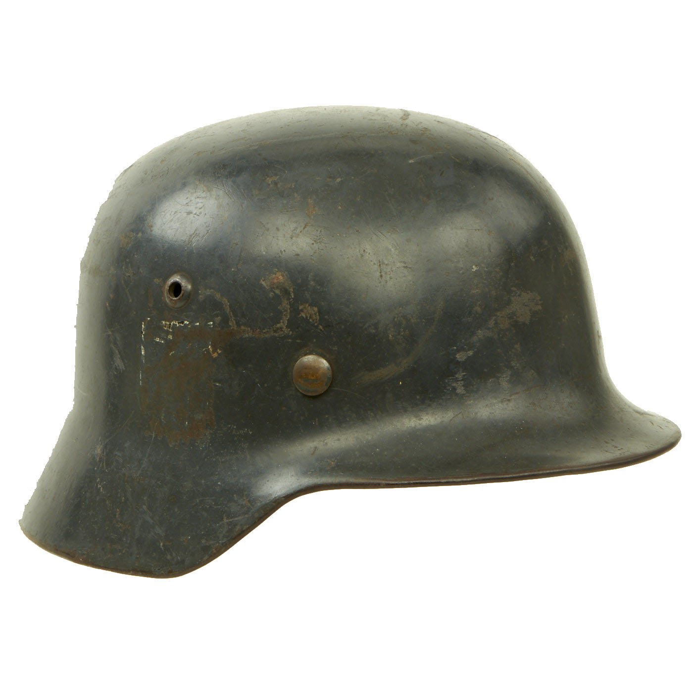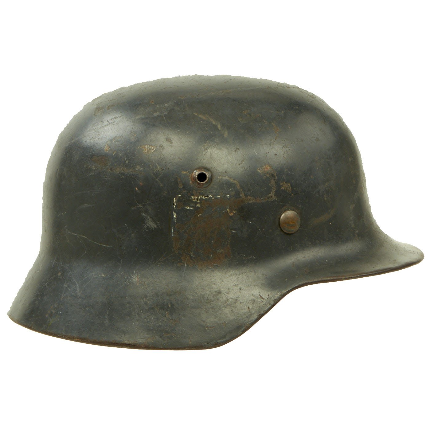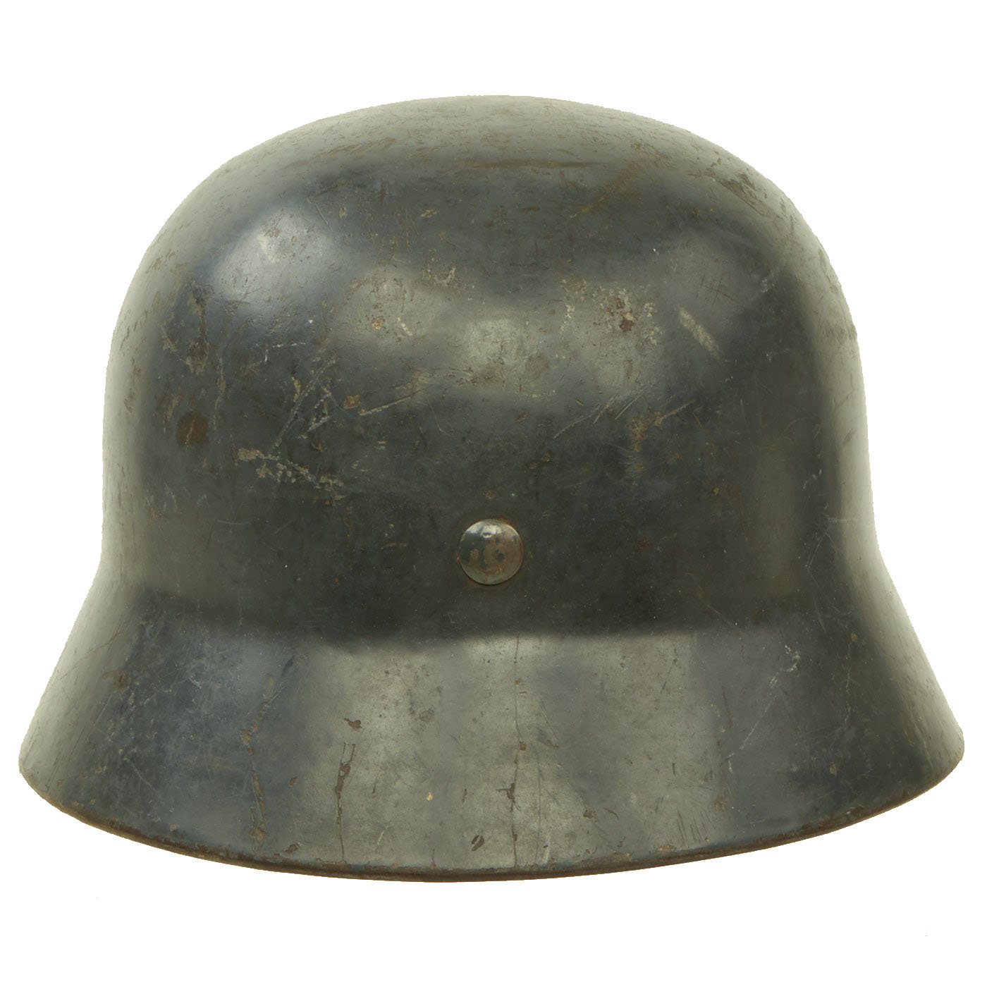 Original Item: Only One Available. This is a great lightly used all original example Model 1935 German WWII "single decal" helmet, with an early "Droop-Tail" Luftwaffe Eagle decal on the left side. Also, the right side of the helmet clearly shows that it had a "National Colors" decal, which was removed, so this was originally a "double decal" helmet, correct for early war issue. The use of the second decal was discontinued in 1940, and in 1943 it was ordered that helmets with the national colors have them removed, which is why this helmet no longer has one.