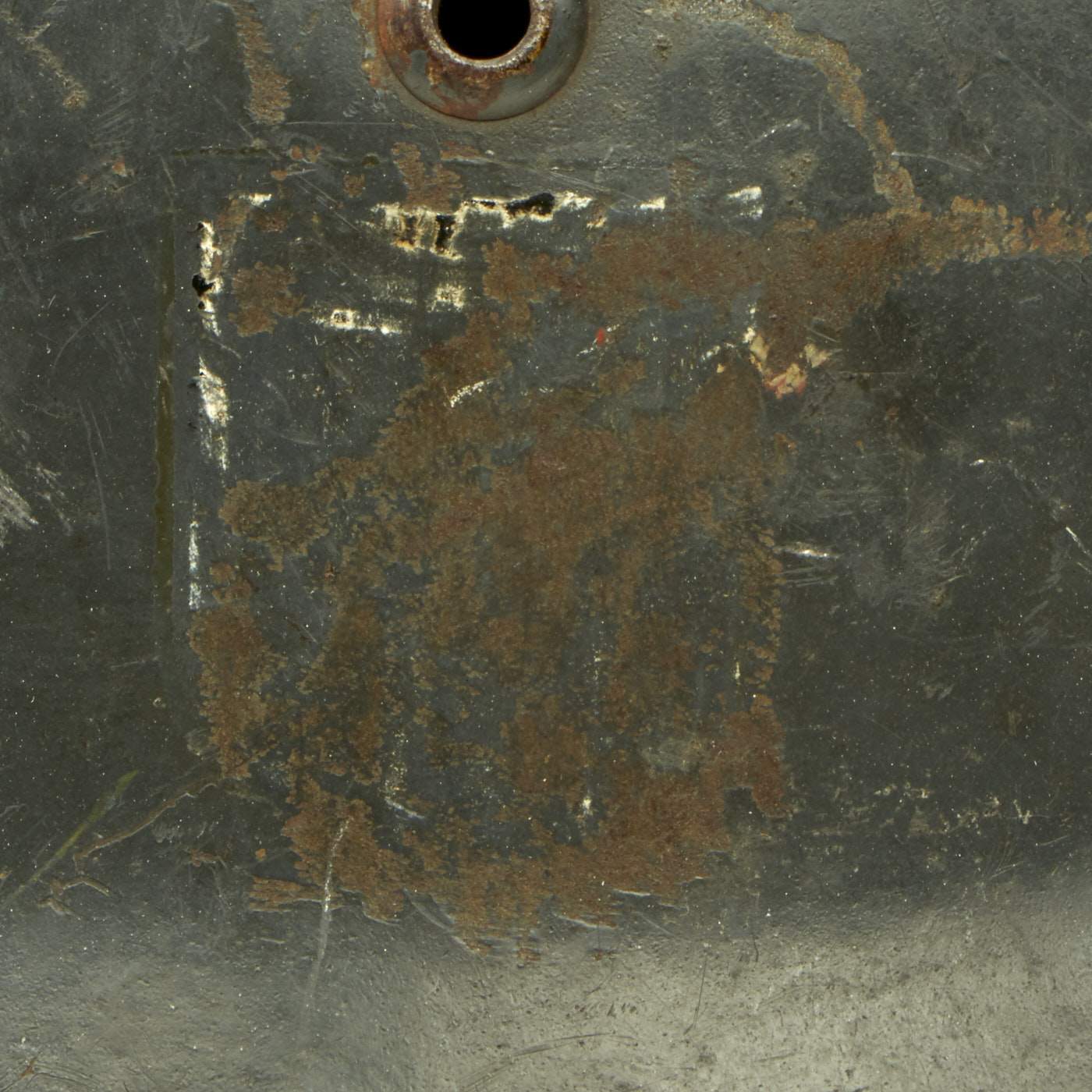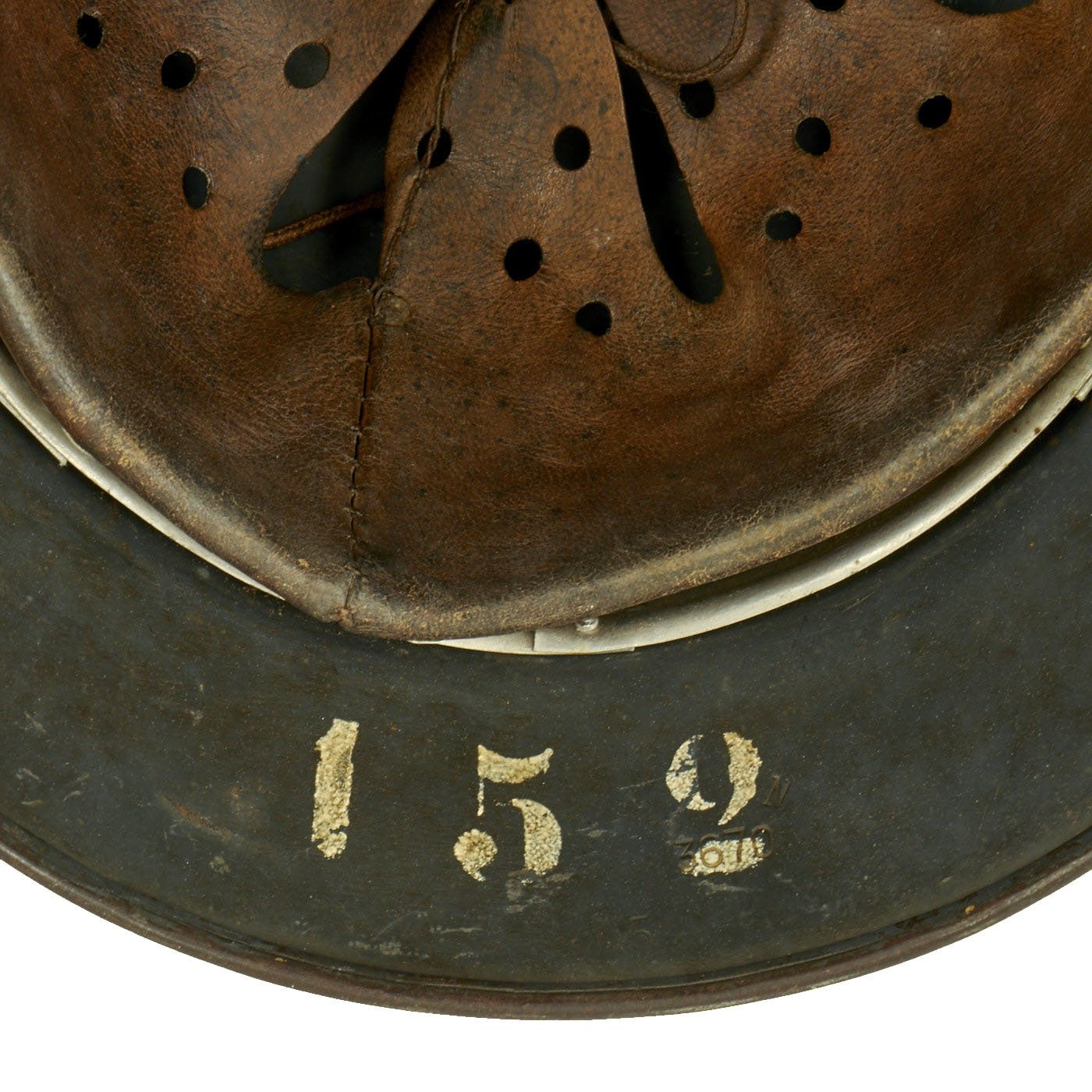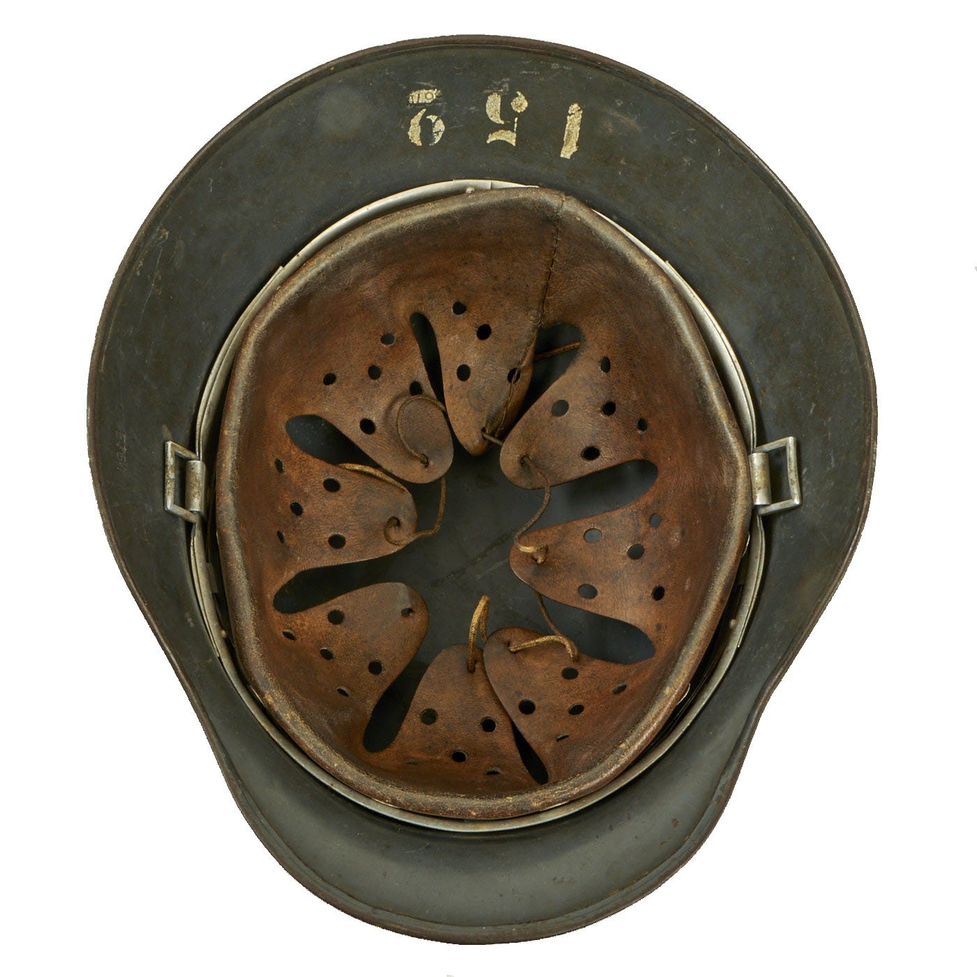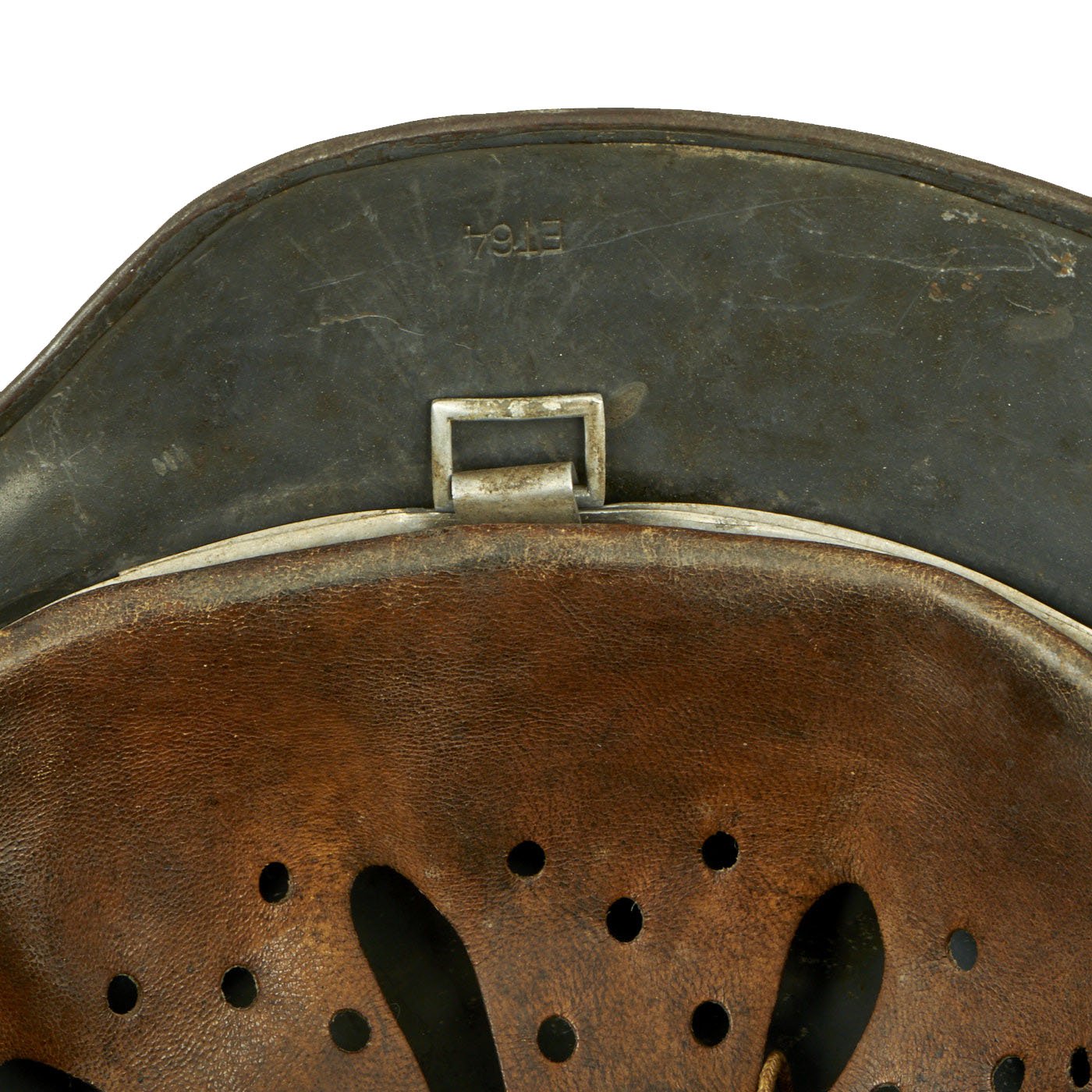 The reverse, interior, neck guard apron is heat lot number stamped 3670, and there is also an N stamped above, and a 5 below. It is marked with the numbers 152 in white paint, possibly a unit marking. The interior, left side, apron has the stamped manufacturer's code and size, ET64, indicating that it was manufactured by Eisenhuttenwerk AG of Thale, located in the Harz district in Saxony, Germany. Size 64 is a nice medium size that can accommodate liners from 56cm to 57cm or US 7 to 7 1/8. Size 64 shells are harder to find and are therefore more valuable to a collector.