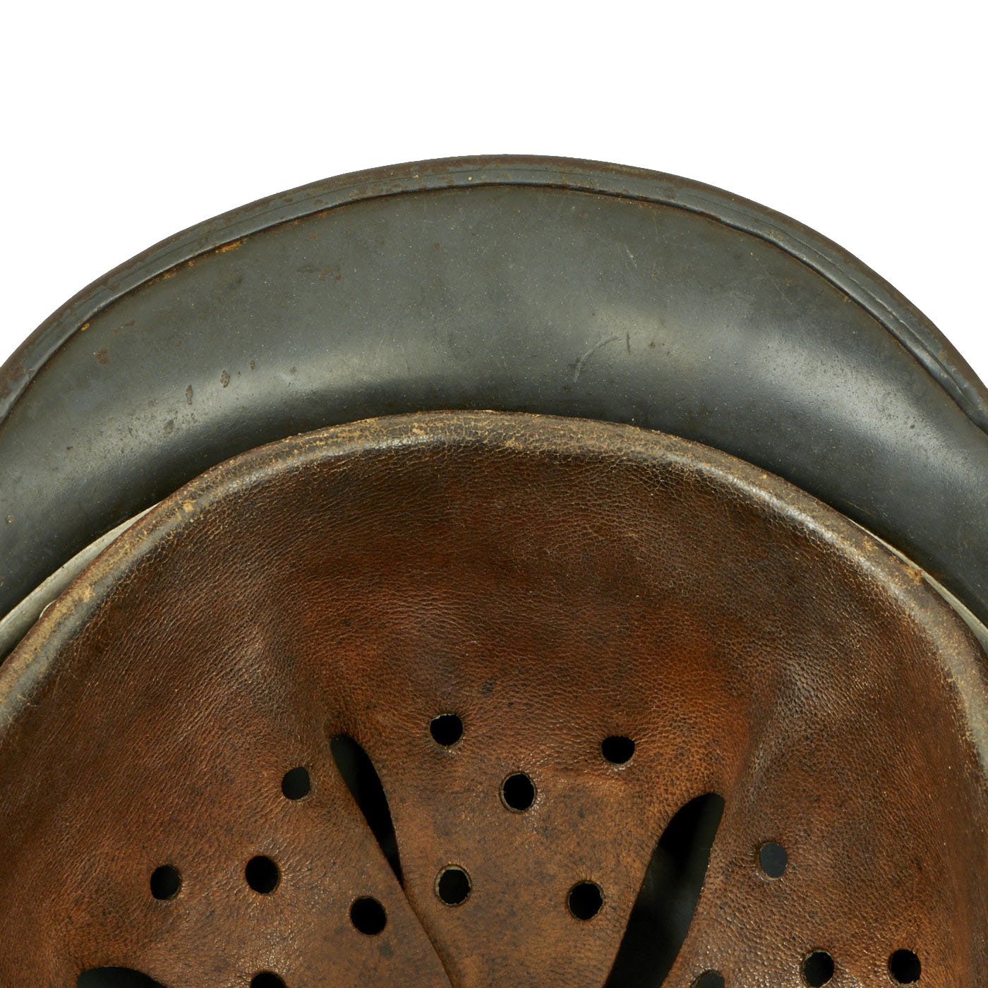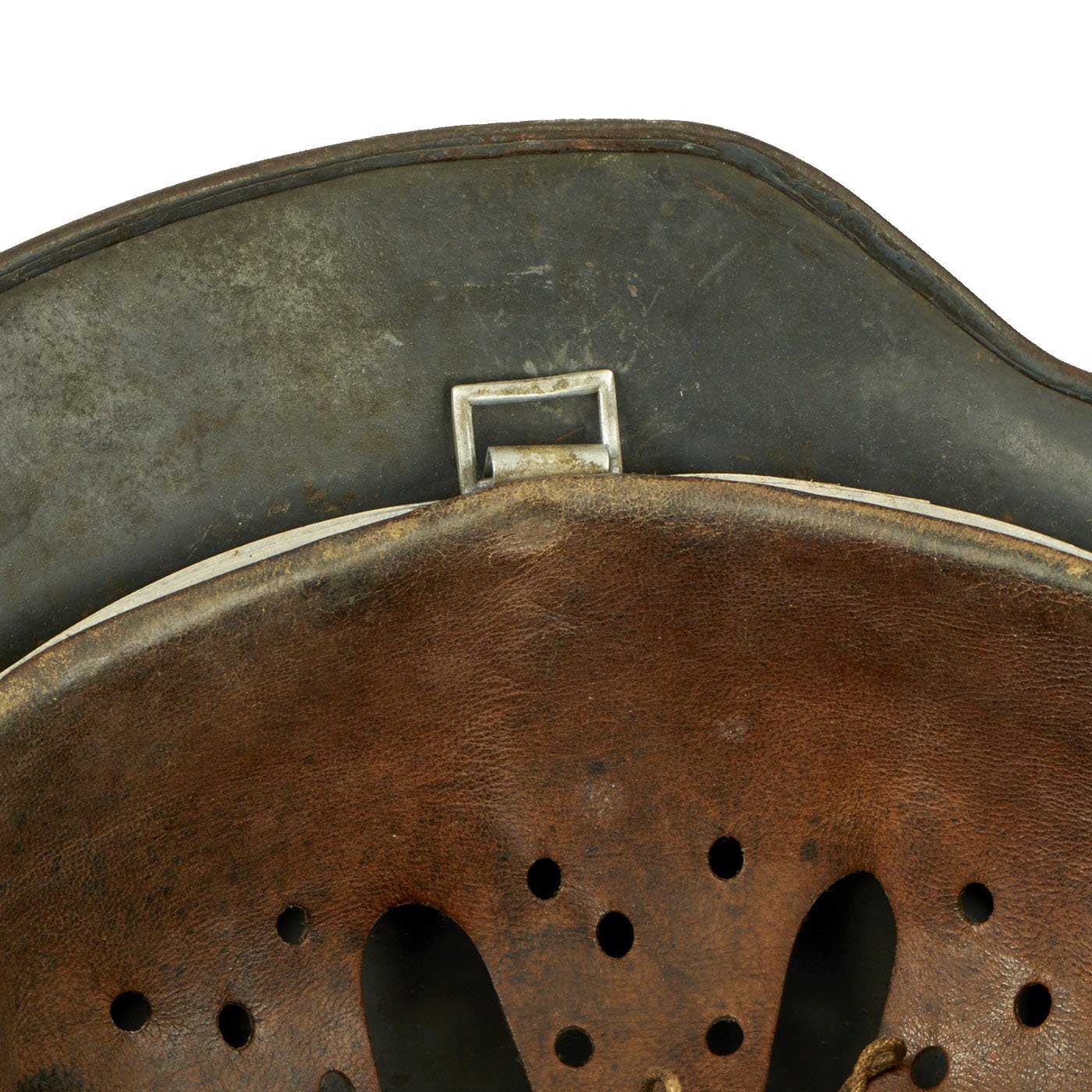 The helmet still has its correct very good condition M31 liner with all of the 8 fingers present and supple. The liner also still has its original size adjustment string, and overall there is only moderate wear to the liner, mostly around the edge, though the leather has darkened in color. The liner band is aluminum, with square aluminum chin strap loops attached to reinforced sides. This is the last pattern before the move to galvanized steel bands. The left exterior of the liner band is marked 64 n.A / 56, indicating that it is a size 56 liner for a size 64 shell. It is also maker marked and dated on the other side: