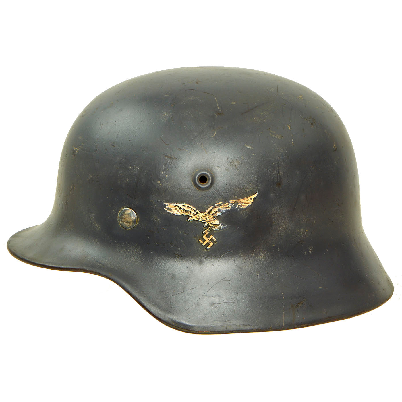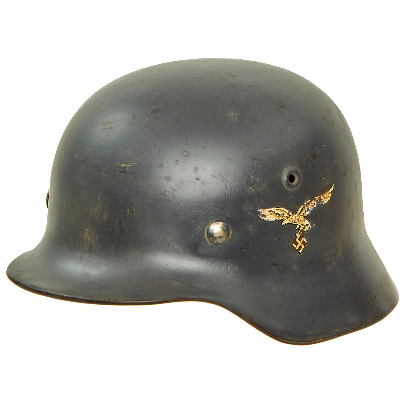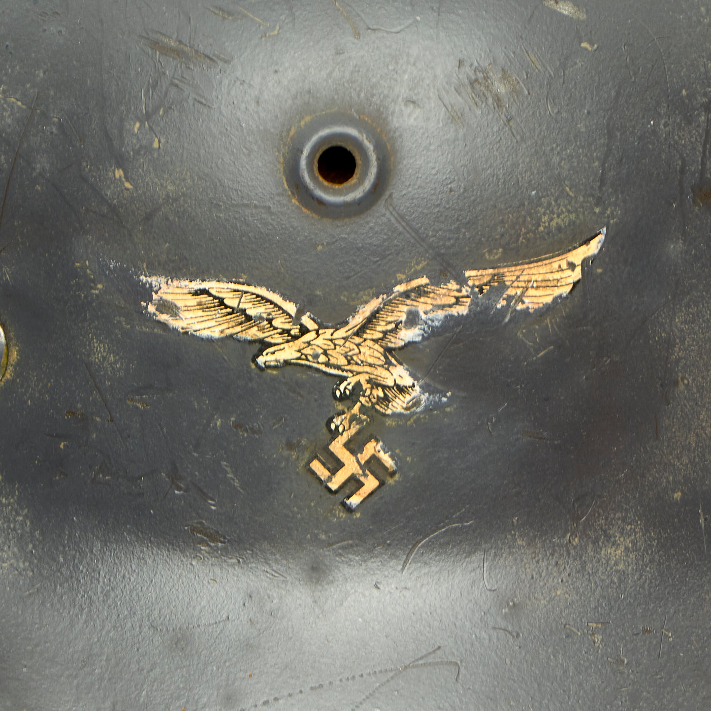 Original Item: Only One Available. This is a great original example Model 1940 German WWII helmet with a single Luftwaffe Eagle decal. The exterior paint of this helmet shows wear, and there are remnants of a camouflage paint job, which looks to have been removed during the war, or possibly post war so that the decal was easier to see. It now retains helmet retains over 80% of the original smooth Luftwaffe Fliegerblau (Flyer's Blue) Blue-Gray paint, and really has a great look! The decal is unfortunately a bit worse off, looking like it did not adhere well to to paint, and is retained at probably about 60%, though it is still undeniably a Luftwaffe decal.