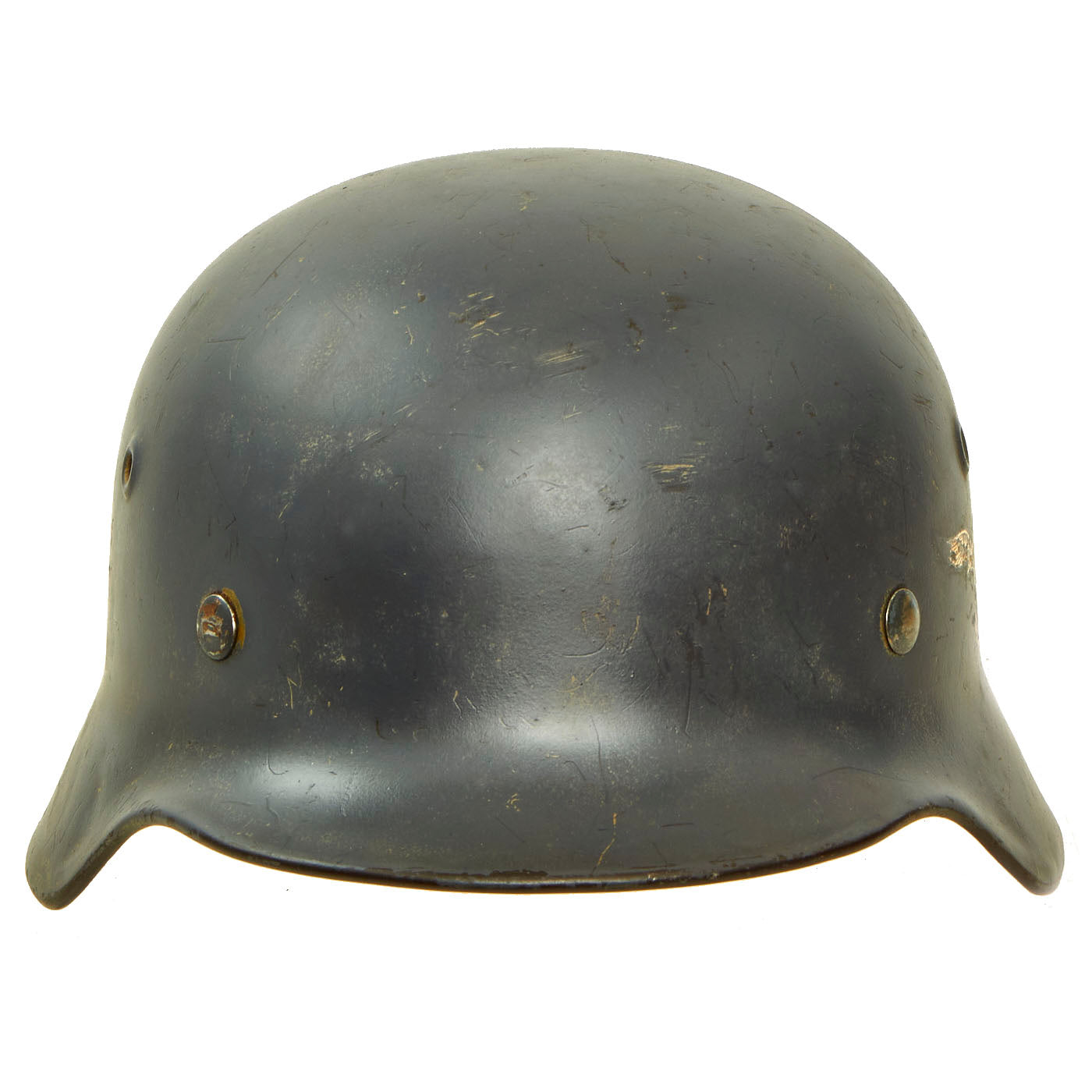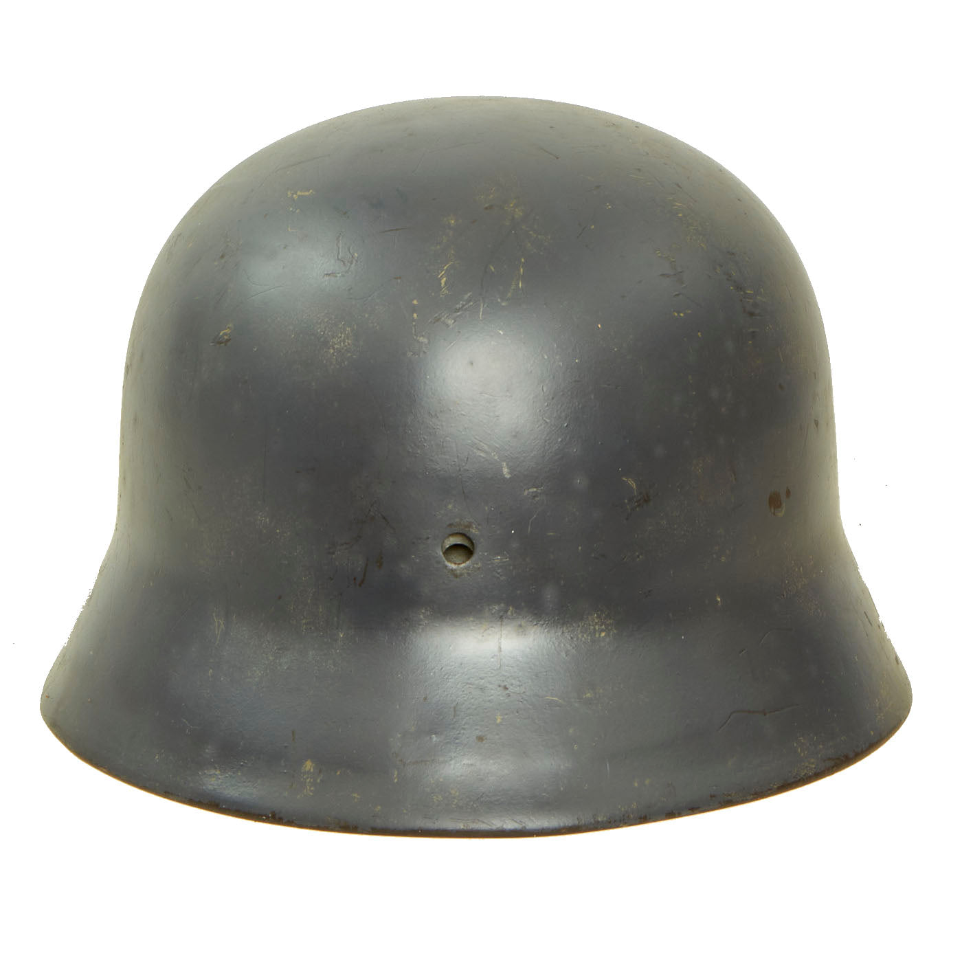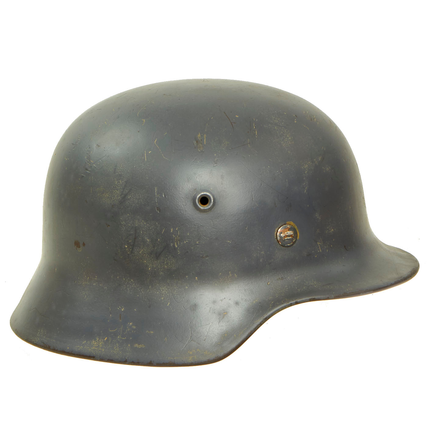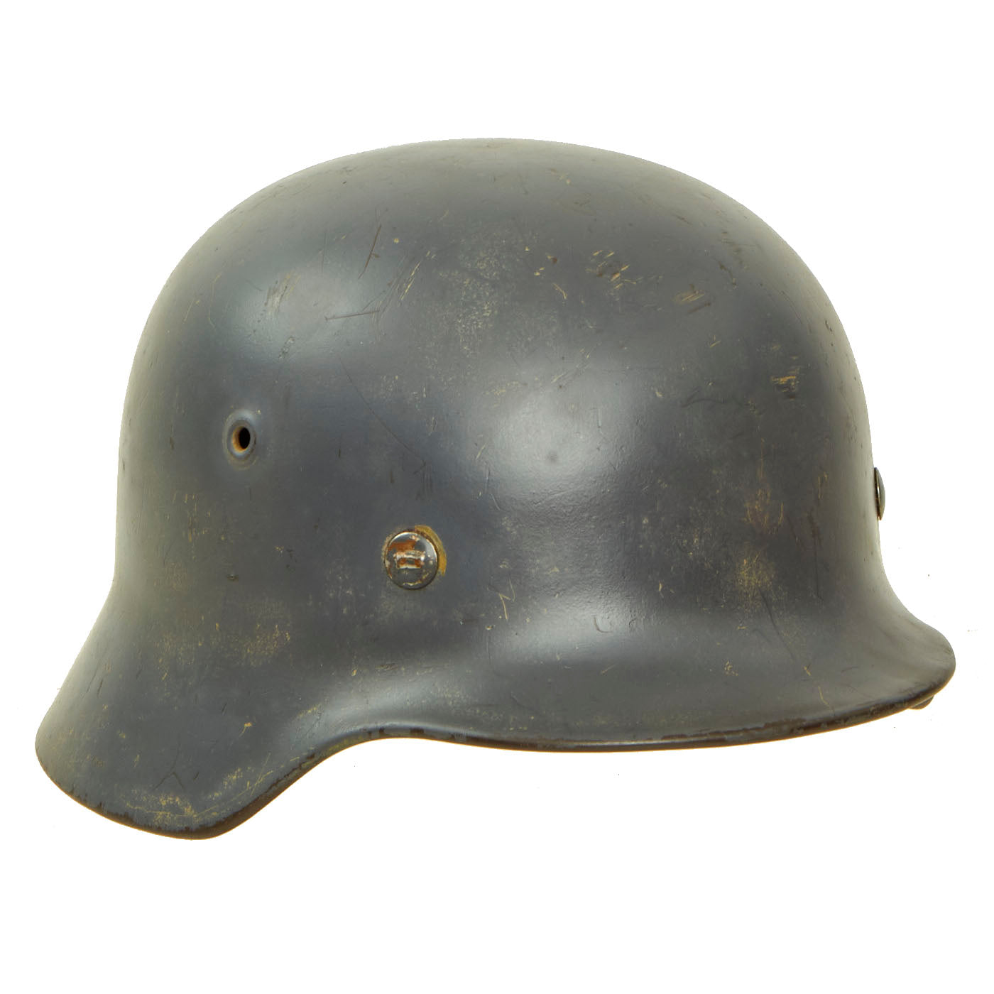 Original Item: Only One Available. This is a great original example Model 1940 German WWII helmet with a single Luftwaffe Eagle decal. The exterior paint of this helmet shows wear, and there are remnants of a camouflage paint job, which looks to have been removed during the war, or possibly post war so that the decal was easier to see. It now retains helmet retains over 80% of the original smooth Luftwaffe Fliegerblau (Flyer's Blue) Blue-Gray paint, and really has a great look! The decal is unfortunately a bit worse off, looking like it did not adhere well to to paint, and is retained at probably about 60%, though it is still undeniably a Luftwaffe decal.