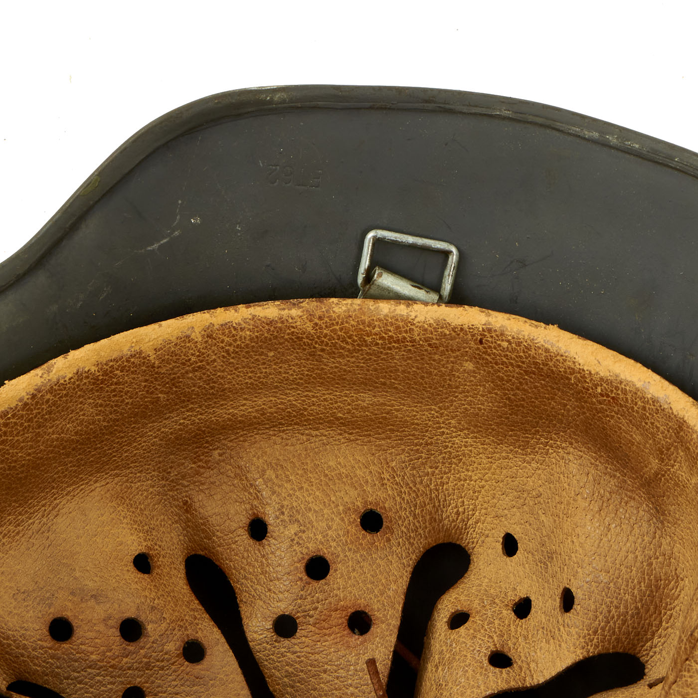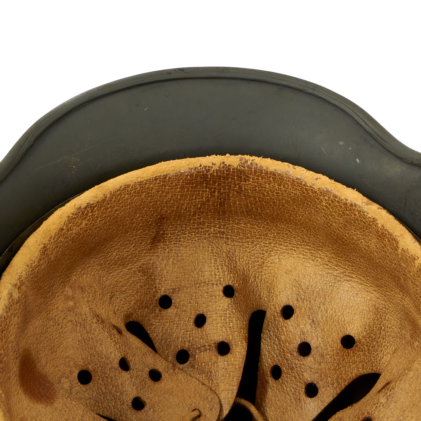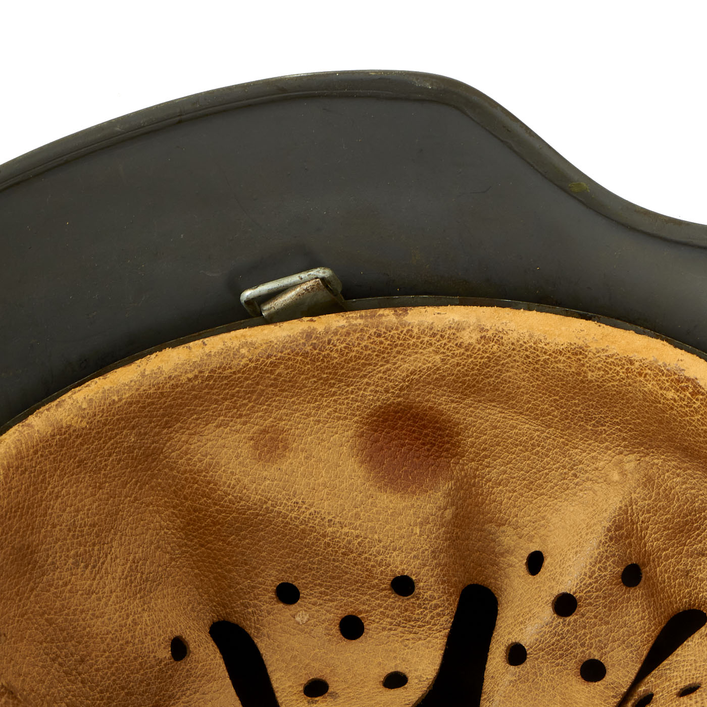 Two of the three original liner retaining pins are present (rear pin is missing), with both still retaining some of the original paint. The interior of the helmet still has an original M31 leather liner, which is in very good lightly worn condition. All eight "Fingers" are present, with much of the original finish, and there is even a clear 54 in a circle stamp on one. The top tie strap is still present and threaded through the liner. The mid war issue galvanized steel liner band is marked on the left outer side with 62 n.A. / 54, indicating that the liner band is a size 54, intended for a 62 shell. The right side displays the full manufacture information, as well as a date: