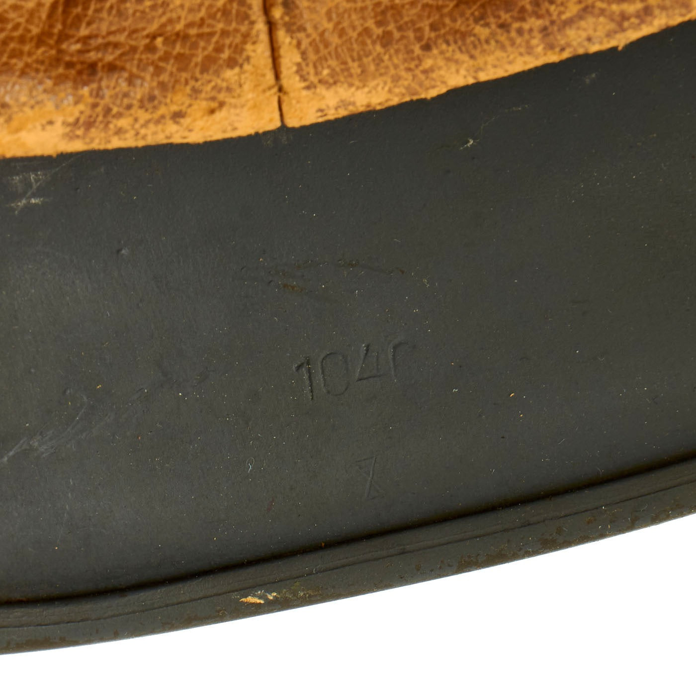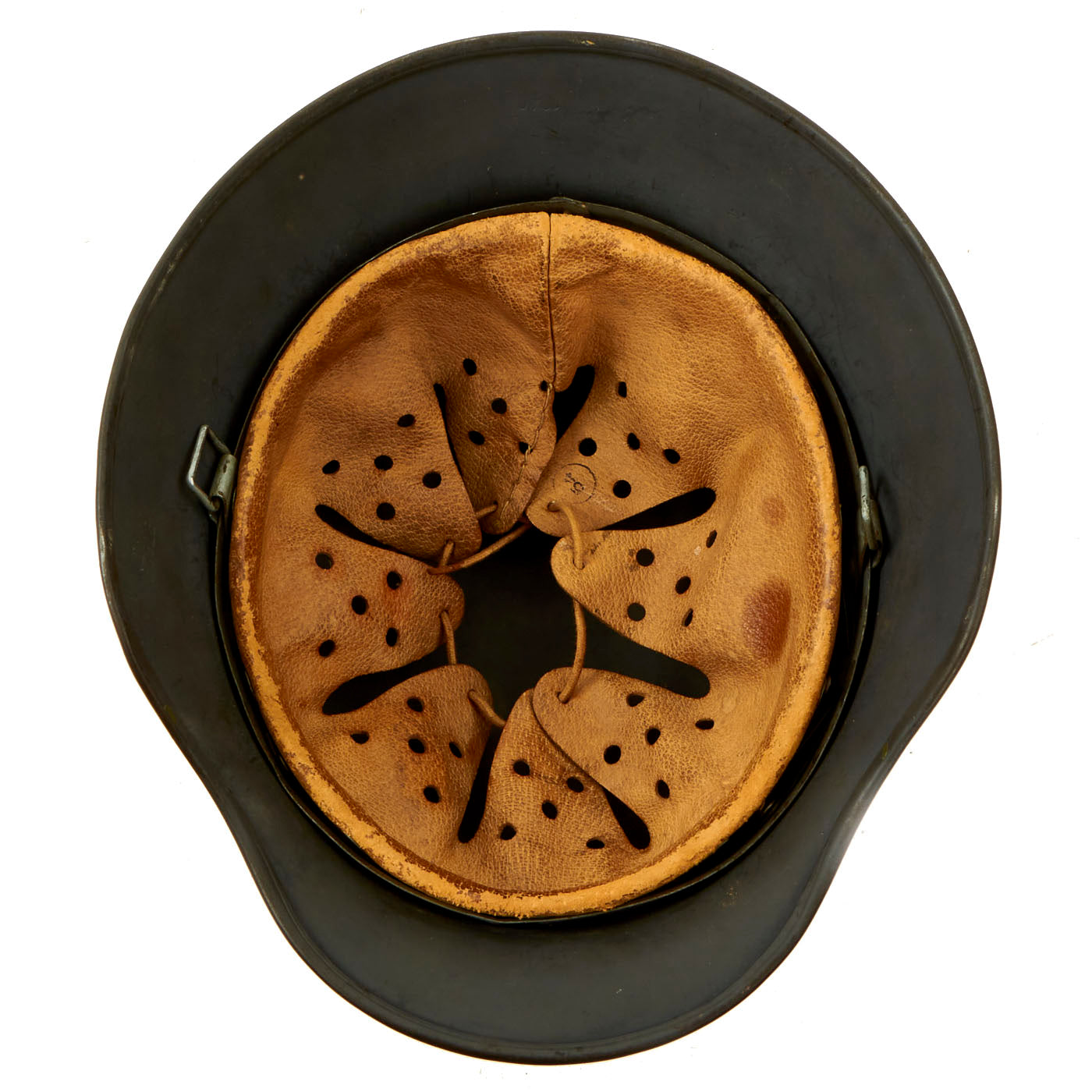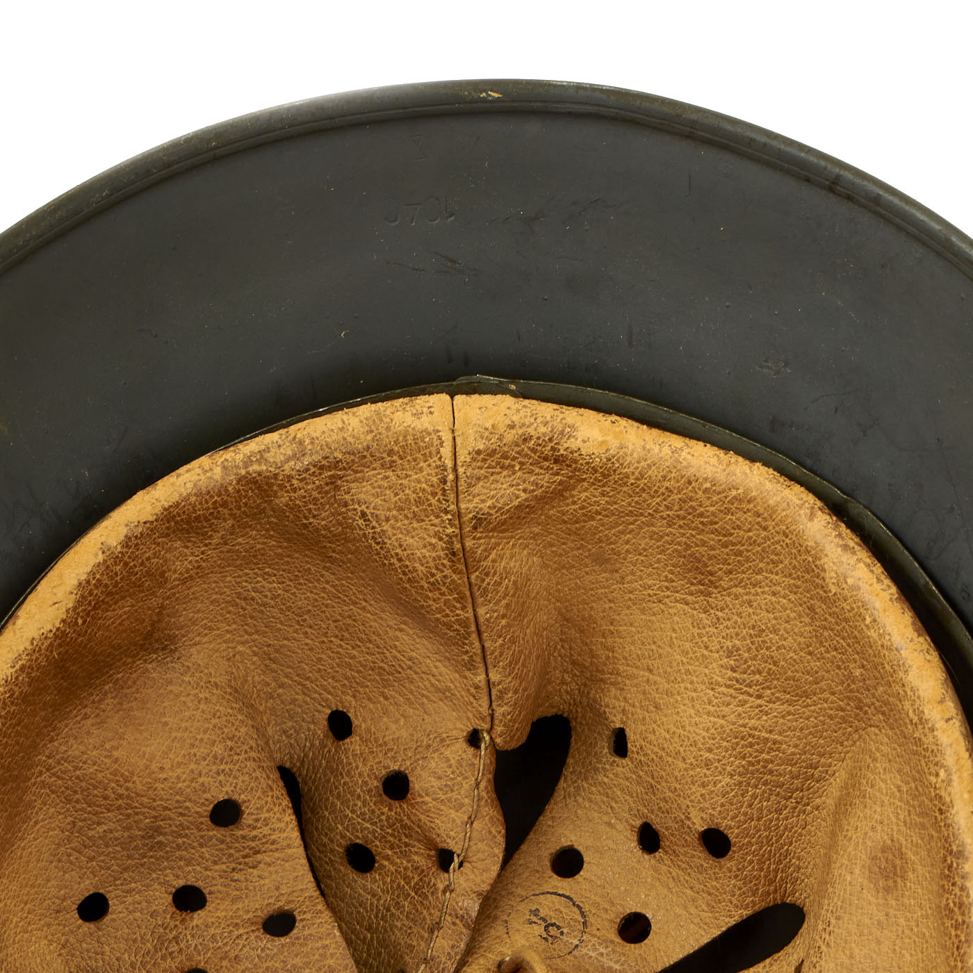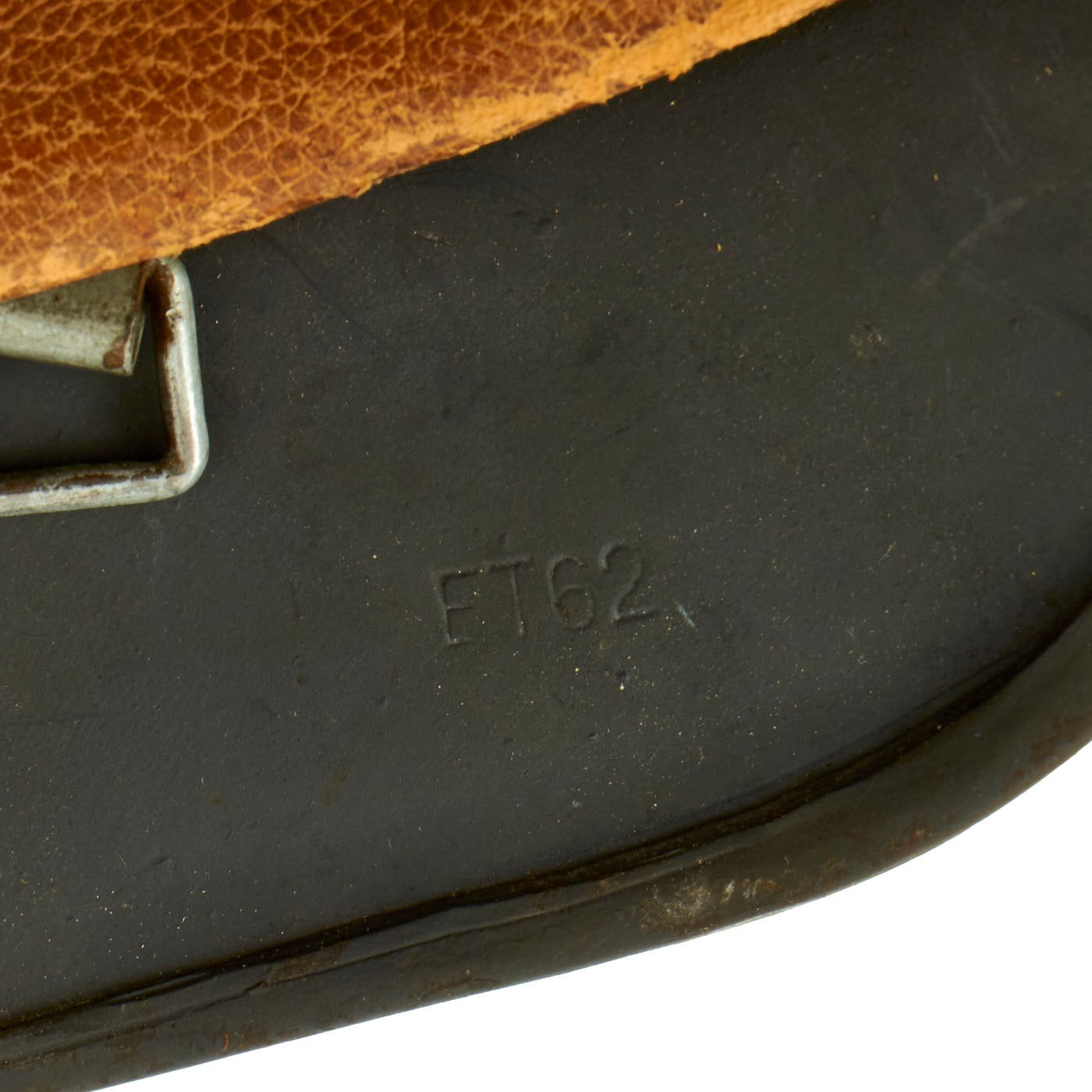 Two of the three original liner retaining pins are present (rear pin is missing), with both still retaining some of the original paint. The interior of the helmet still has an original M31 leather liner, which is in very good lightly worn condition. All eight "Fingers" are present, with much of the original finish, and there is even a clear 54 in a circle stamp on one. The top tie strap is still present and threaded through the liner. The mid war issue galvanized steel liner band is marked on the left outer side with 62 n.A. / 54, indicating that the liner band is a size 54, intended for a 62 shell. The right side displays the full manufacture information, as well as a date:
