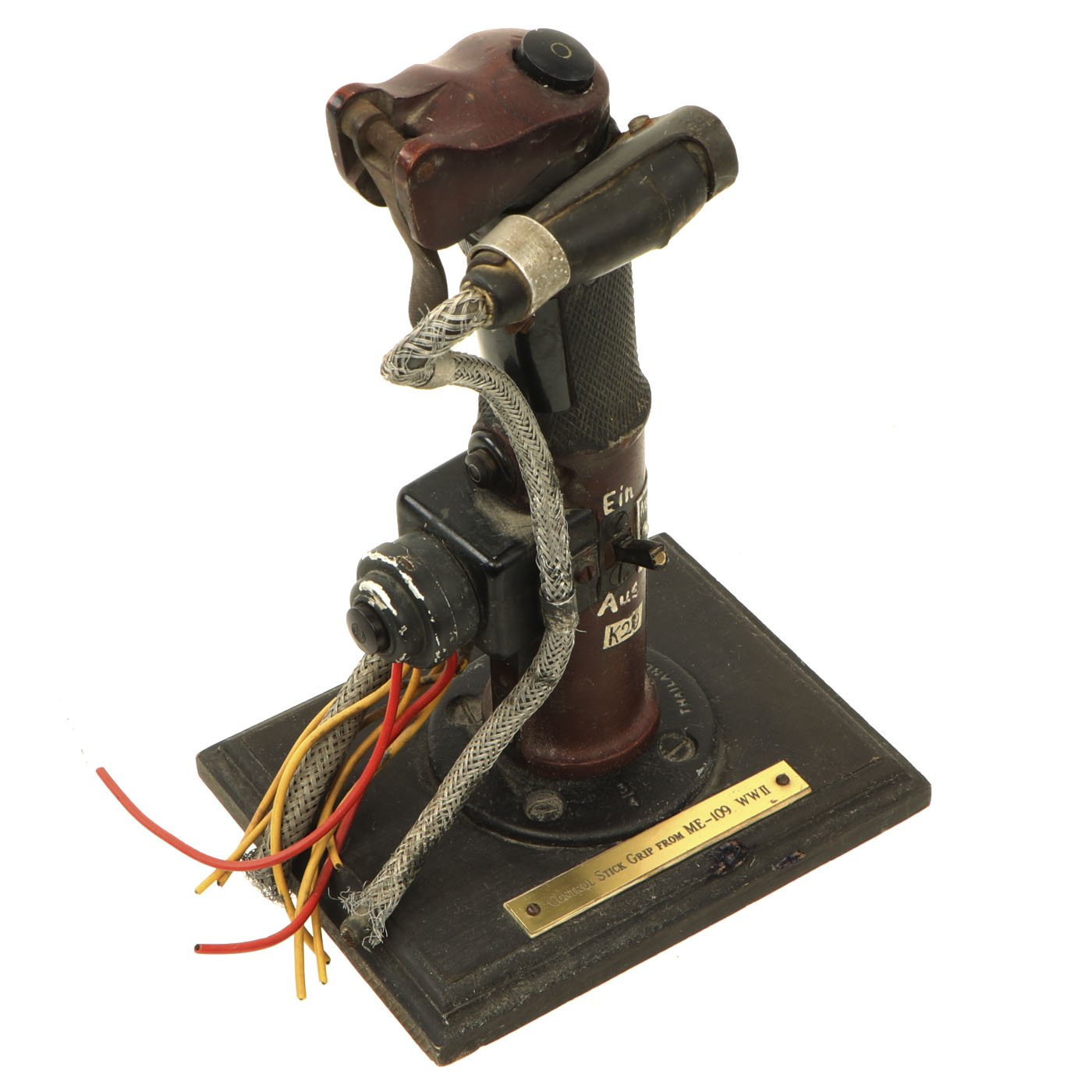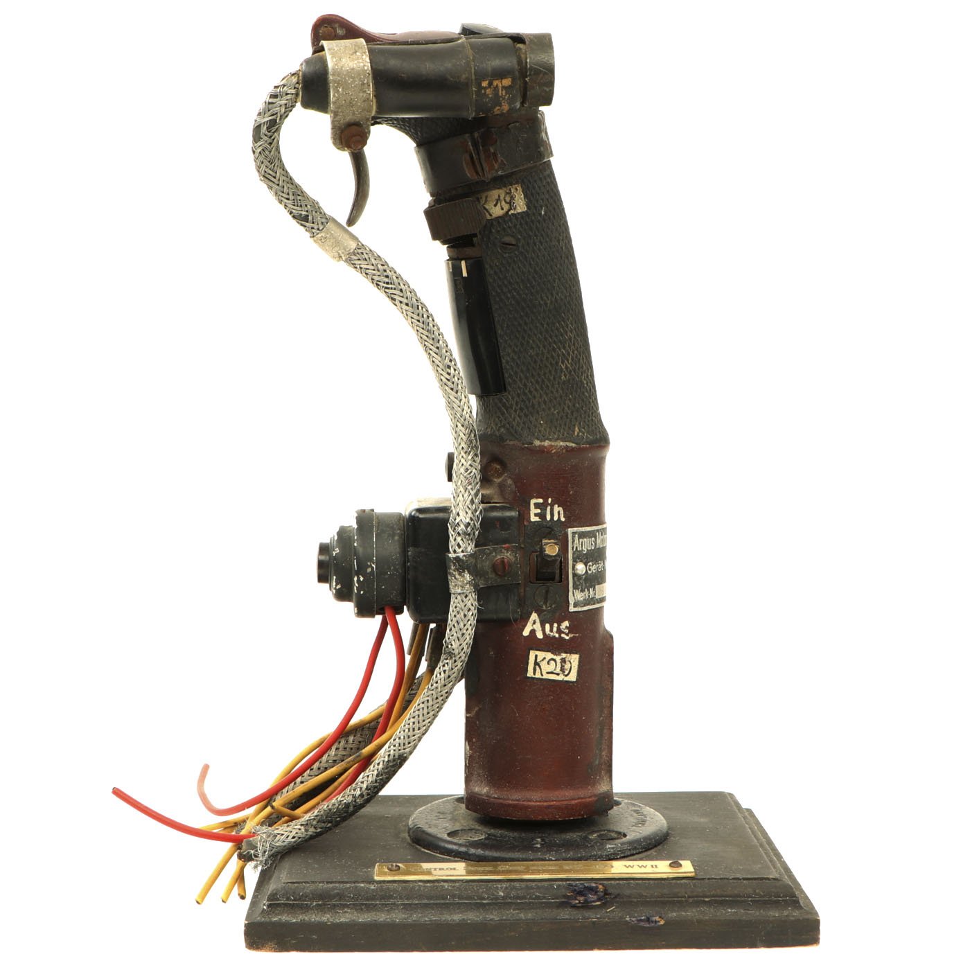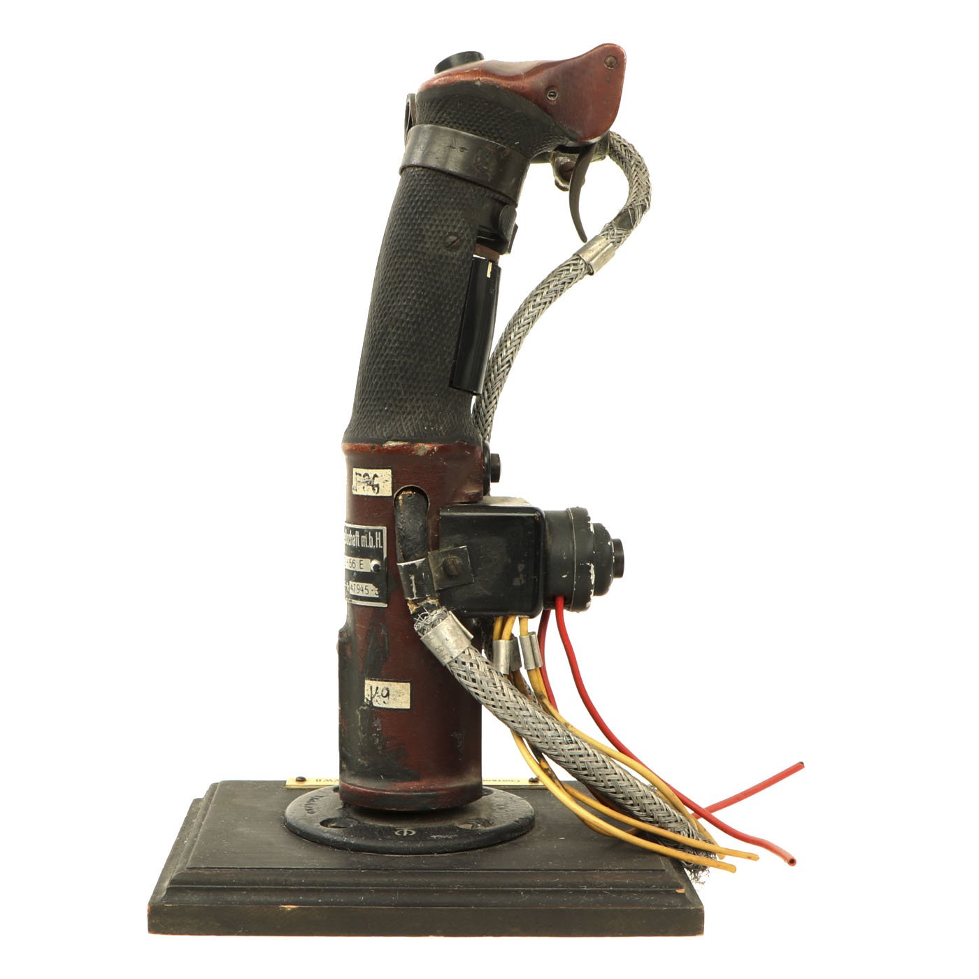 This is an incredibly rare Messerschmitt Bf 109 Control Stick, complete with machine gun flip down trigger! This particular KG12E was produced by Original Bruhn (which also produced various instruments for the Luftwaffe) after a design of the Argus Motoren G.m.b.H. in Berlin. The Geraete-Nummer is 102-56 E. The letter "E" was stamped into the data plate and was the designation for the sub-type of the KG12, obviously the KG12A. A KG12A had an "A" instead of an "E" but the same Fl-number. There is also a B.A. stamp (Bauaufsicht Luftwaffe) that shows that it went through Luftwaffe quality control. Fl.-Nr. is 47945. The KG12A didn't have a so-called B2-button which the later KG13 usually had (at the top left). There was only the top trigger and push button. Some early Me 109 had an additional button at the top attached by a clip or strap that was used for dropping bombs which is present on this example! The KG12E was used multiple airplanes including the Me 109 E, Ju 87 B and other aircraft. This example is offered in excellent condition. It measures 12 inches tall and is mounted on a wood base. A truly rare and wonderful piece of WW2 aviation history!