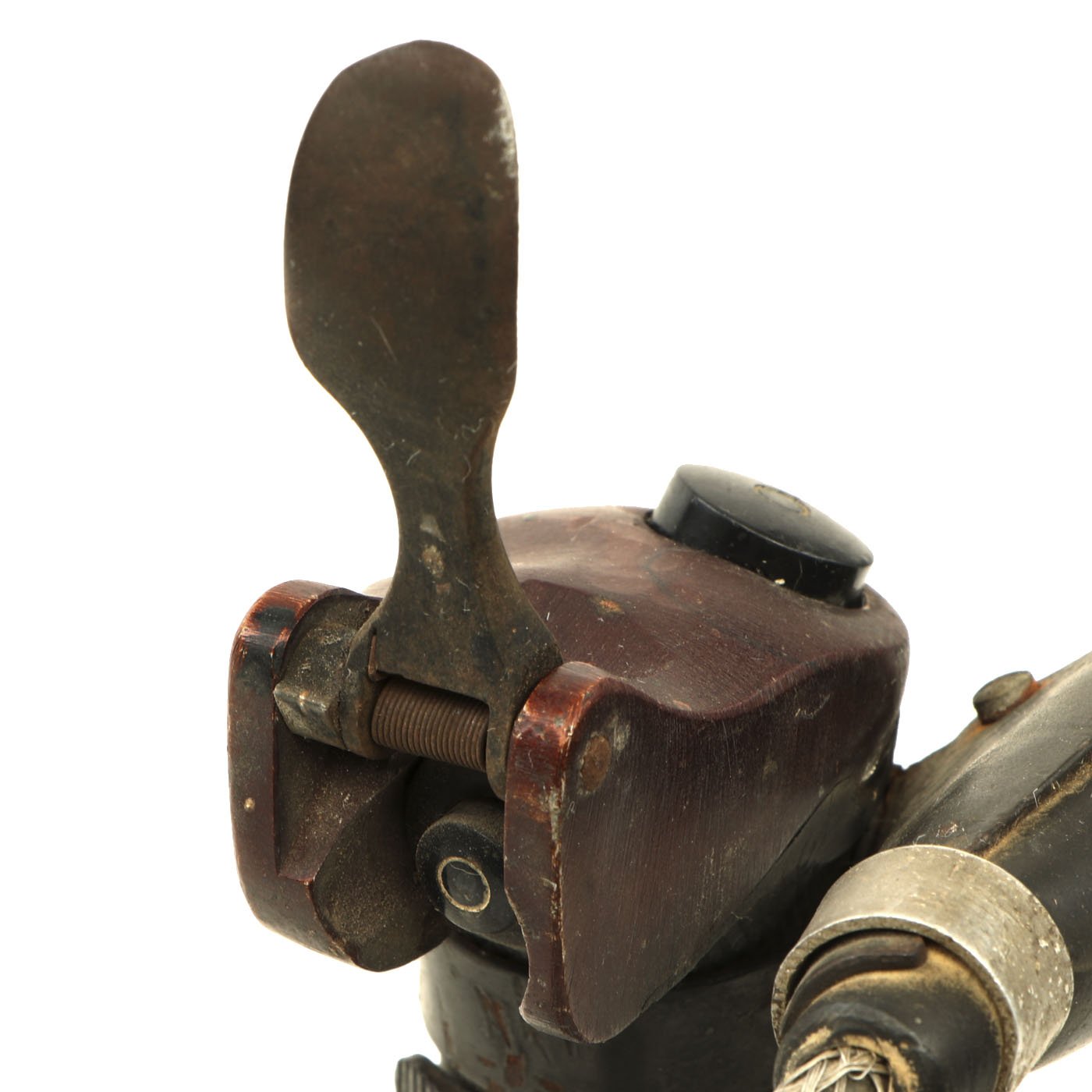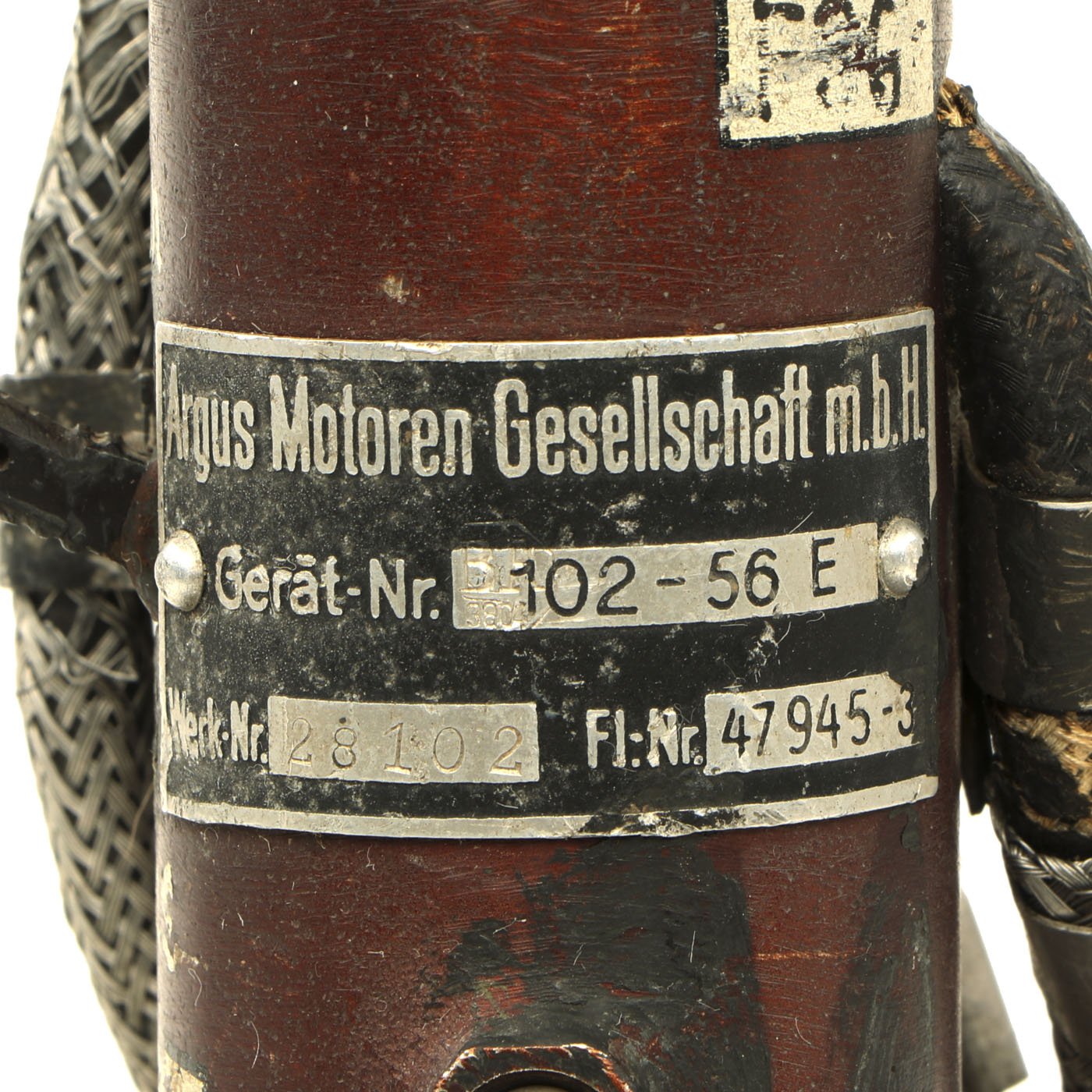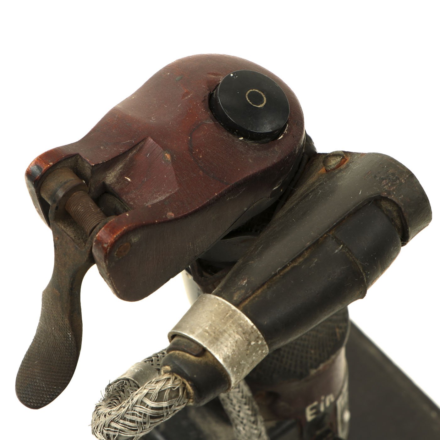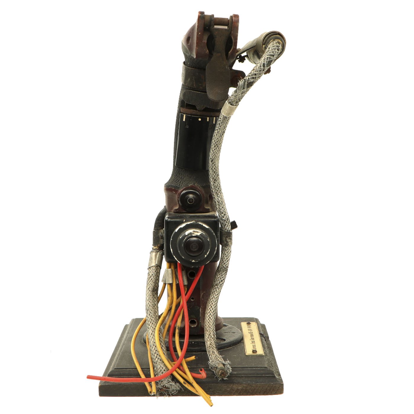 This is an incredibly rare Messerschmitt Bf 109 Control Stick, complete with machine gun flip down trigger! This particular KG12E was produced by Original Bruhn (which also produced various instruments for the Luftwaffe) after a design of the Argus Motoren G.m.b.H. in Berlin. The Geraete-Nummer is 102-56 E. The letter "E" was stamped into the data plate and was the designation for the sub-type of the KG12, obviously the KG12A. A KG12A had an "A" instead of an "E" but the same Fl-number. There is also a B.A. stamp (Bauaufsicht Luftwaffe) that shows that it went through Luftwaffe quality control. Fl.-Nr. is 47945. The KG12A didn't have a so-called B2-button which the later KG13 usually had (at the top left). There was only the top trigger and push button. Some early Me 109 had an additional button at the top attached by a clip or strap that was used for dropping bombs which is present on this example! The KG12E was used multiple airplanes including the Me 109 E, Ju 87 B and other aircraft. This example is offered in excellent condition. It measures 12 inches tall and is mounted on a wood base. A truly rare and wonderful piece of WW2 aviation history!