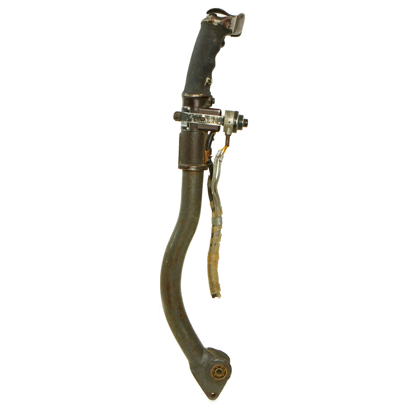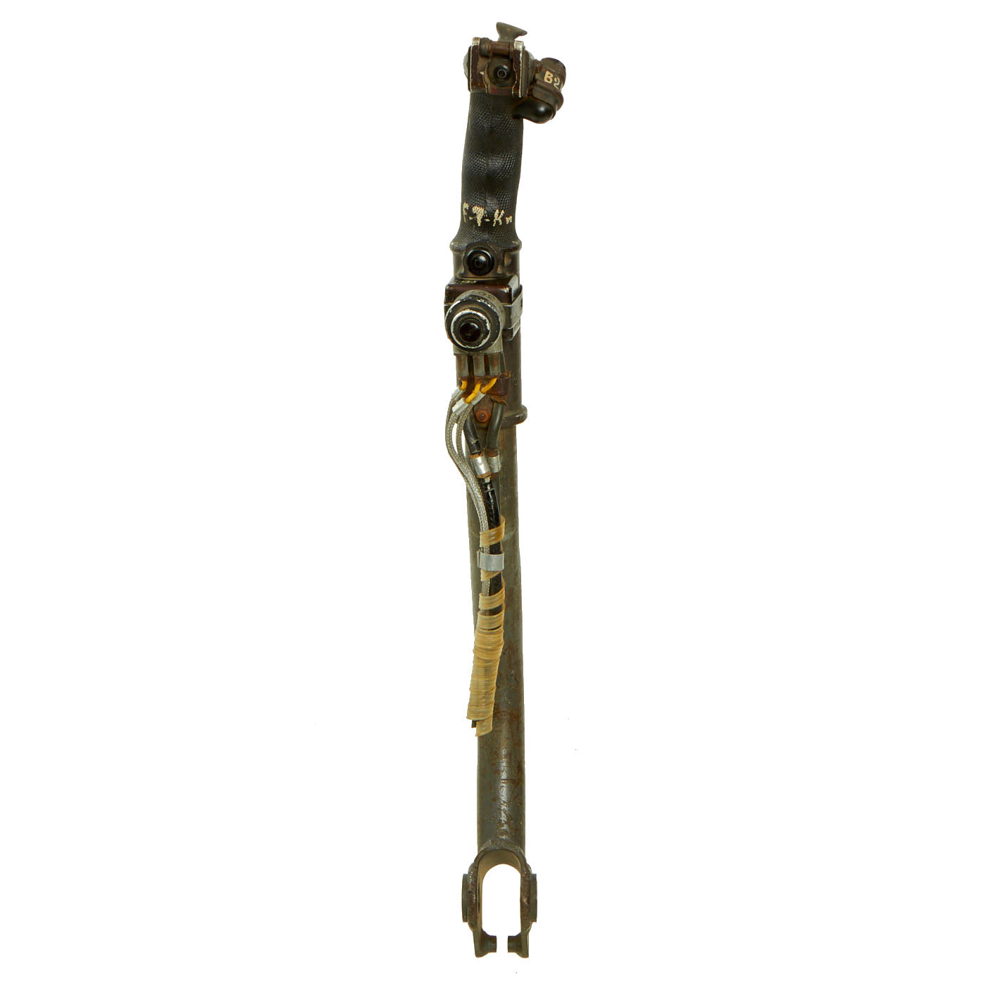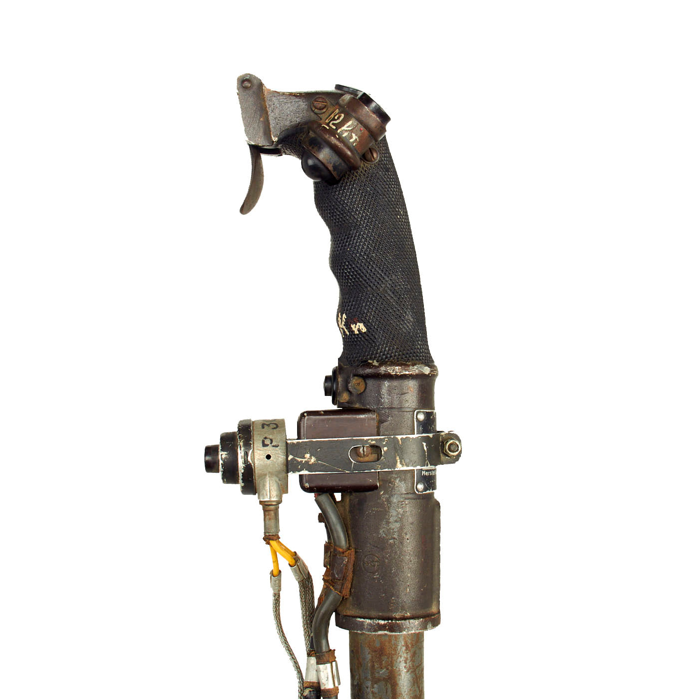 This is an incredibly rare Messerschmitt Bf 109 Control Stick, complete with machine gun flip down trigger! This particular KG13 A was produced by Luftfahrt-Apparatebau GmbH (which also produced various instruments for the Luftwaffe) in Berlin as indicated by three letter code ngk. The Geräte-Nummer is 102-288 A. The letter "A" was stamped into the data plate and was the designation for the sub-type of the KG13, obviously the KG13A. A KG13A had an "A" instead of an "E" but the same Fl-number. Fl.-Nr. is 47915. The KG13A didn't has a so-called B2-button which the earlier KG12 did not have. There was only the top trigger and push button. Some early Me 109 had an additional button at the top attached by a clip or strap that was used for dropping bombs which is present on this example! The KG13A was used by multiple airplanes including the Me 109 E, Ju 87 B and other aircraft. This example is offered in excellent condition. It measures 25 inches tall and is still mounted on the “stick”.