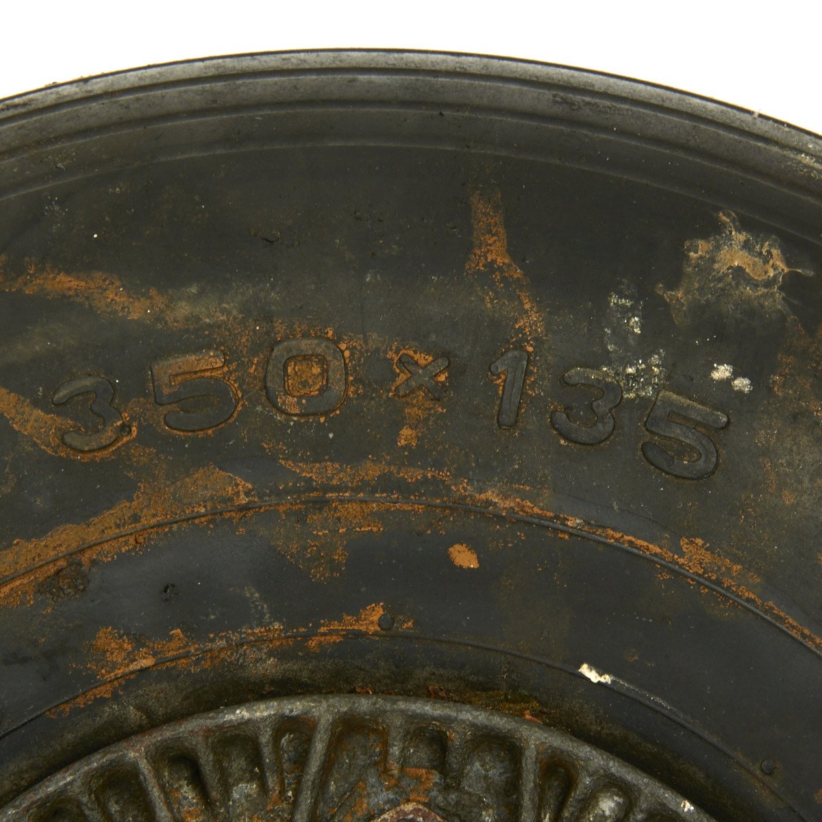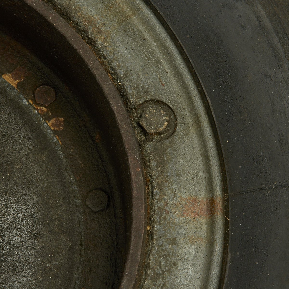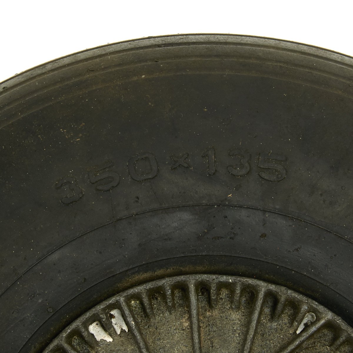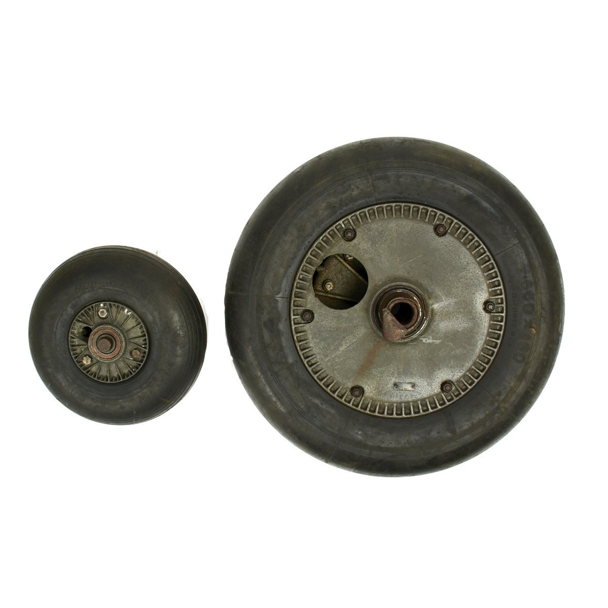 This is a set of 2 wheels, front and rear, complete with rims and original rubber tires. The large where has approximately a 25 diameter and the small has approximately a 13 diameter. They are both marked nicely as follows: