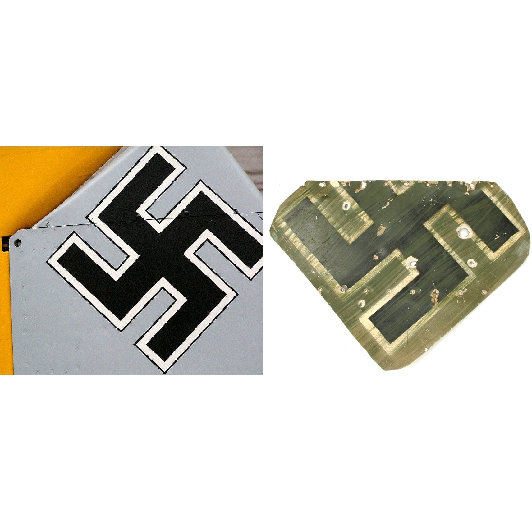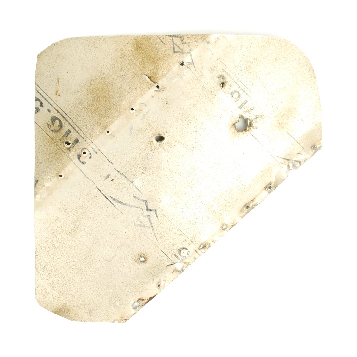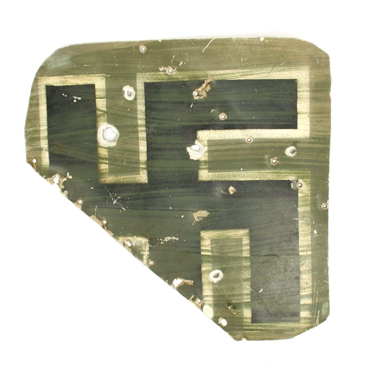 This is an aluminum section of the rear horizontal stabilizer or tail fin. The Swas is 75% complete and has correct camouflage over paint above the base grey and black/white of the swas. The Swas measures 13.5" x 13.5' with a 16" diagonal tip-to-tip measurement. This size is correct for the size of the swass on the BF 109E series. Period photos allow one to make a comparison of the swas size to that of the rear wheel (13" diameter) where the swas is approximately 20% larger. The aluminum shows original rivet lines and bullet/shrapnel damage. The reverse shows original aluminum and/or aircraft manufacturer maker markings as follows: