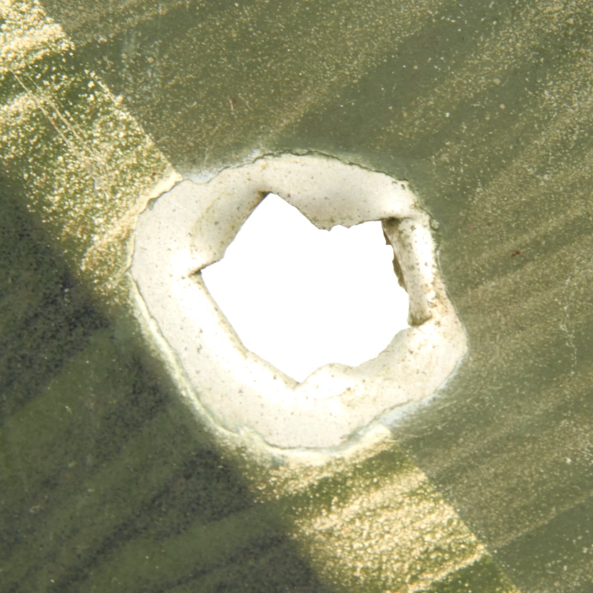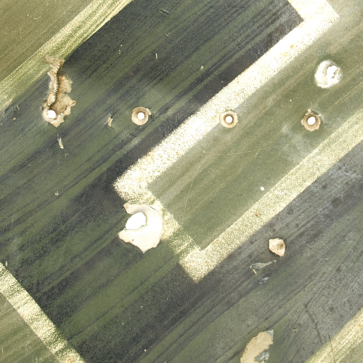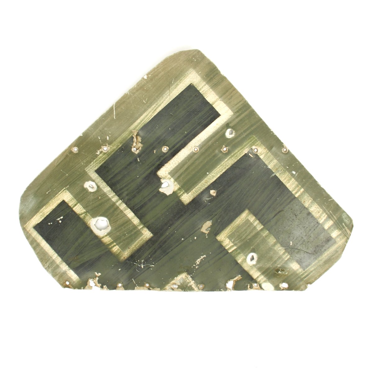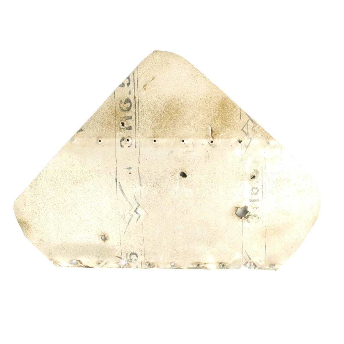 This is an aluminum section of the rear horizontal stabilizer or tail fin. The Swas is 75% complete and has correct camouflage over paint above the base grey and black/white of the swas. The Swas measures 13.5" x 13.5' with a 16" diagonal tip-to-tip measurement. This size is correct for the size of the swass on the BF 109E series. Period photos allow one to make a comparison of the swas size to that of the rear wheel (13" diameter) where the swas is approximately 20% larger. The aluminum shows original rivet lines and bullet/shrapnel damage. The reverse shows original aluminum and/or aircraft manufacturer maker markings as follows: