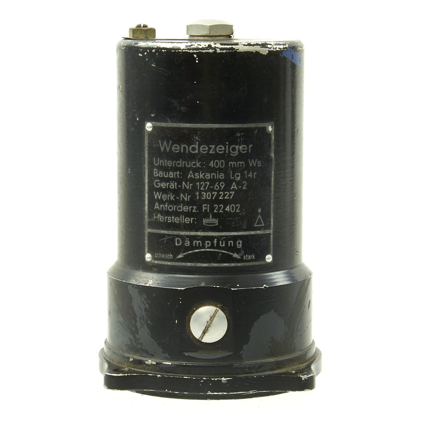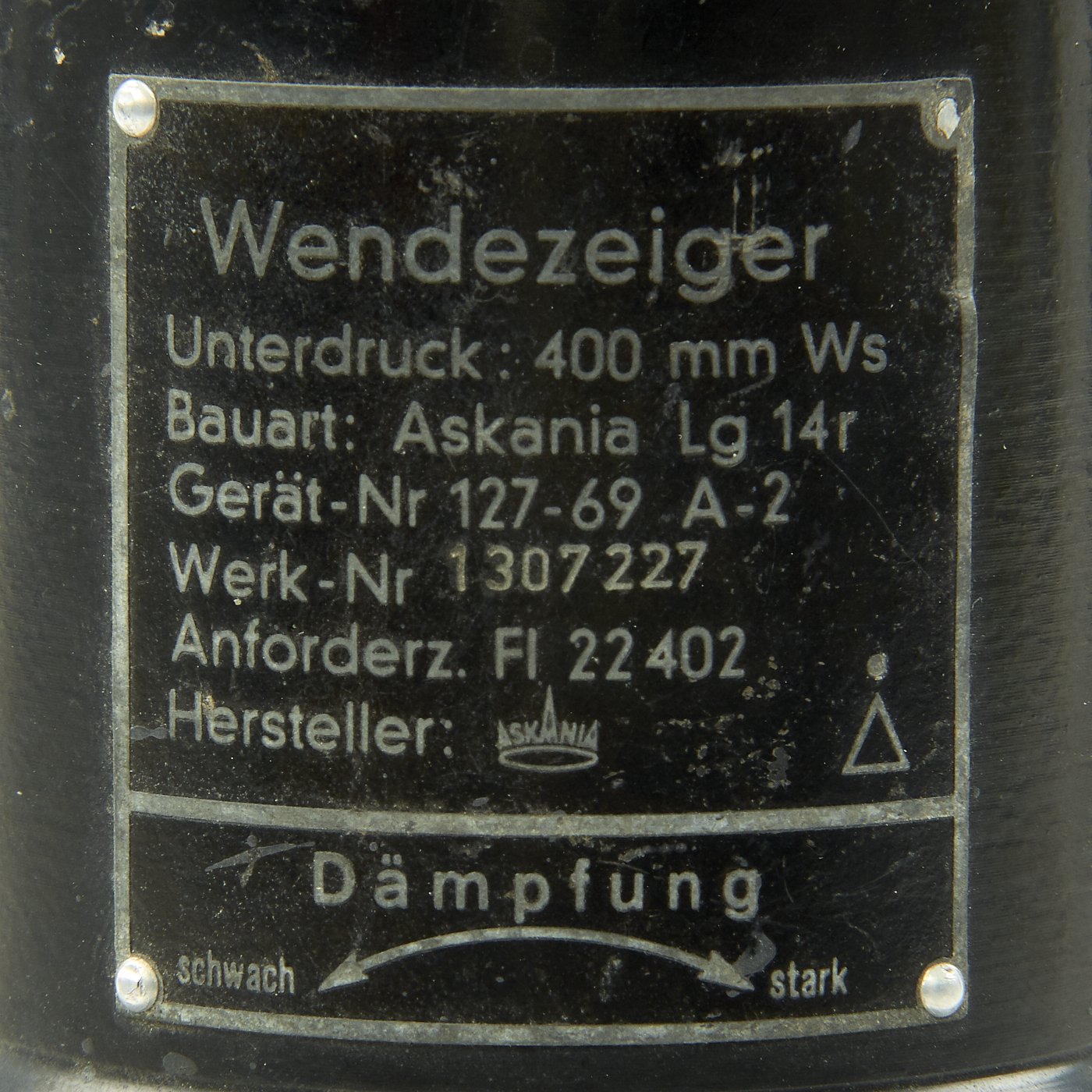 The face is well marked with maker Askania as well as Work Number W1307227 and Luftwaffe number Fl. 22402. It has two indicators: the top is marked DREHT (turns), and has a needle indicator that moves between L and R. The lower is marked HÄNGT (hangs), which is a water filled indicator with a steel ball inside, that measures orientation / acceleration from banking. The fitting for the pressure tube is still intact, and the Dämpfung (Damping) adjustment bolt is still present.
