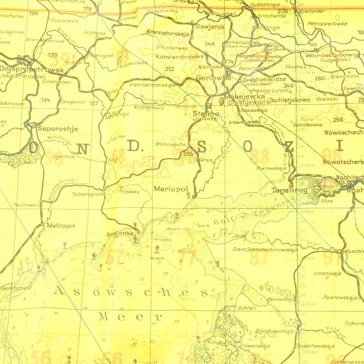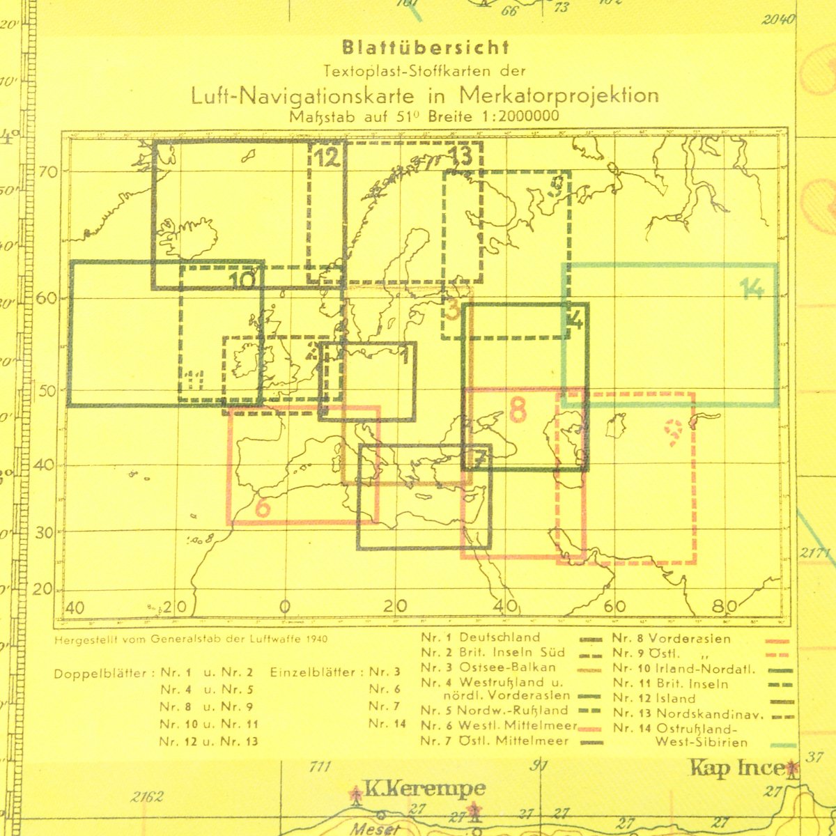 This is an true air navigation map in Mercator projection and was printed in 1940. These maps were specifically produced for the Luftwaffe, and coordinates were different from the army and navy!