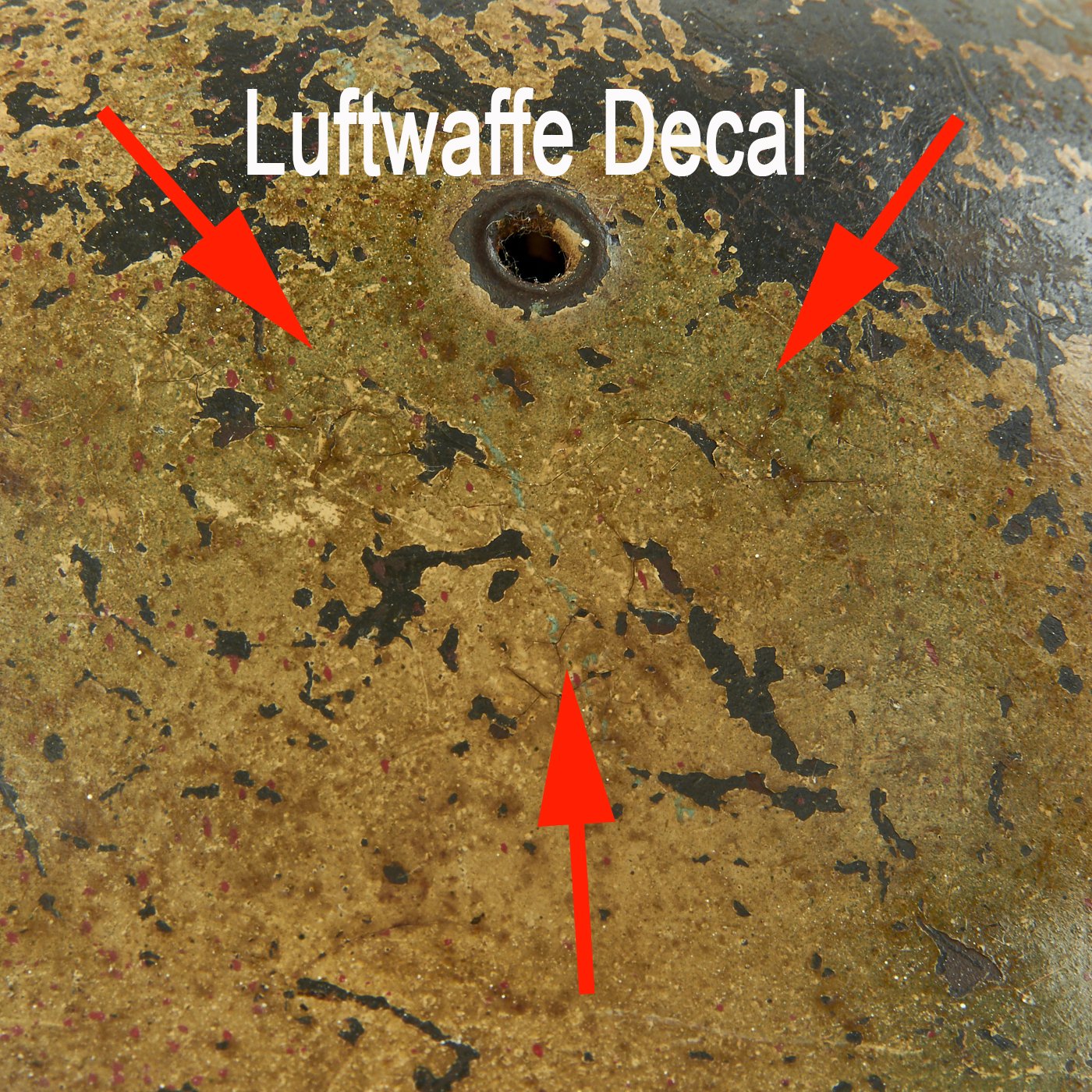 This stamped sheet steel construction helmet retains much of its original Normand Camo paint but shows expected wear and use. The left side of the helmet features a Luftwaffe eagle decal which was painted over. The outline of the decal can be both seen and felt beneath the paint.