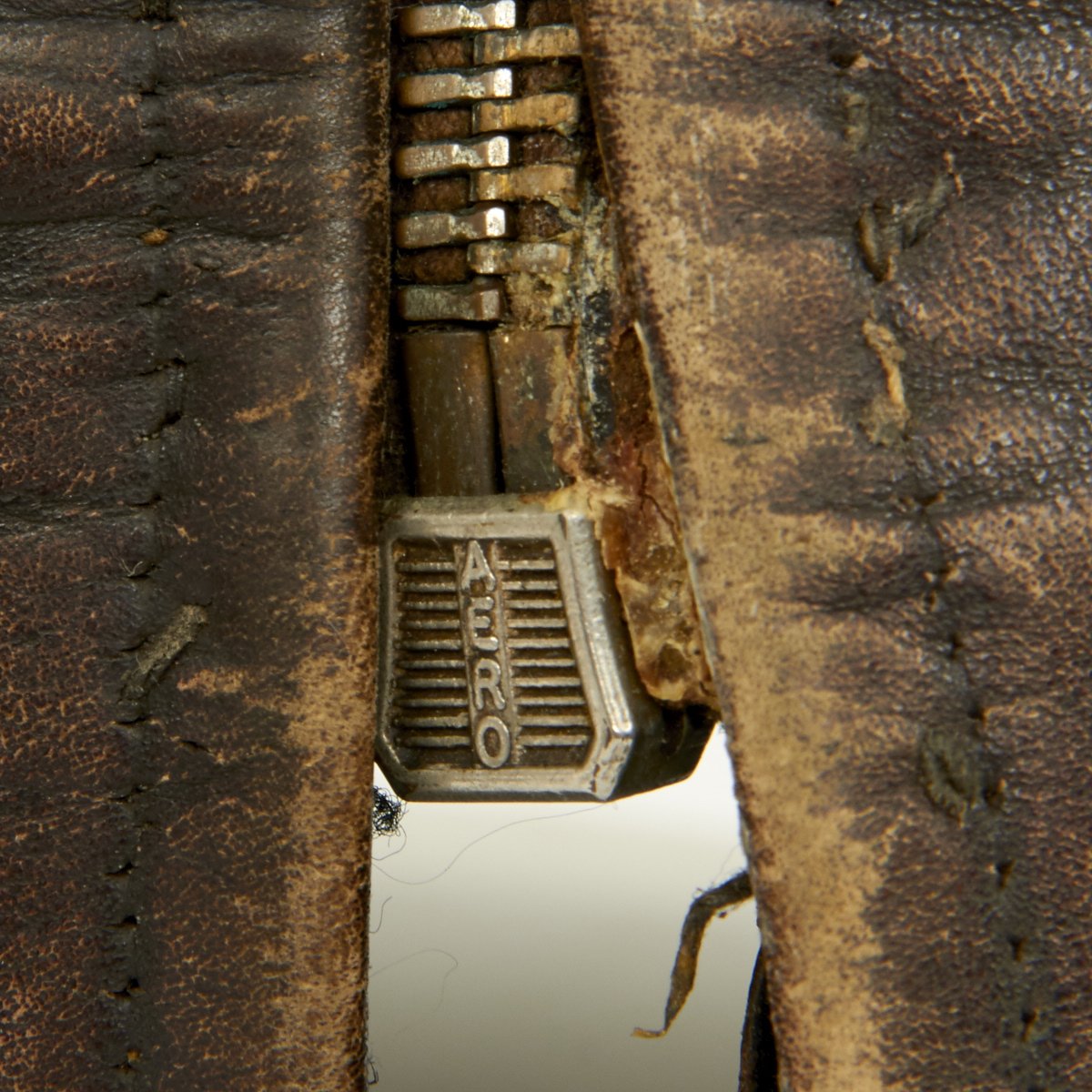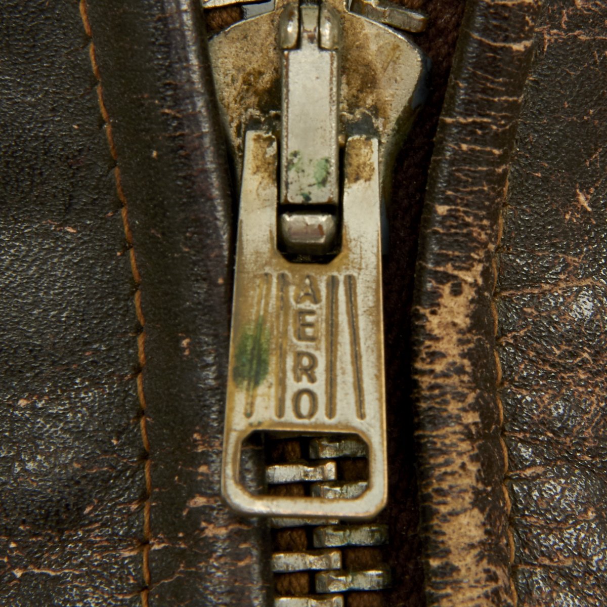 This example is a very high quality, French made private purchase, non-regulation, multi-panel chocolate brown leather construction fully lined, waist length, flight jacket with a lay down collar. The jacket features a vertical, front, zipper closure by AERO. The jacket has two horizontal slash breast pockets with zippers and two hip pockets with cover flaps. The sleeves are straight cut and non-adjustable. Inside at the neck is a French tailor's maker label which reads Alcodin.