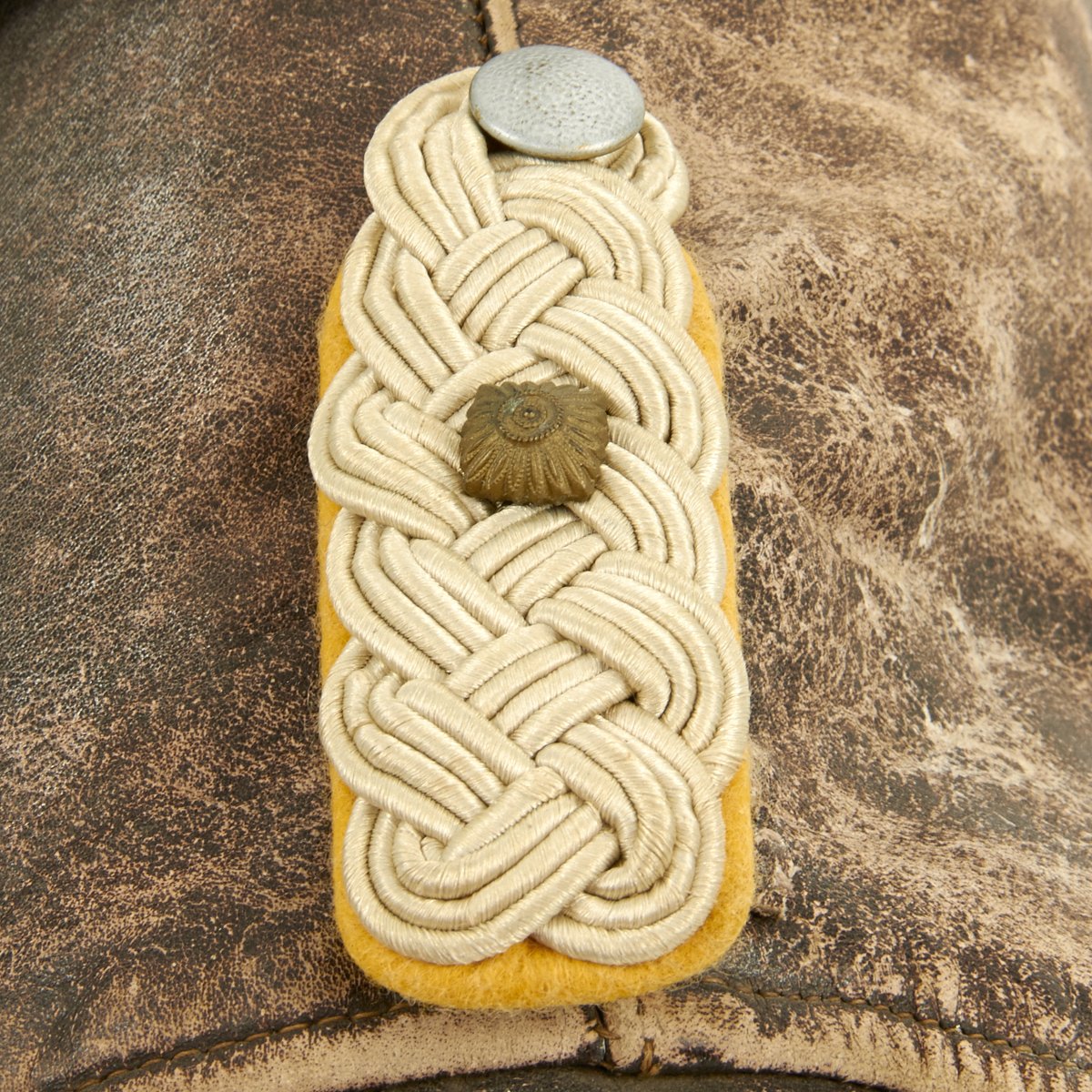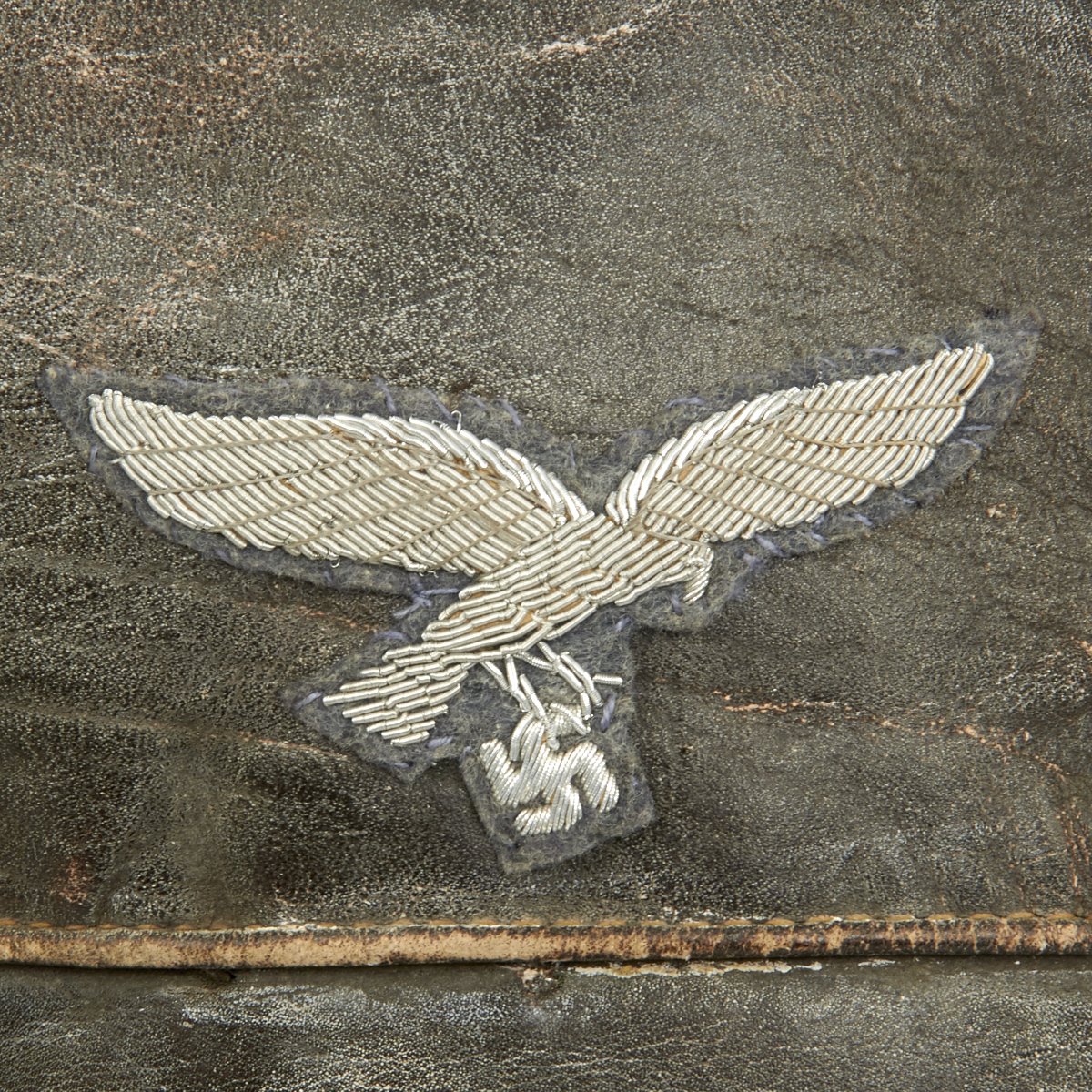 Slip on loops and buttons for shoulder boards, complete with two matching Oberstleutnant epaulets with fine silver/aluminum wire over yellow wool bases. Left breast features a heavily embroidered silver bullion Luftwaffe eagle with grey wool backing hand-stitched to the leather.
