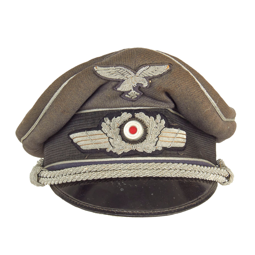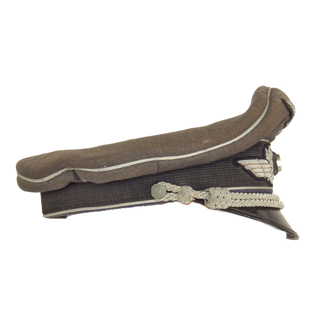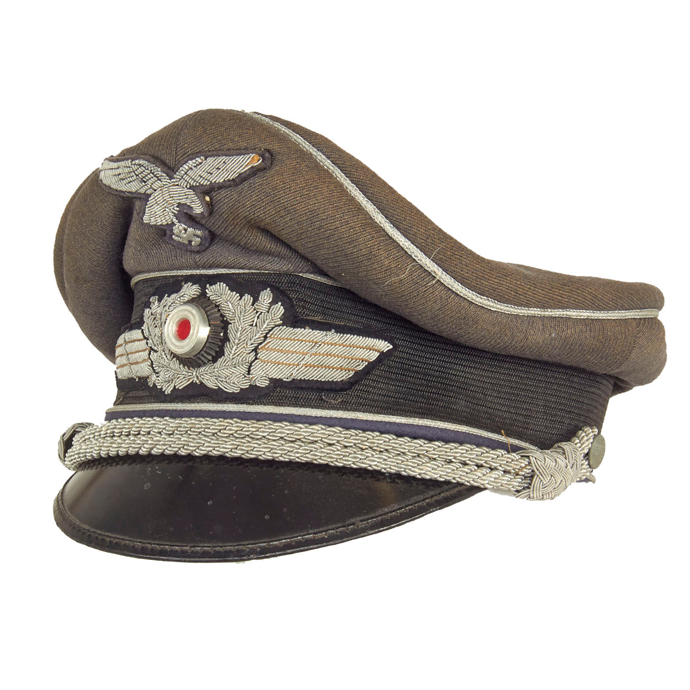Original Item: Only One Available. This is a very good condition Luftwaffe Officer's Schirmmütze Visor Cap, made by the very desirable EREL company, a top class maker of headwear during the war. An honest example with a wonderful swept back shape. It has the "crusher cap" saddle appearance, which we all love, with the standard high front.