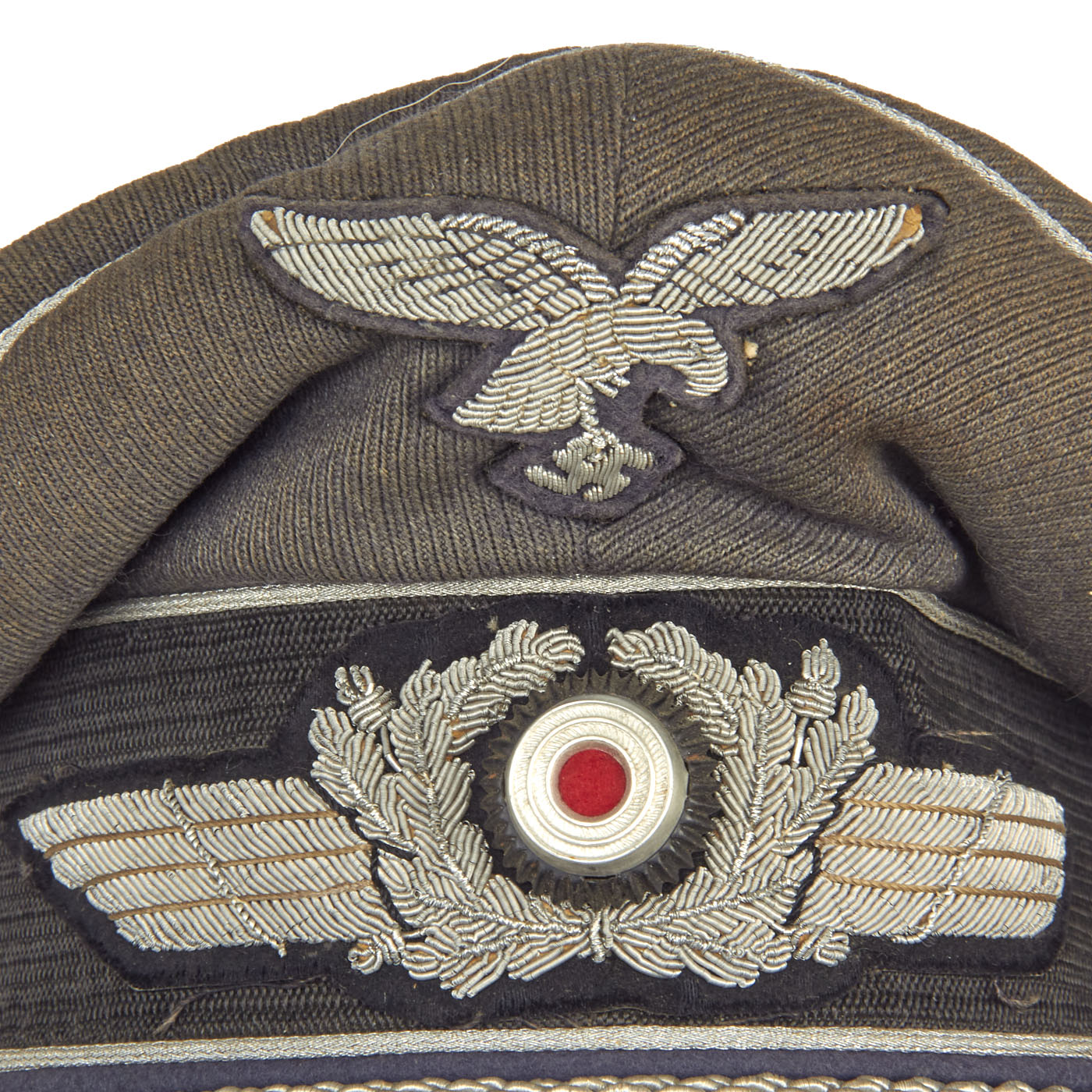 This Officer's Schirmmütze Visor Cap is a very high quality manufactured example. Fabricated in Luftwaffe blue gray Fliegerblau (Flier's Blue) "whipcord" wool, with wide black ribbed wool cap band, plus three rows of fine silver bullion piping around the circumference. It is fronted by a heavy bullion embroidered Luftwaffe insignia pair that includes a silver bullion national eagle on a wool backing above a high relief silver bullion oak leaf wreath with stylized wings and a metal tri color cockade.