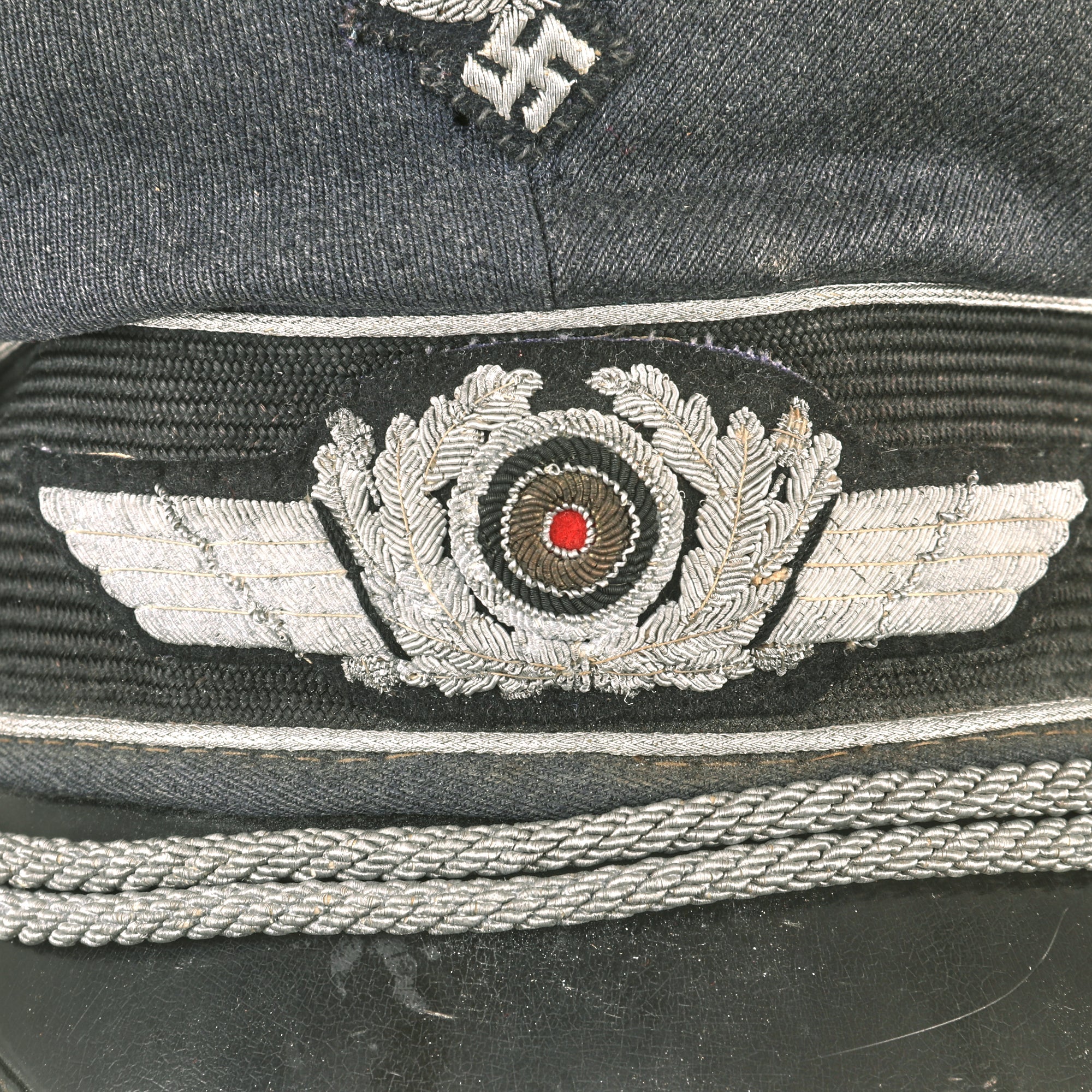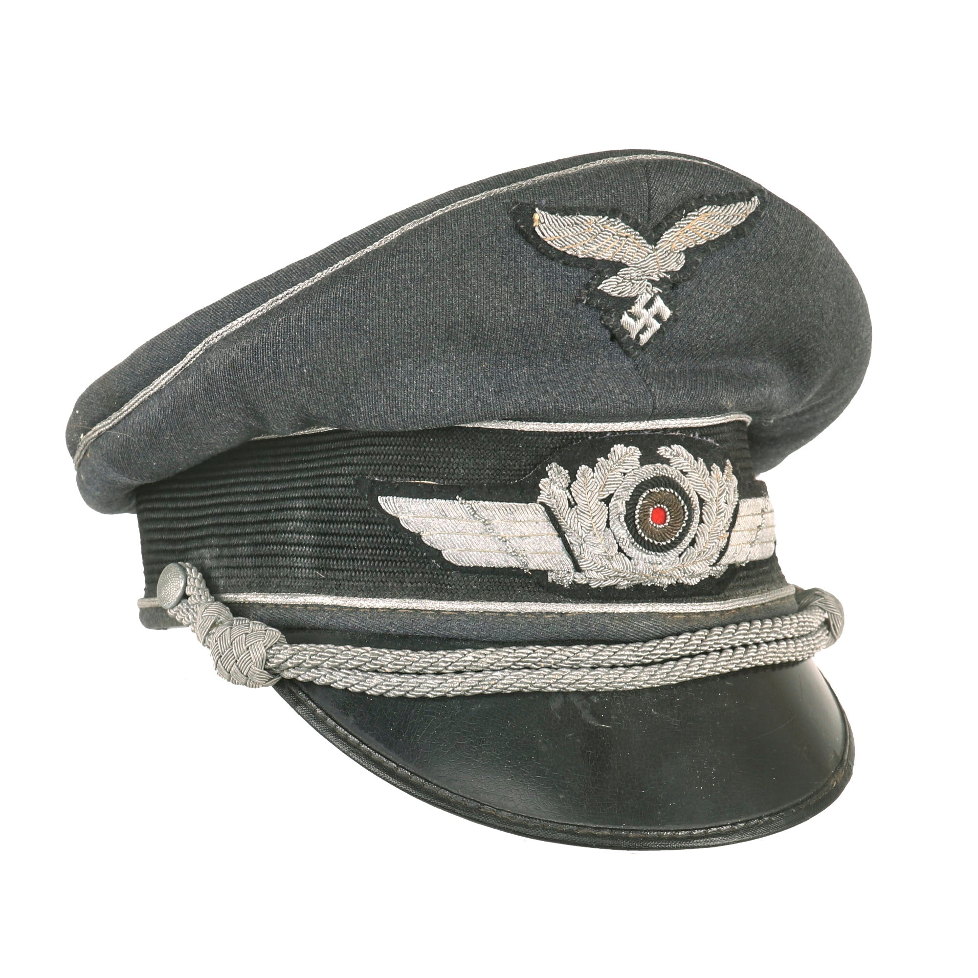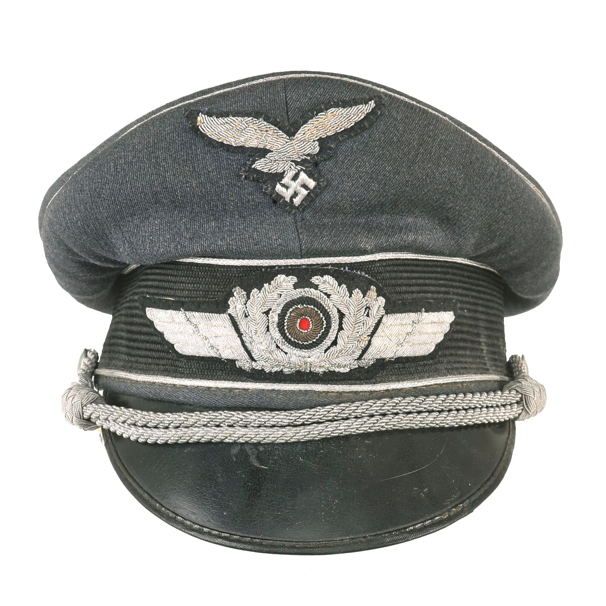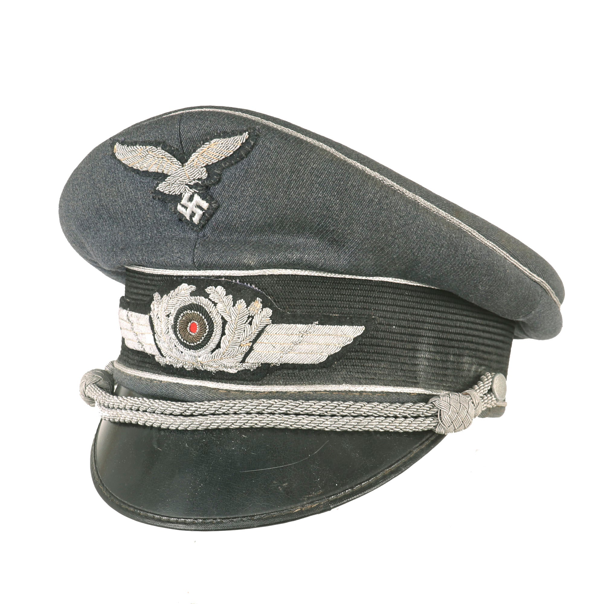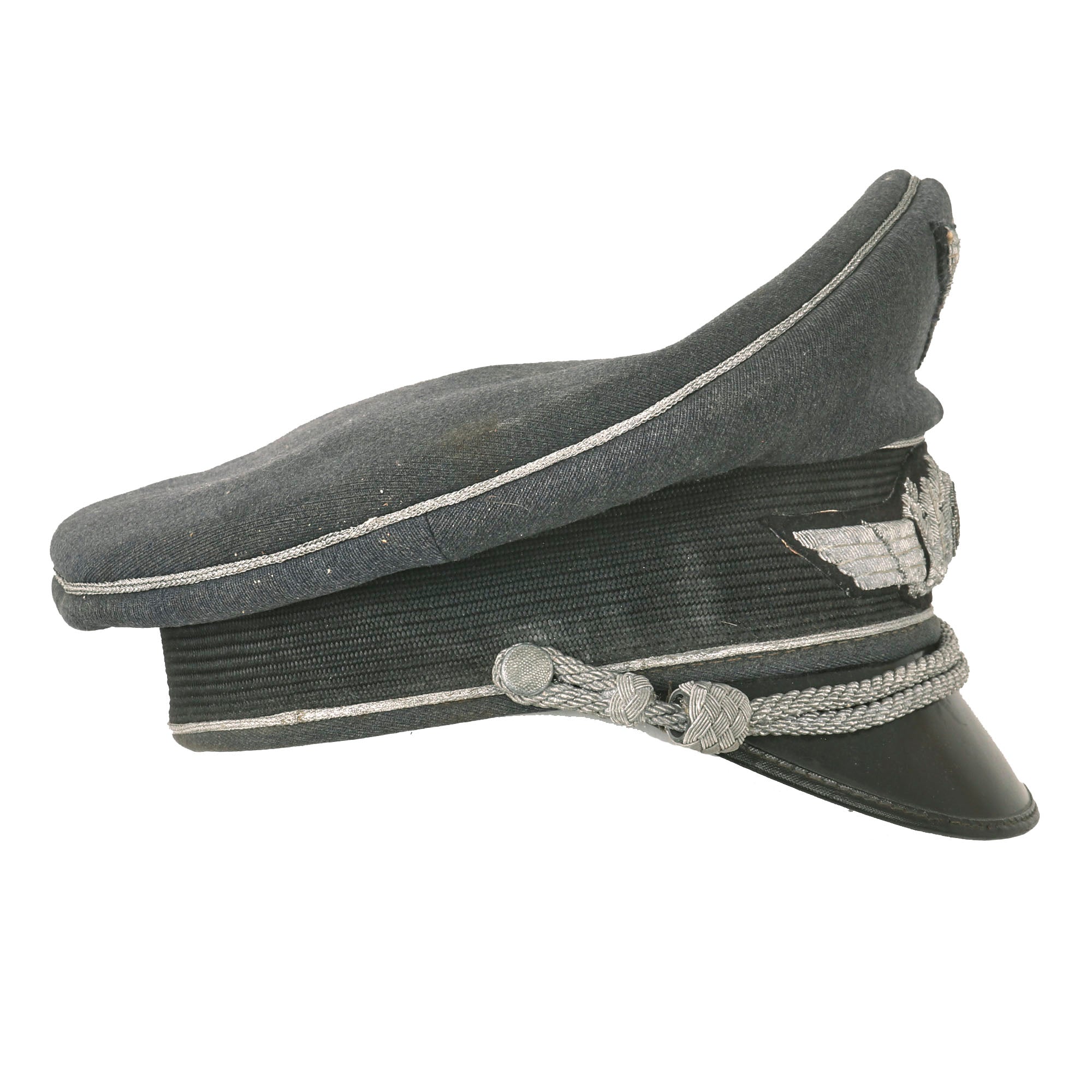 This Officer's Schirmmütze Visor Cap is a very high quality manufactured example. Fabricated in Luftwaffe blue gray Fliegerblau (Flier's Blue) "whipcord" weave wool gabardine, with a wide black ribbed wool cap band and three rows of fine silver bullion piping around the circumference. It is fronted by a heavy bullion embroidered Luftwaffe insignia pair that includes a silver bullion Luftwaffe eagle on blue gray wool backing above a high relief silver bullion oak leaf wreath with stylized wings and a woven tri color cockade. The insignia are in very good condition, with the bullion well retained, and showing very little in the way of oxidation. Really a great set of hand embroidered insignia.