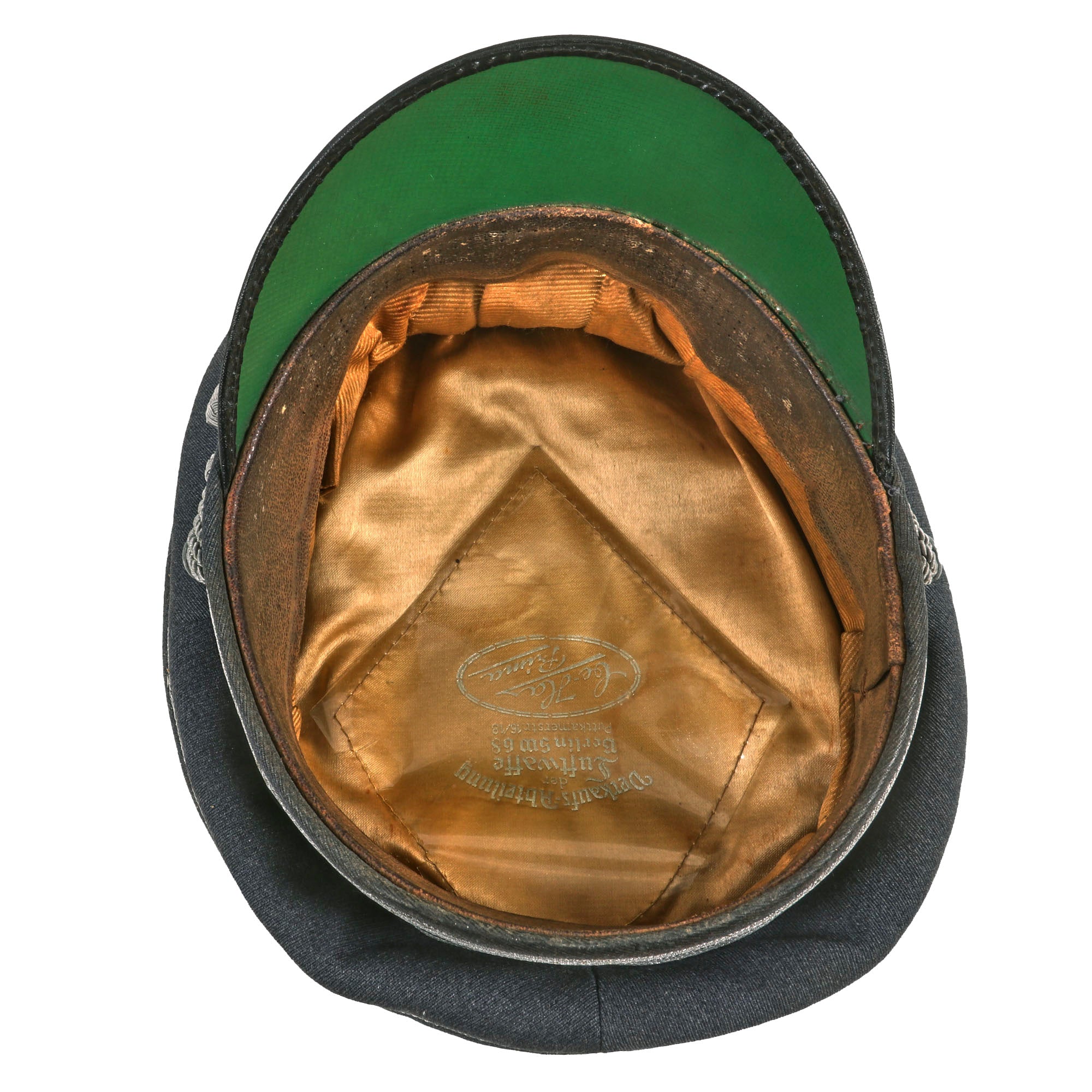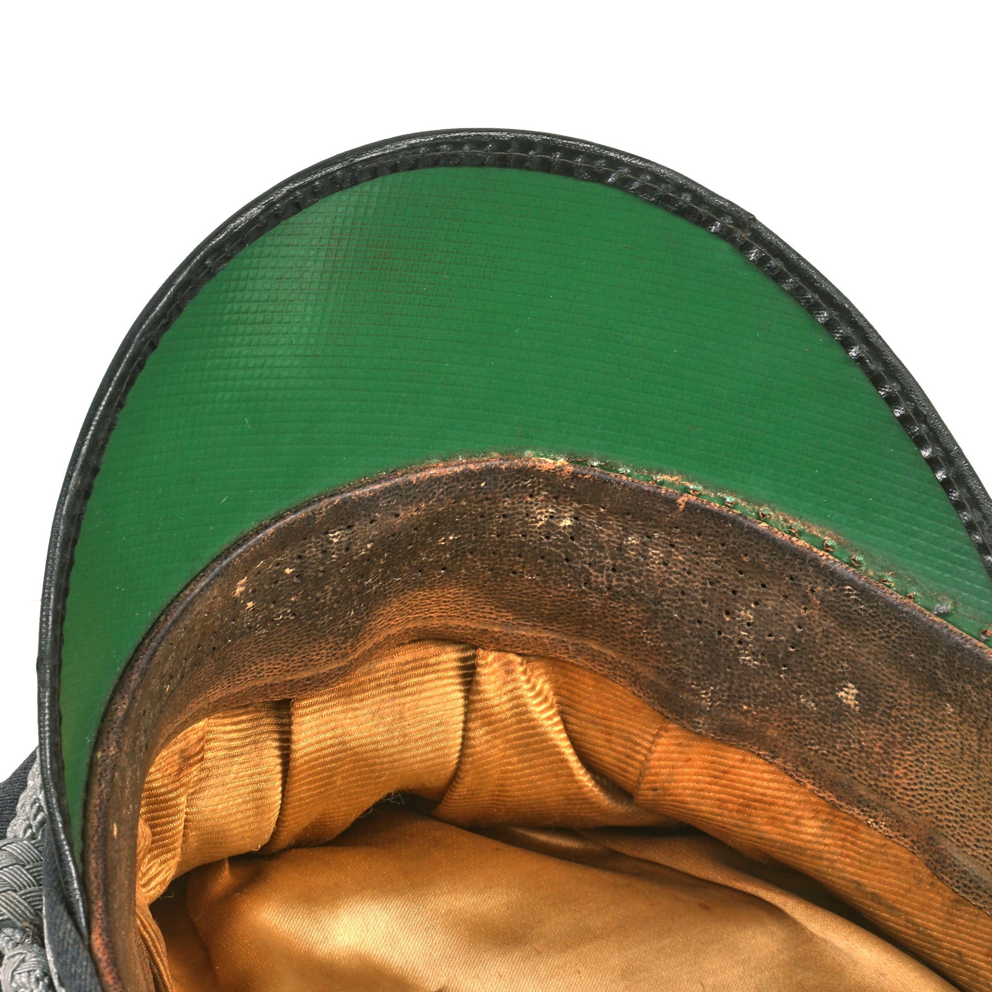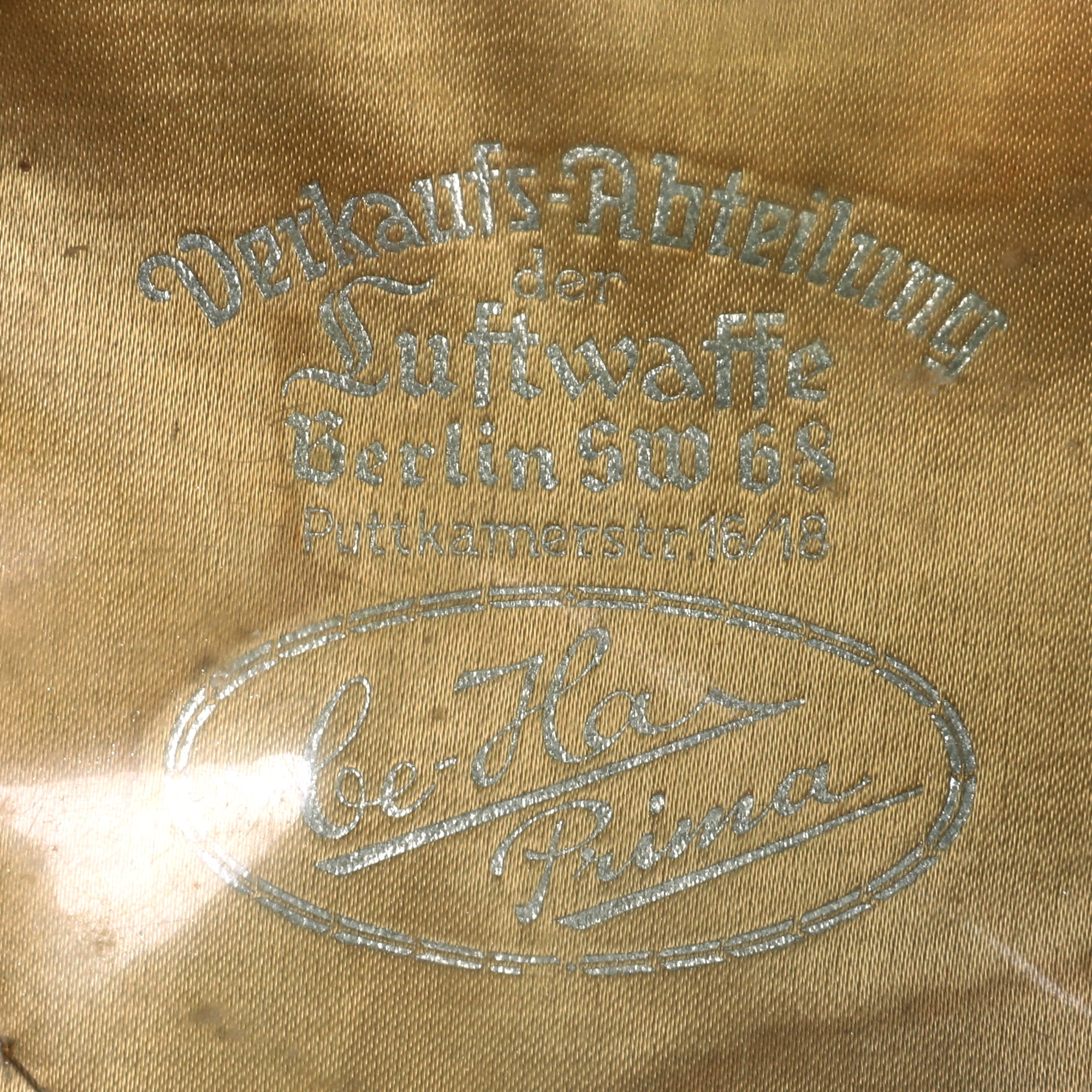 Original Item: Only One Available. This is a lovely Luftwaffe Officer's Schirmmütze Visor Cap, with great early pattern bullion embroidered insignia. It shows signs of moderate use in service, but no abuse, giving it a fantastic aged look. A wonderful honest example with a fantastic "Crushed" or "saddle-form" shape that is highly desirable, accomplished by removing the crown support stiffener ring. This example was produced by the desirable Ce-Ha Prima brand, which was a name Carl Halfar made high end officer caps under during the war. The cap is roughly size 7 or slightly larger.