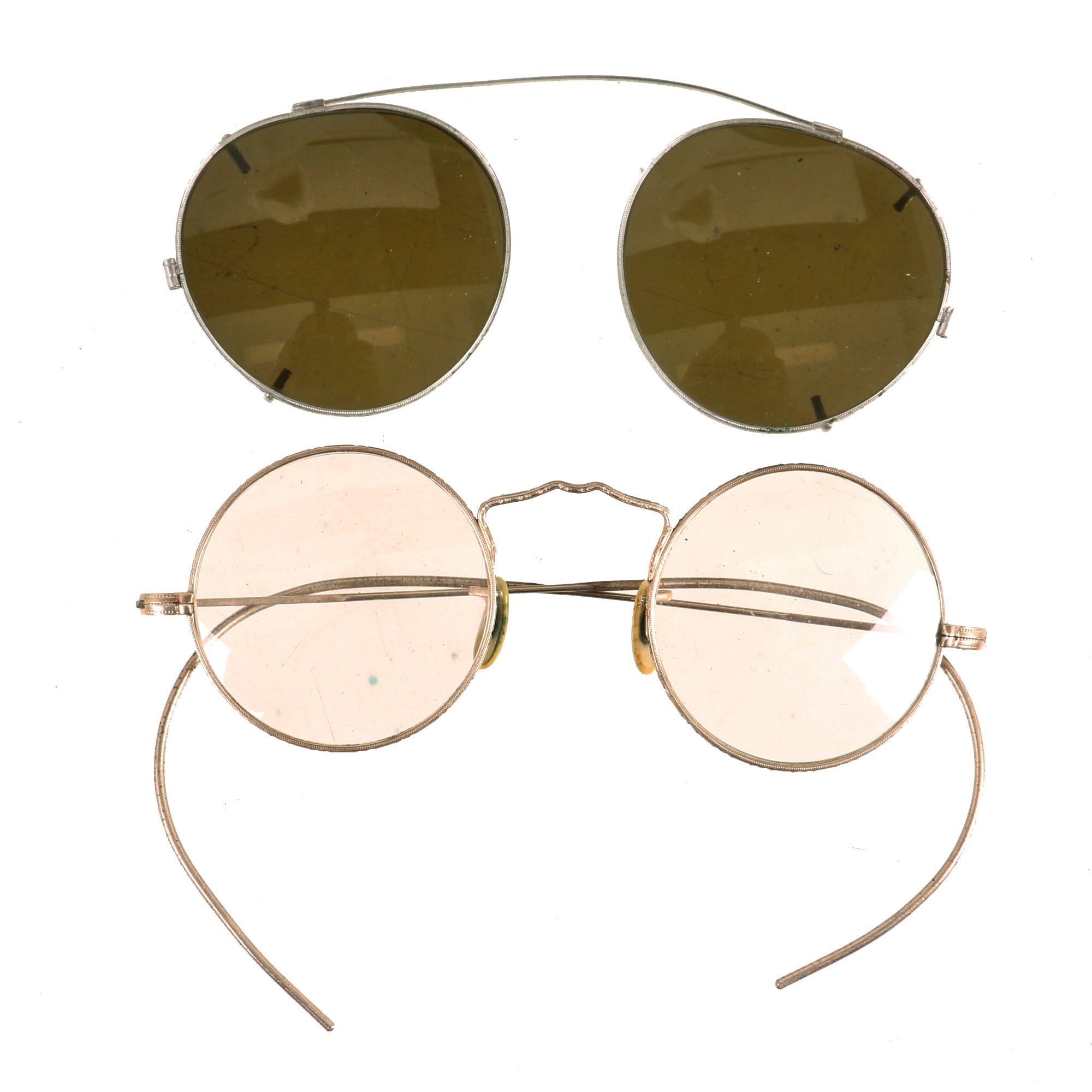 The included wire frame glasses are very nice, and marked AAA1 1/10 12K on the bottom of both temples near the hinges. They definitely look to be WW2 period, and they come with a great set of clip on tinted sun shields, which look lovely.