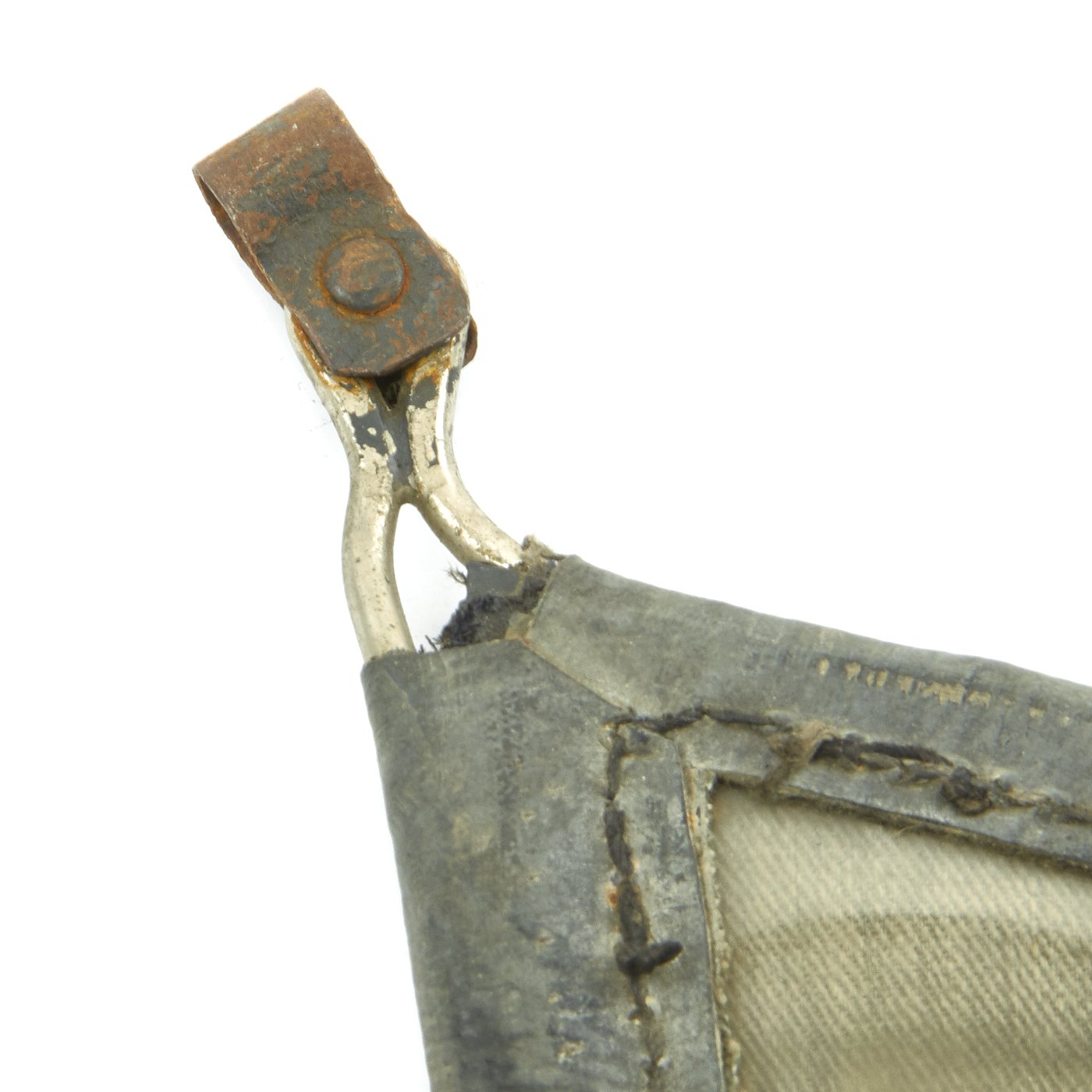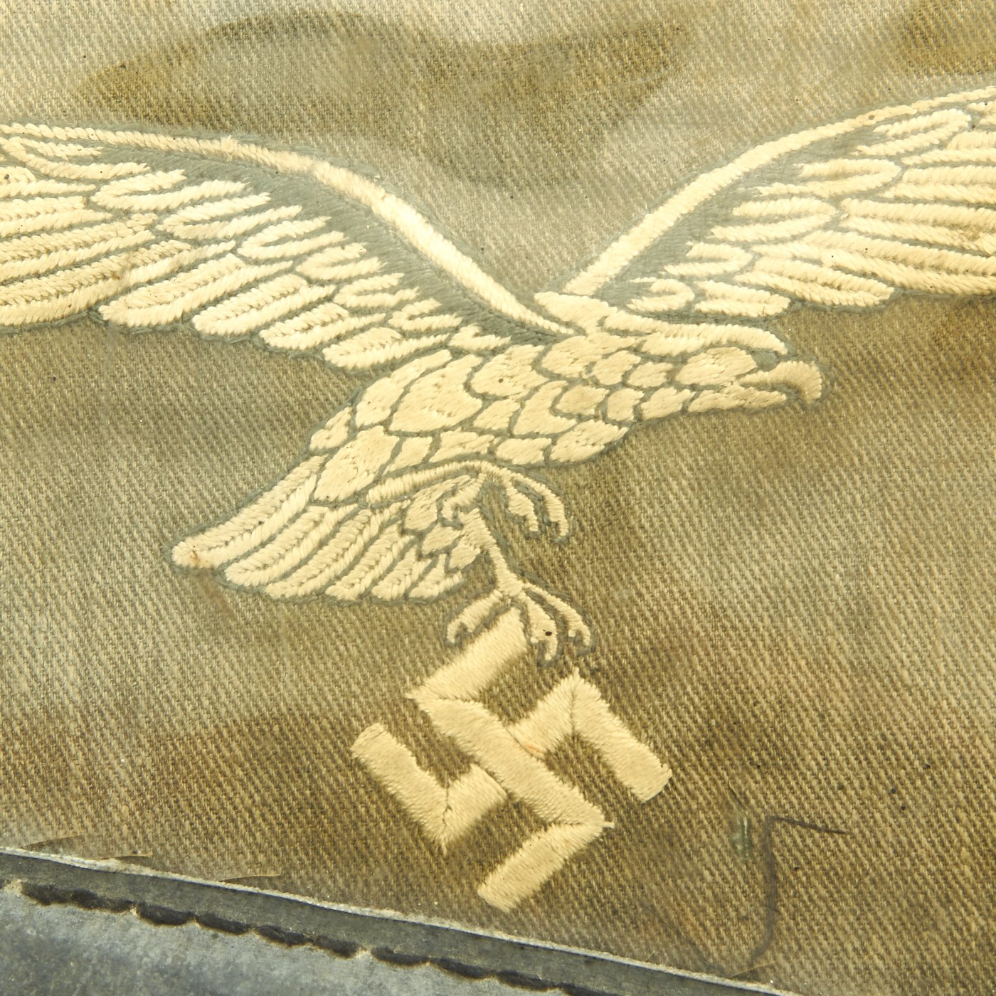 The pennant in frame measures 14 1/2 inches by 9 inches and is double sided. It is blue in color, with a heavy intricately embroidered Luftwaffe eagle. The celluloid has yellowed slightly, and the color on the pennant is slightly faded, but this is entirely typical given the age.