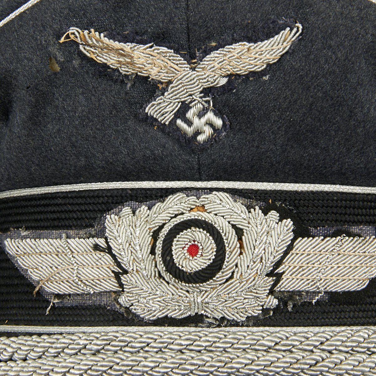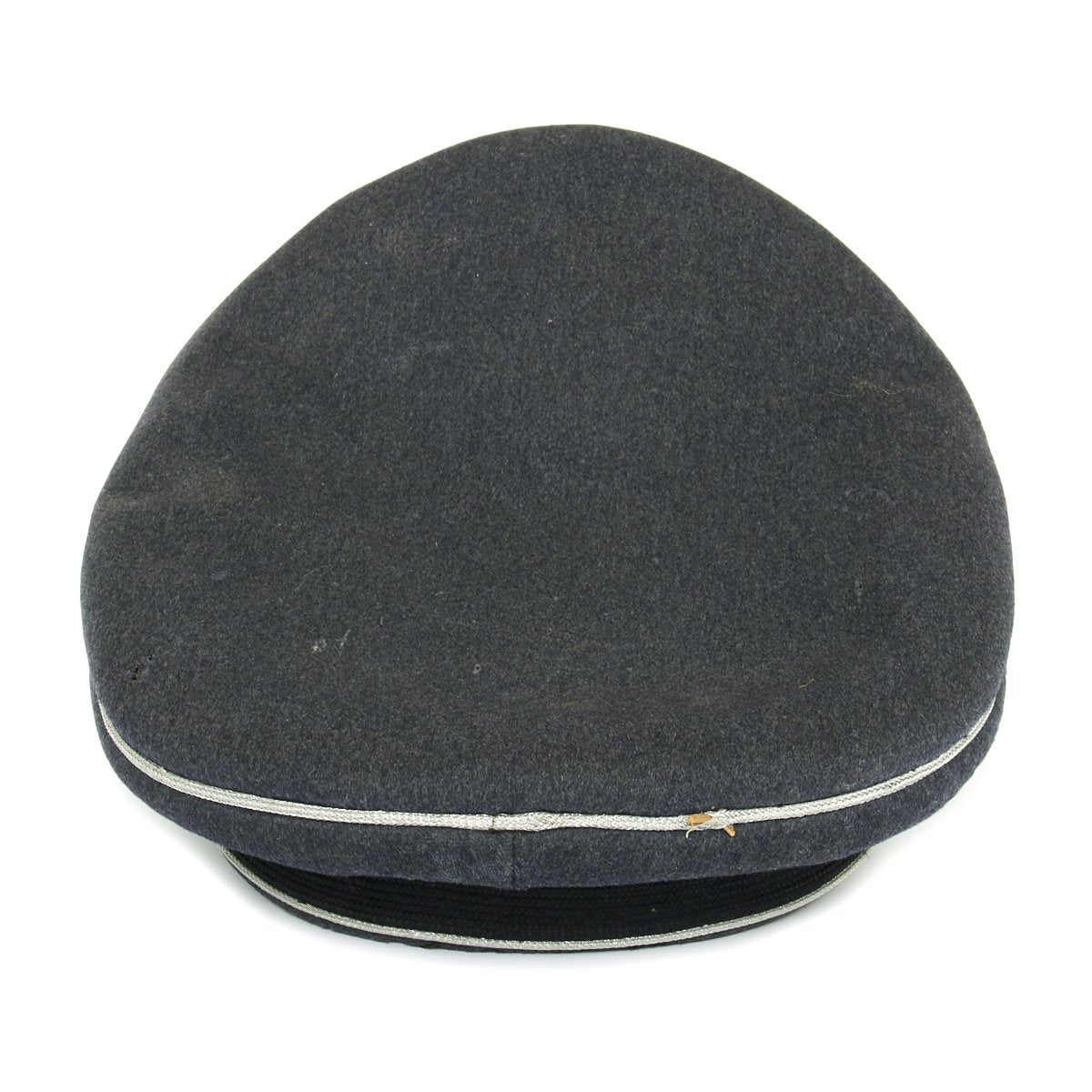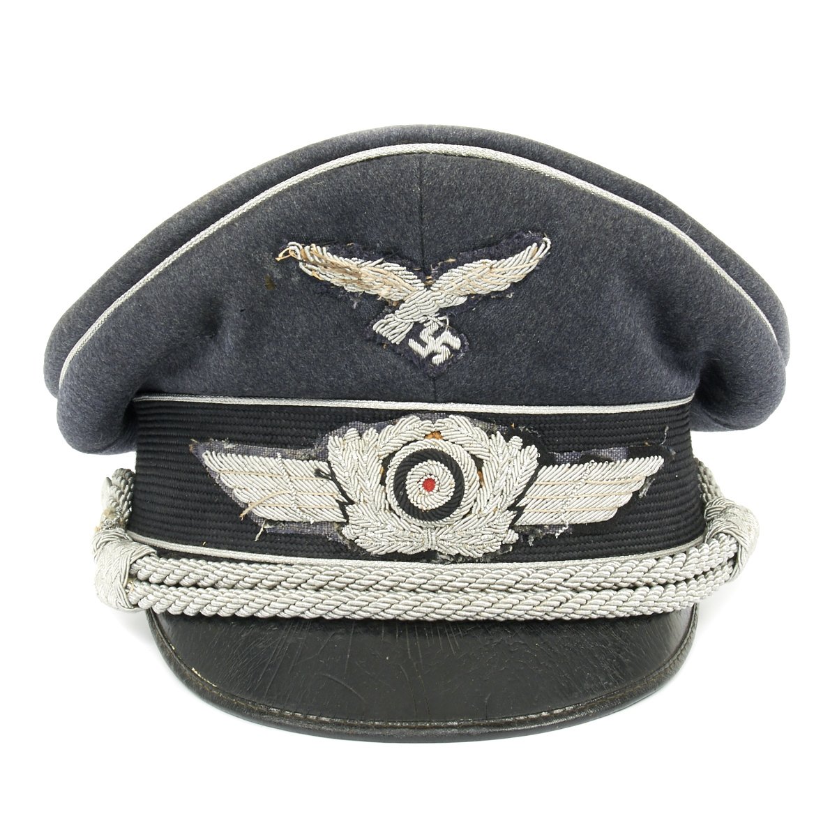This EREL Officer's Schirmmütze Visor Cap was a very high quality manufactured visor. Fabricated in Luftwaffe blue gray Fliegerblau (Flier's Blue) wool, with wide black ribbed rayon cap band, plus three rows of fine silver bullion piping around the circumference. Fronted by a heavy bullion embroidered Luftwaffe insignia pair that includes a silver bullion national eagle on a wool backer above a high relief silver bullion oak leaf wreath with stylized wings and cockade.