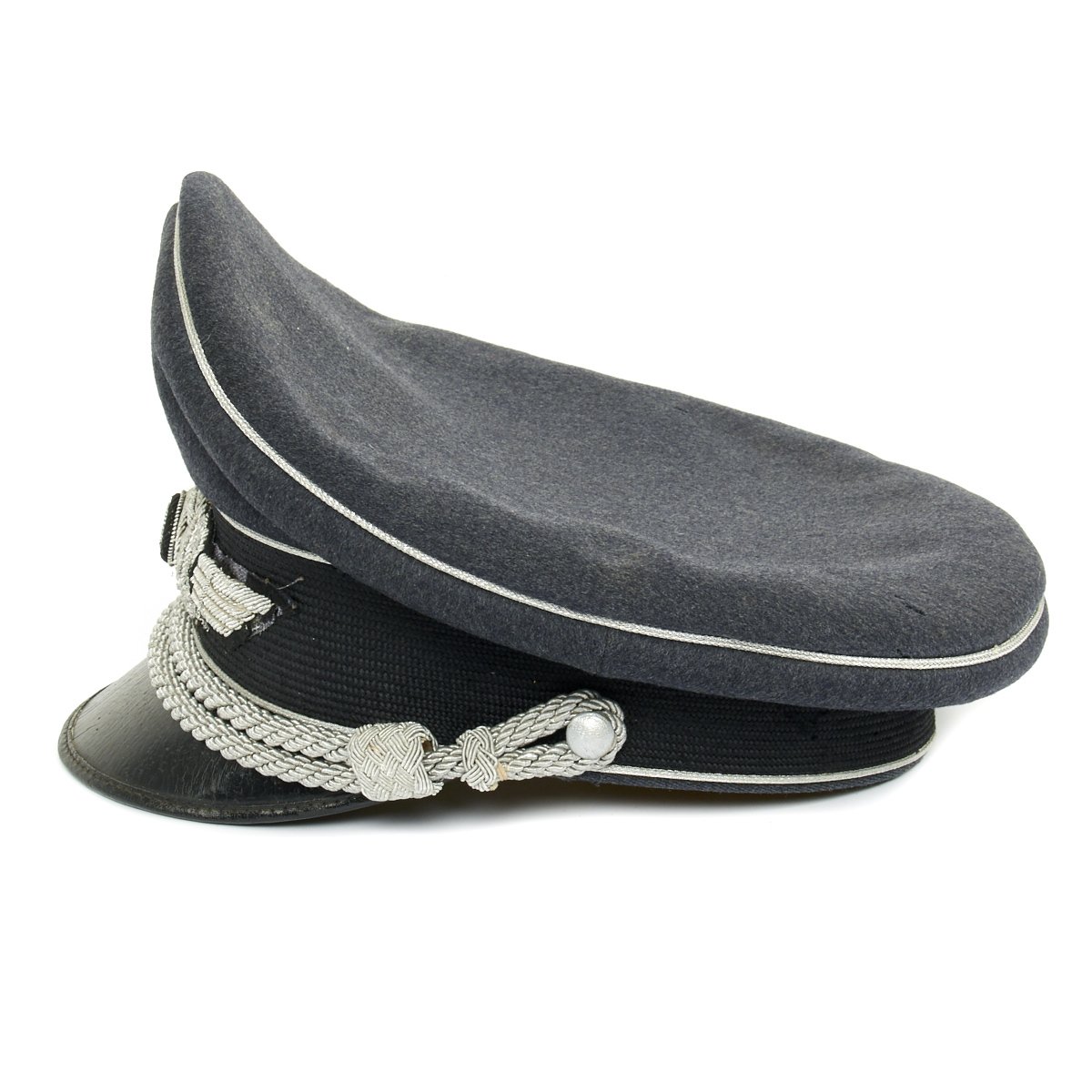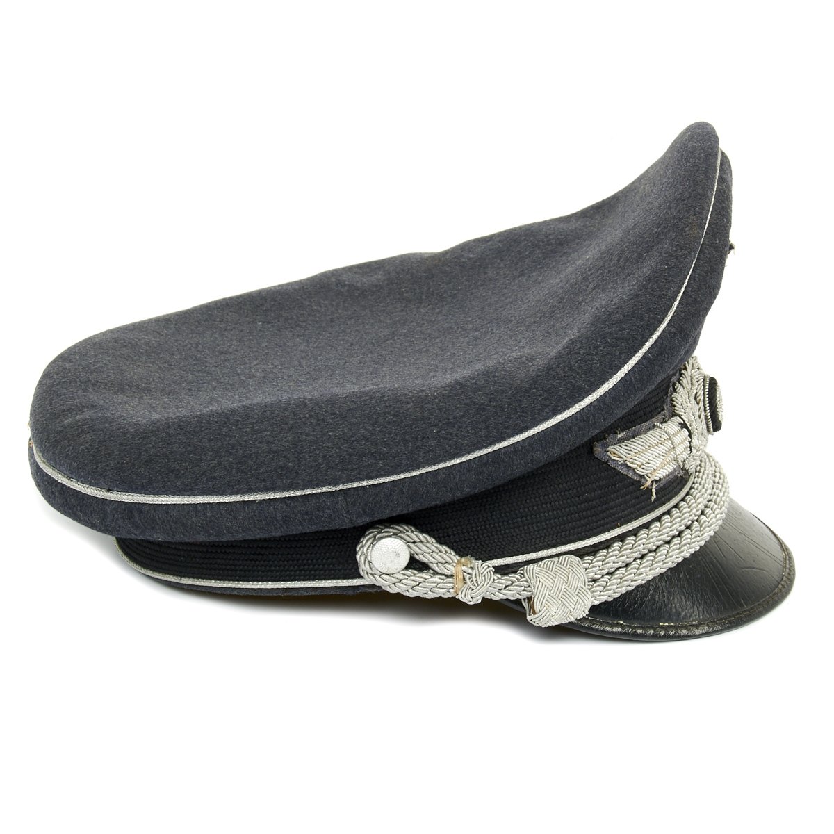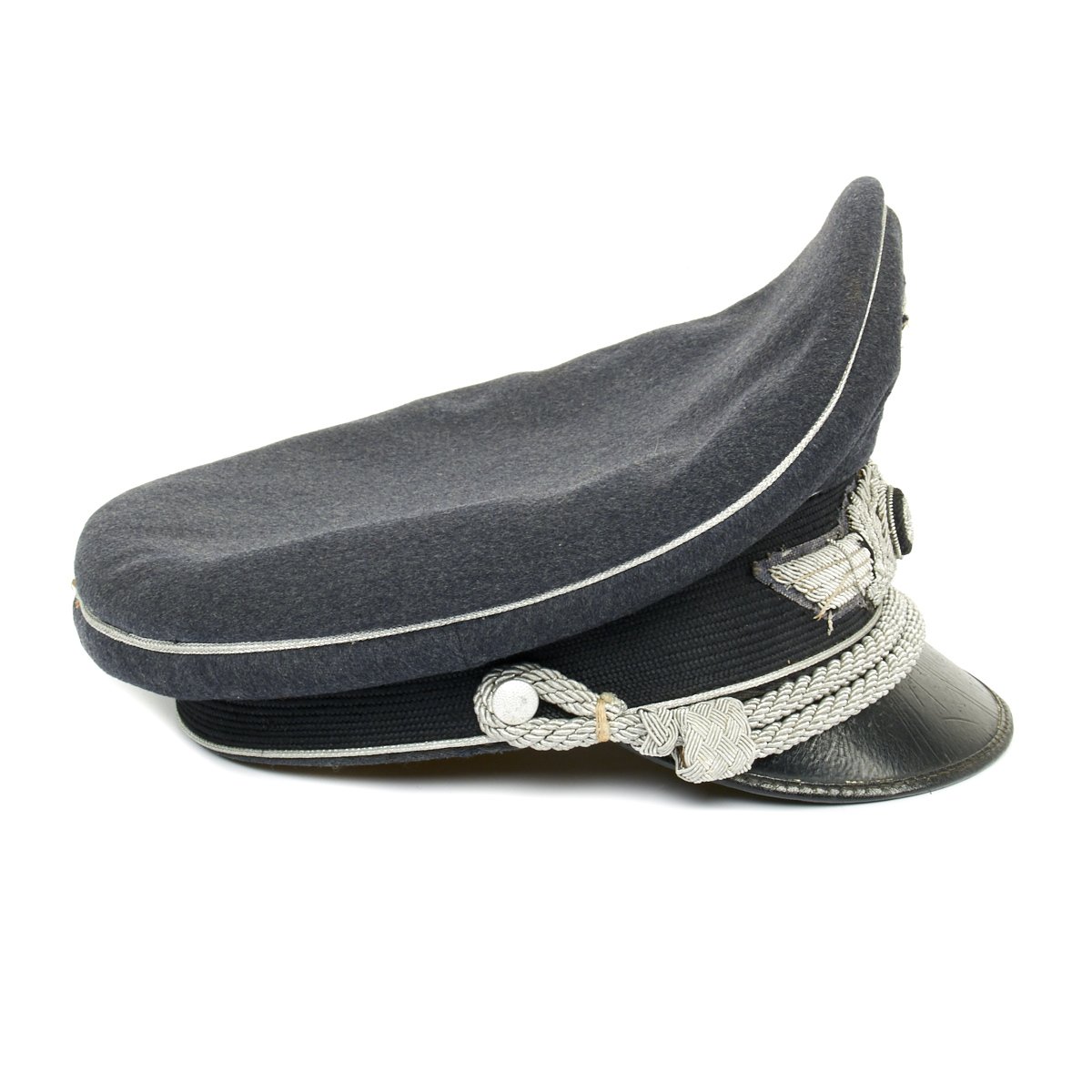 This EREL Officer's Schirmmütze Visor Cap was a very high quality manufactured visor. Fabricated in Luftwaffe blue gray Fliegerblau (Flier's Blue) wool, with wide black ribbed rayon cap band, plus three rows of fine silver bullion piping around the circumference. Fronted by a heavy bullion embroidered Luftwaffe insignia pair that includes a silver bullion national eagle on a wool backer above a high relief silver bullion oak leaf wreath with stylized wings and cockade.