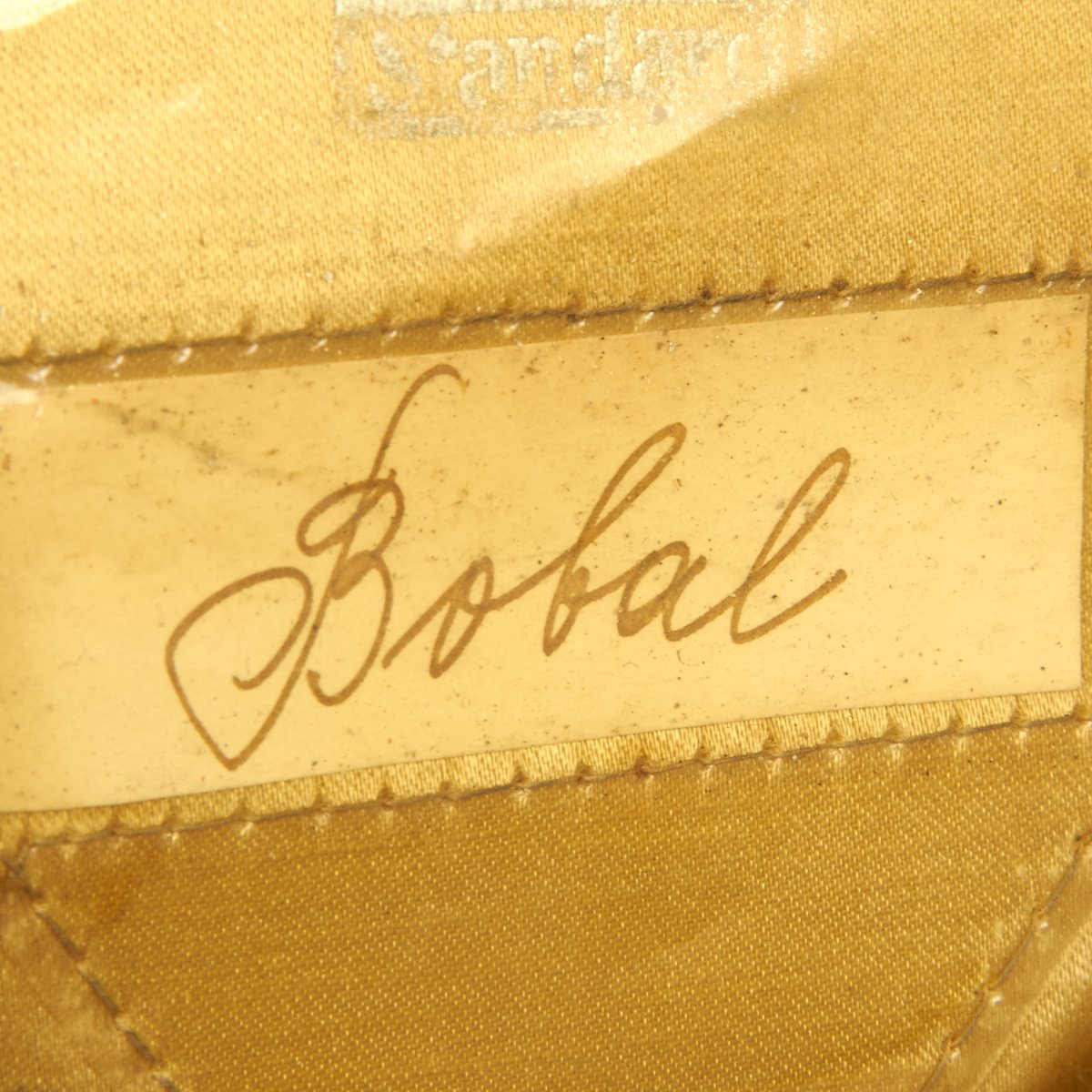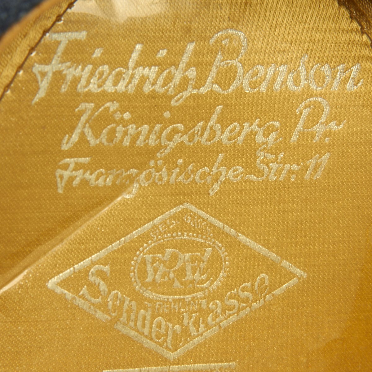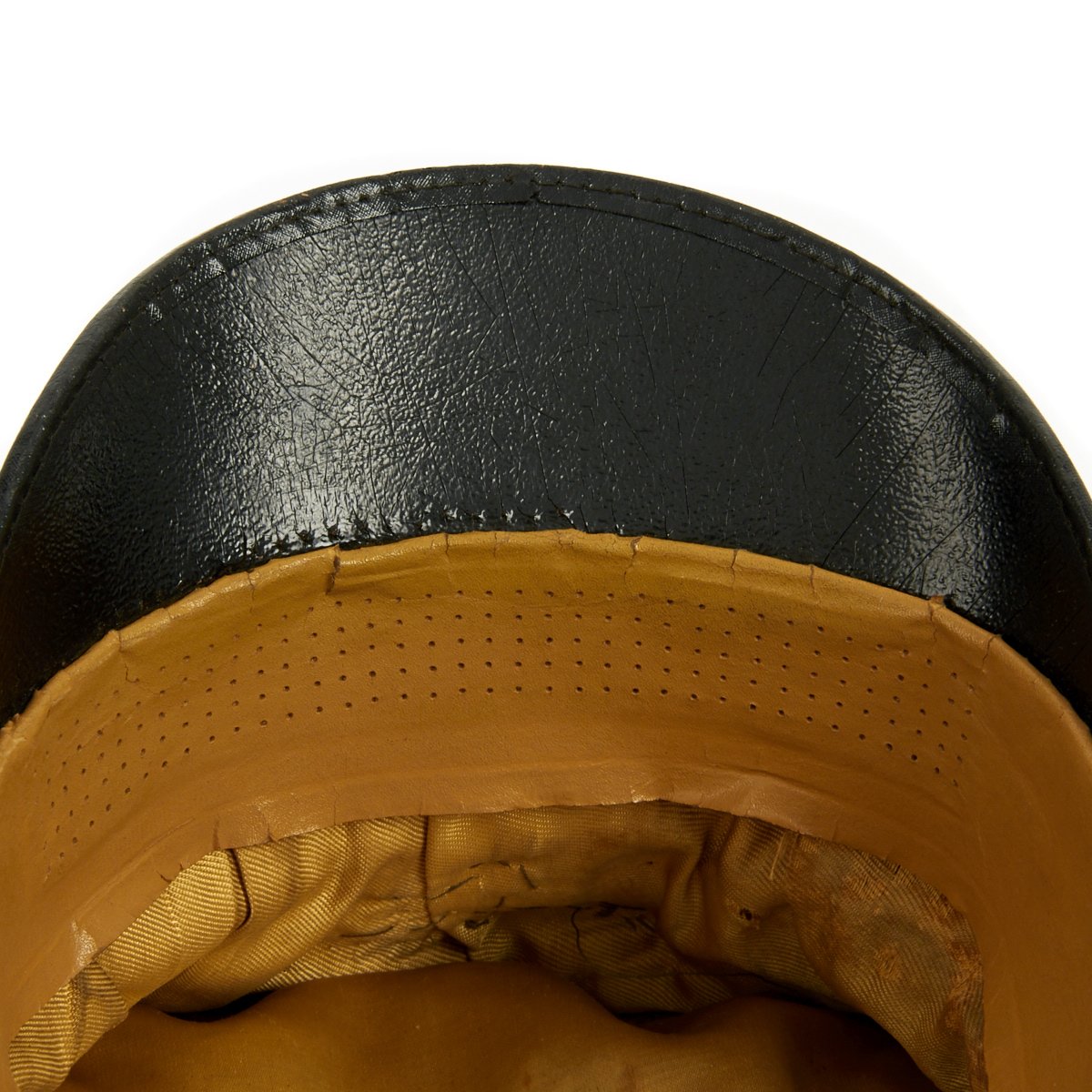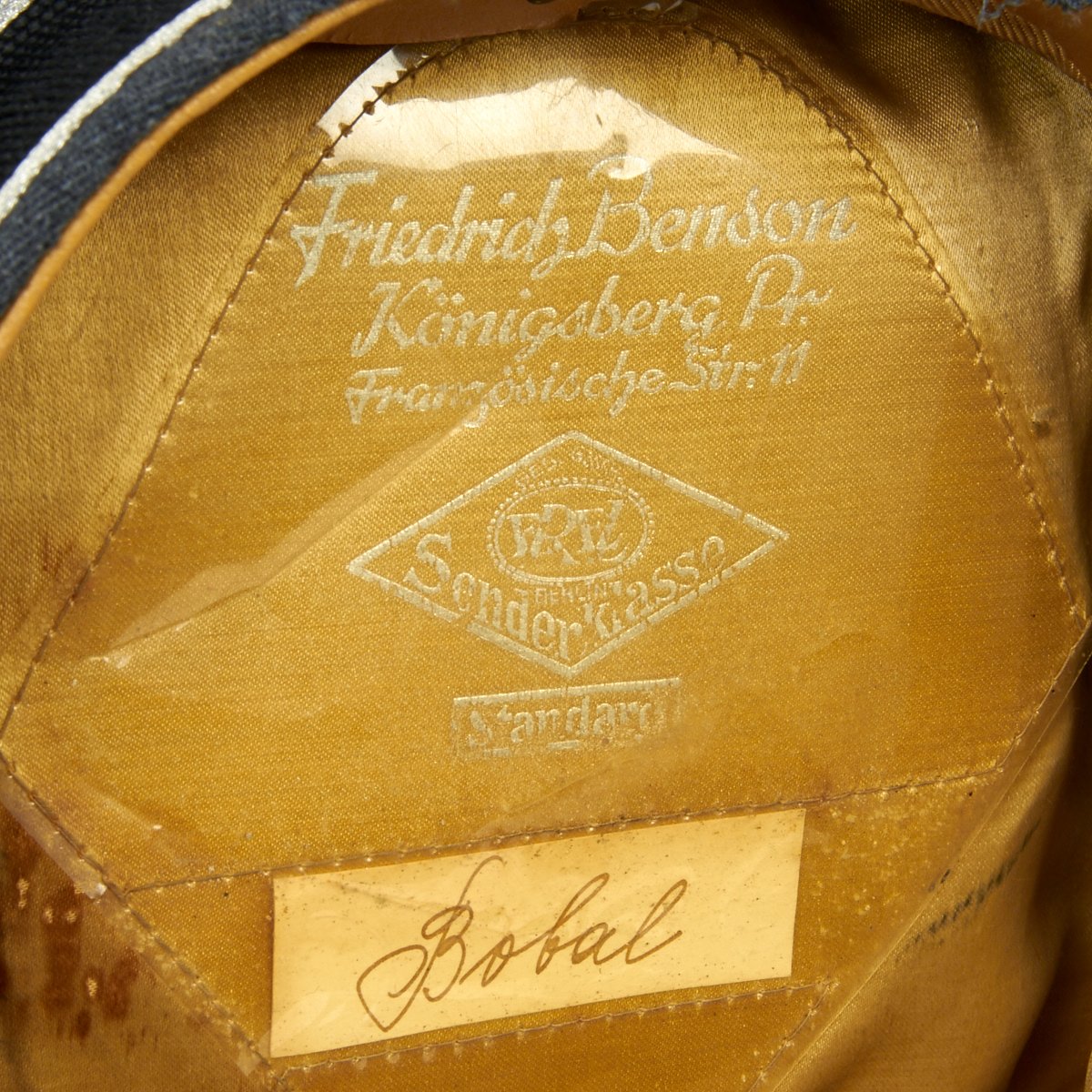 Front of visor is patent leather, finely stitched at the brim. The underside of the visor in black. The size 58 liner has the gold rayon interior with the celluloid moisture shield still intact. Original paper name tag is still in place and reads BOBAL. You can also see the bold gold eReL logo with retailer information for Friedrick Benson. This is a Sonderklasse model which was a high grade of eReL visor caps. The supple leather sweatband is complete and also in very good condition.