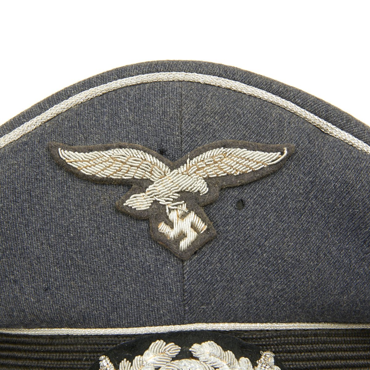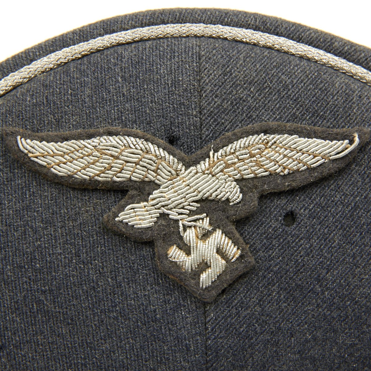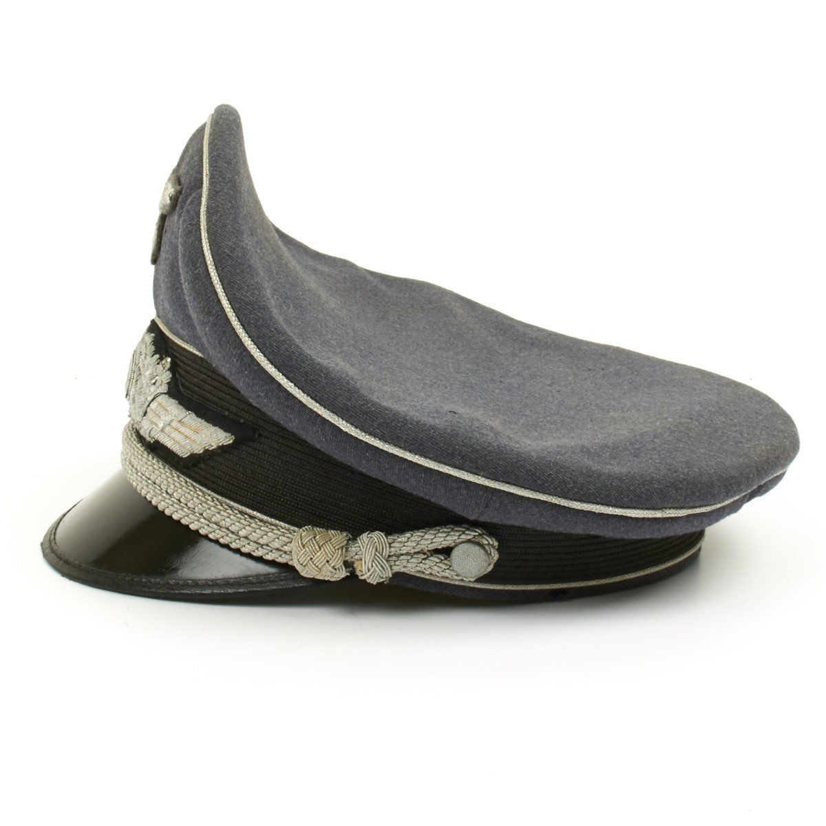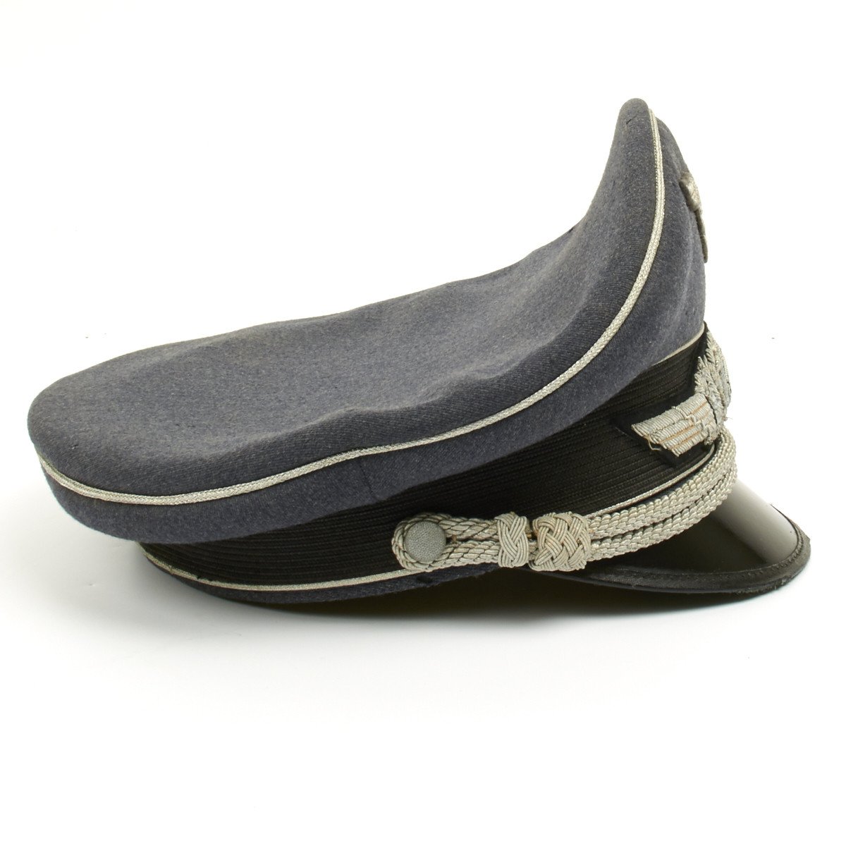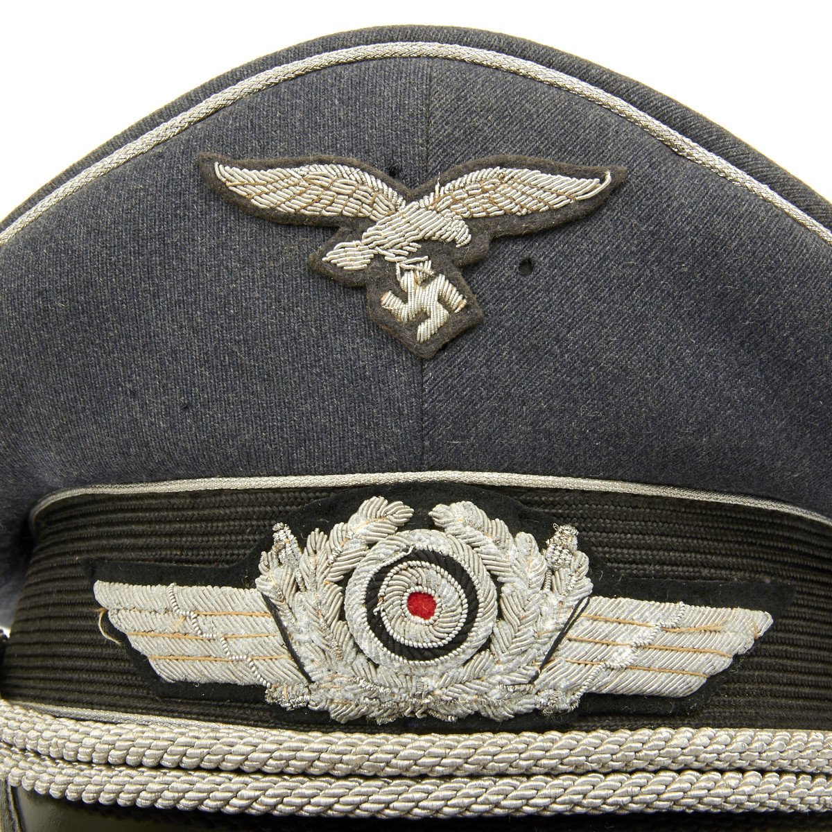 Original Item: Only One Available. This is a very good condition mid-war Luftwaffe Officer's Schirmmütze Visor Cap. This is a very high quality manufactured visor. Fabricated in Luftwaffe blue gray Fliegerblau (Flier's Blue) wool, with wide black ribbed rayon cap band, plus three rows of fine silver bullion piping around the circumference. Fronted by a Luftwaffe insignia pair that includes a silver bullion national eagle on a wool backer above a high relief silver bullion oak leaf wreath with stylized wings and cockade.